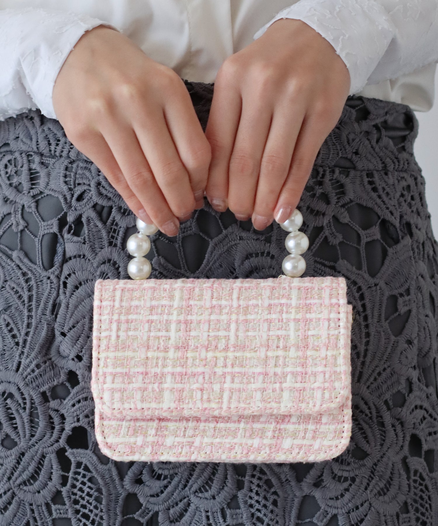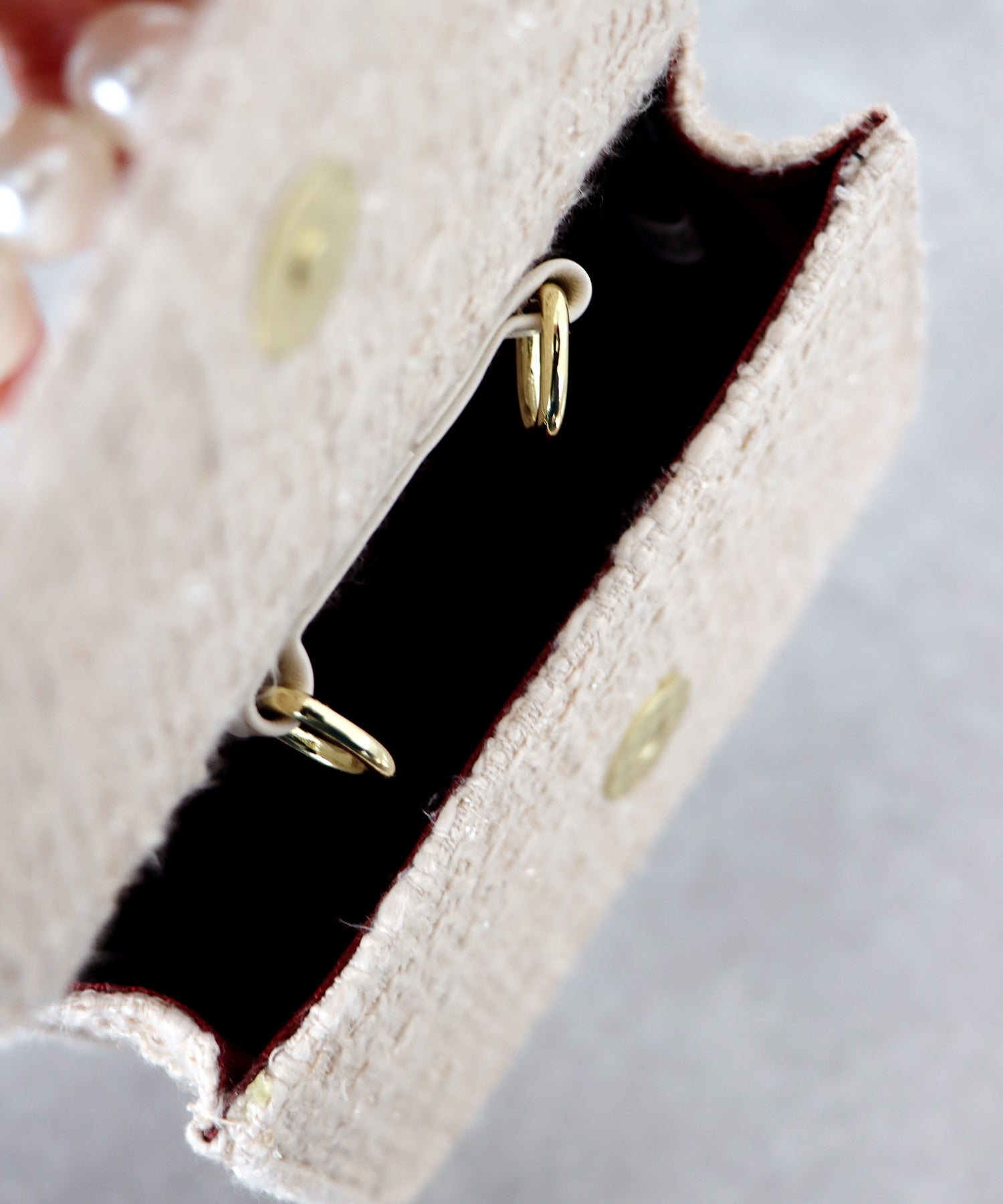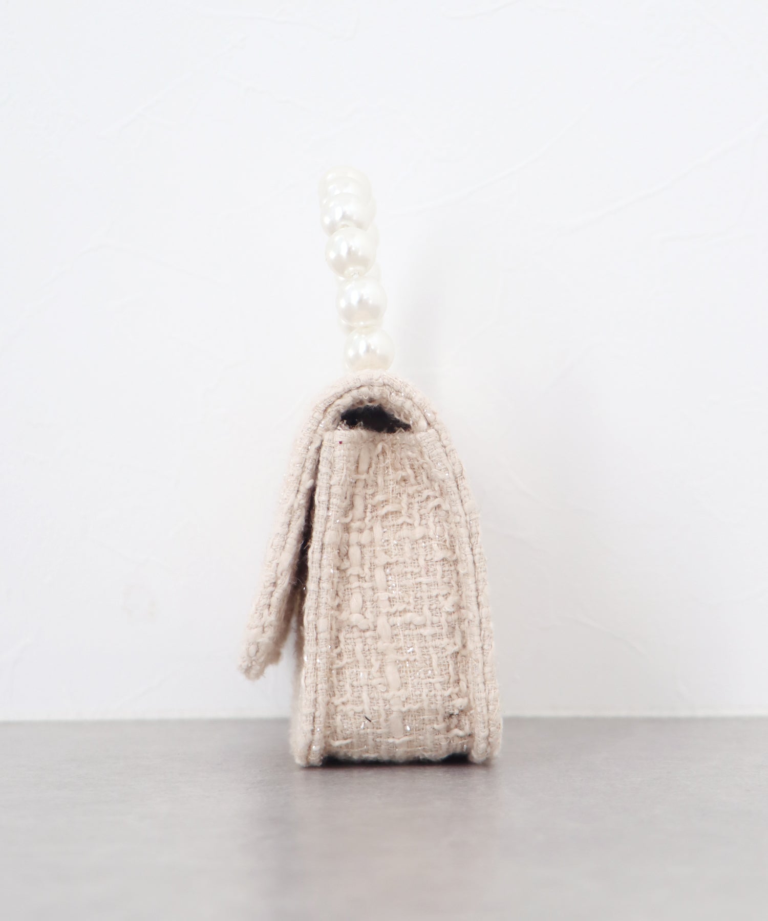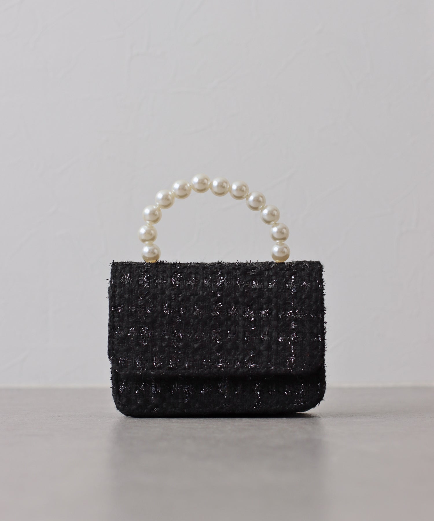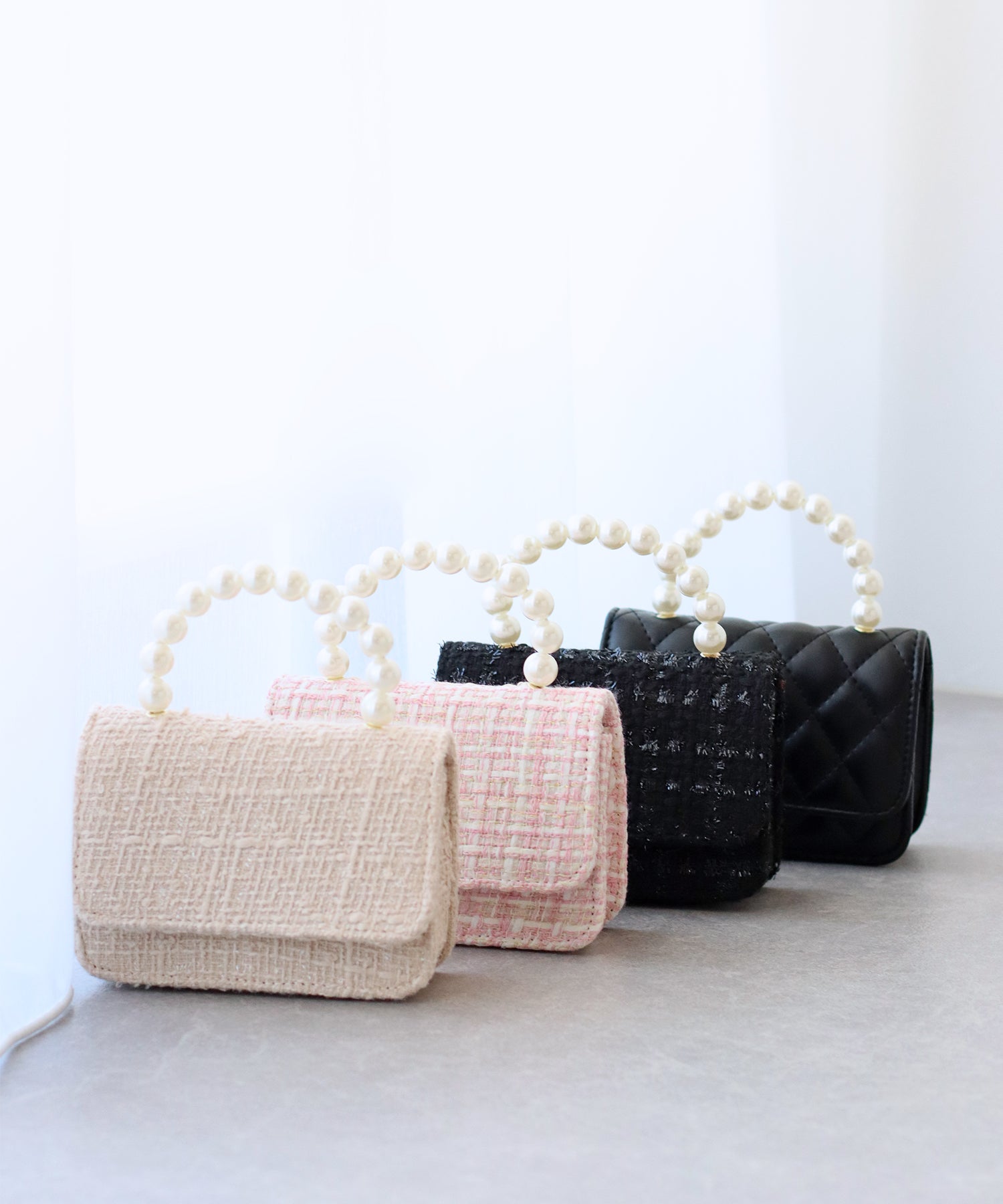 アクセサリー感覚で使える、パールハンドルのミニサイズバッグ ?POINT ころんとした小さめサイズが可愛い、ミニショルダーバッグ。 コンパクトなサイズ感なので、コーデのアクセントとしてななめ掛けでアクセサリーのように使用していただくのが◎ マットなフェイクレザーとツイードが上品で、華やかなパールがパーティードレスにも馴染むので 結婚式やパーティー、成人式、お食事会などのオケージョンシーンにもおすすめです。
