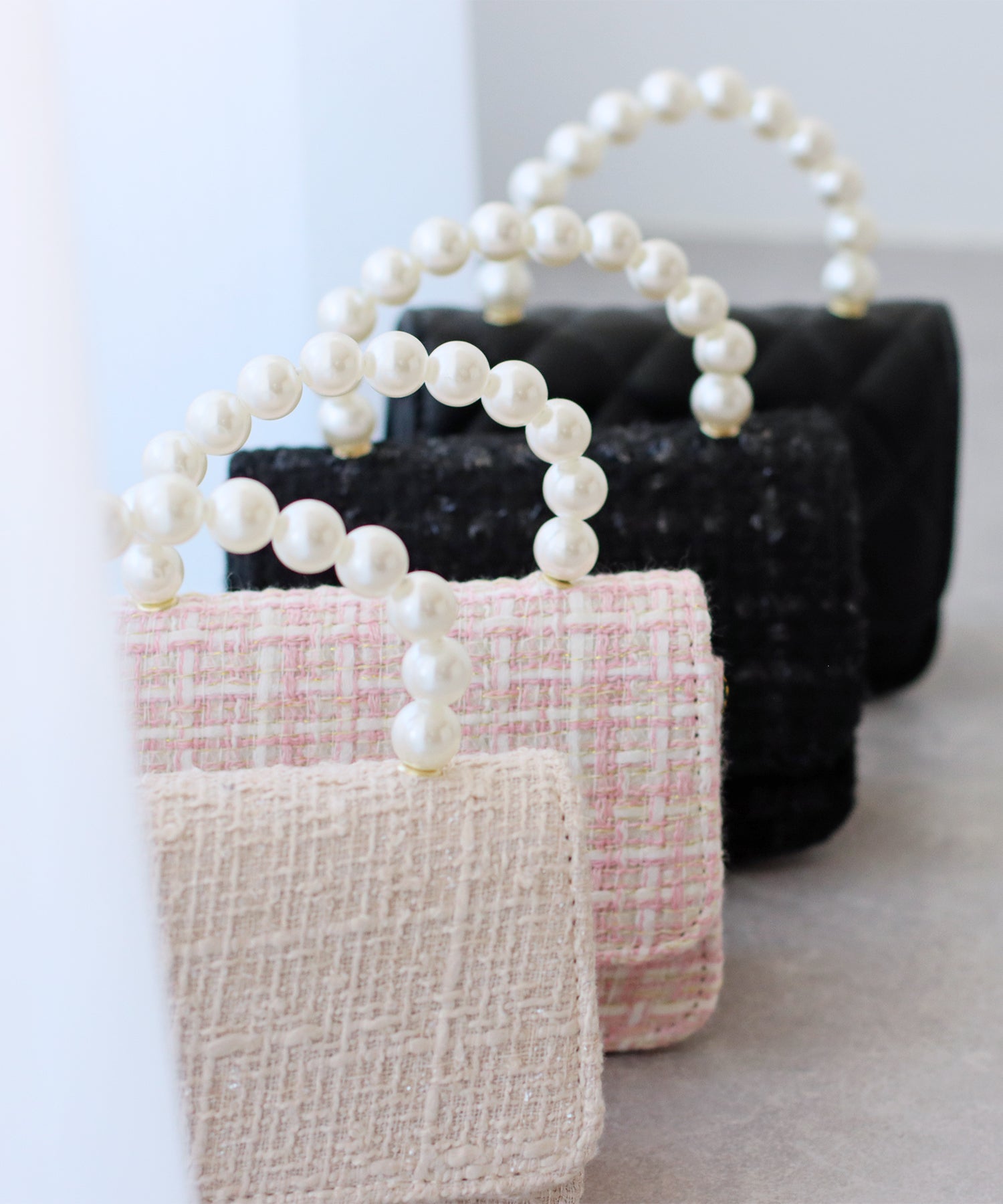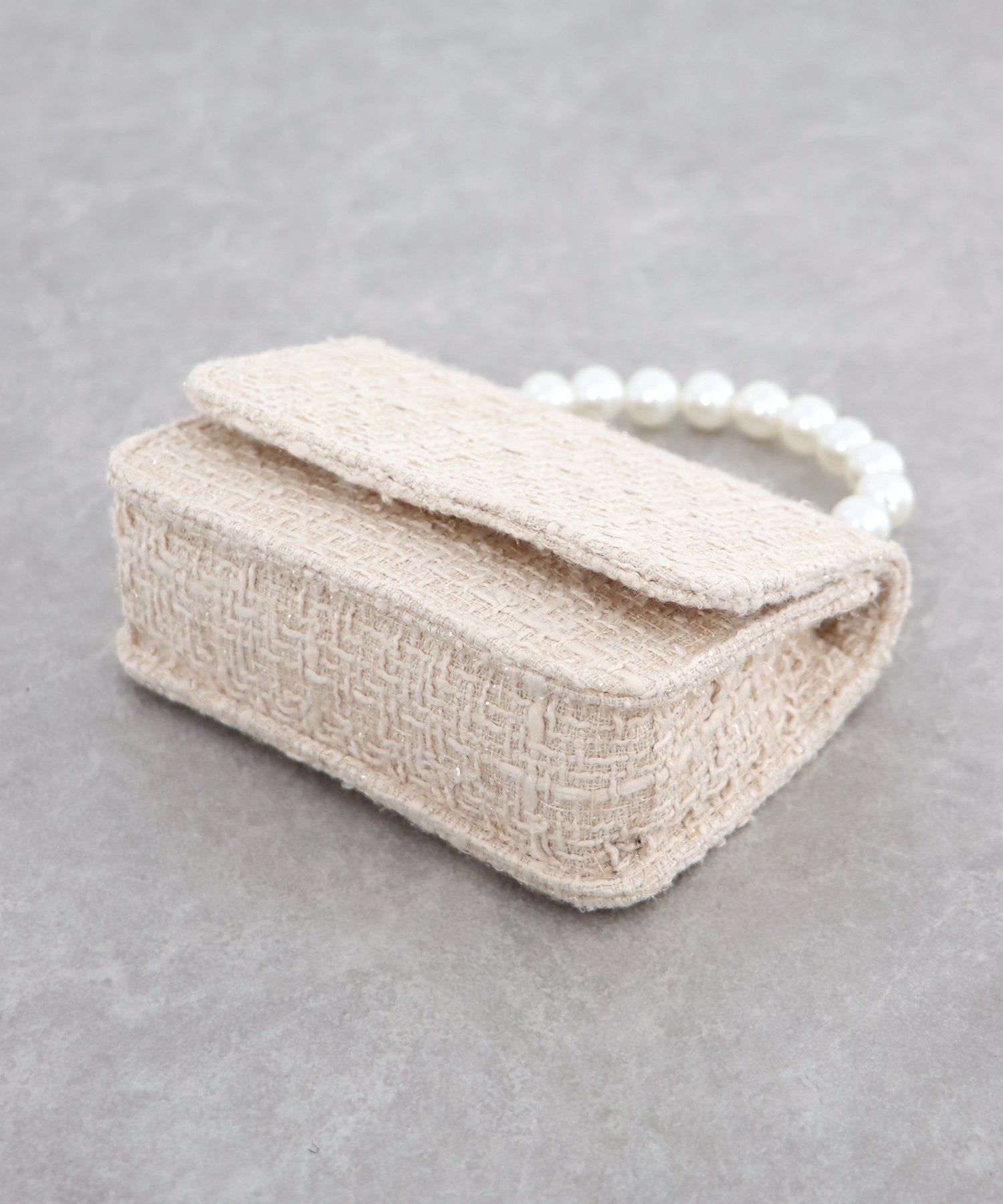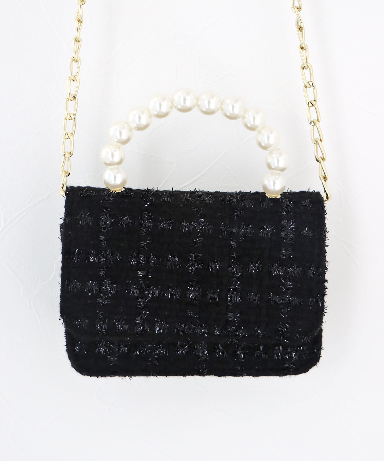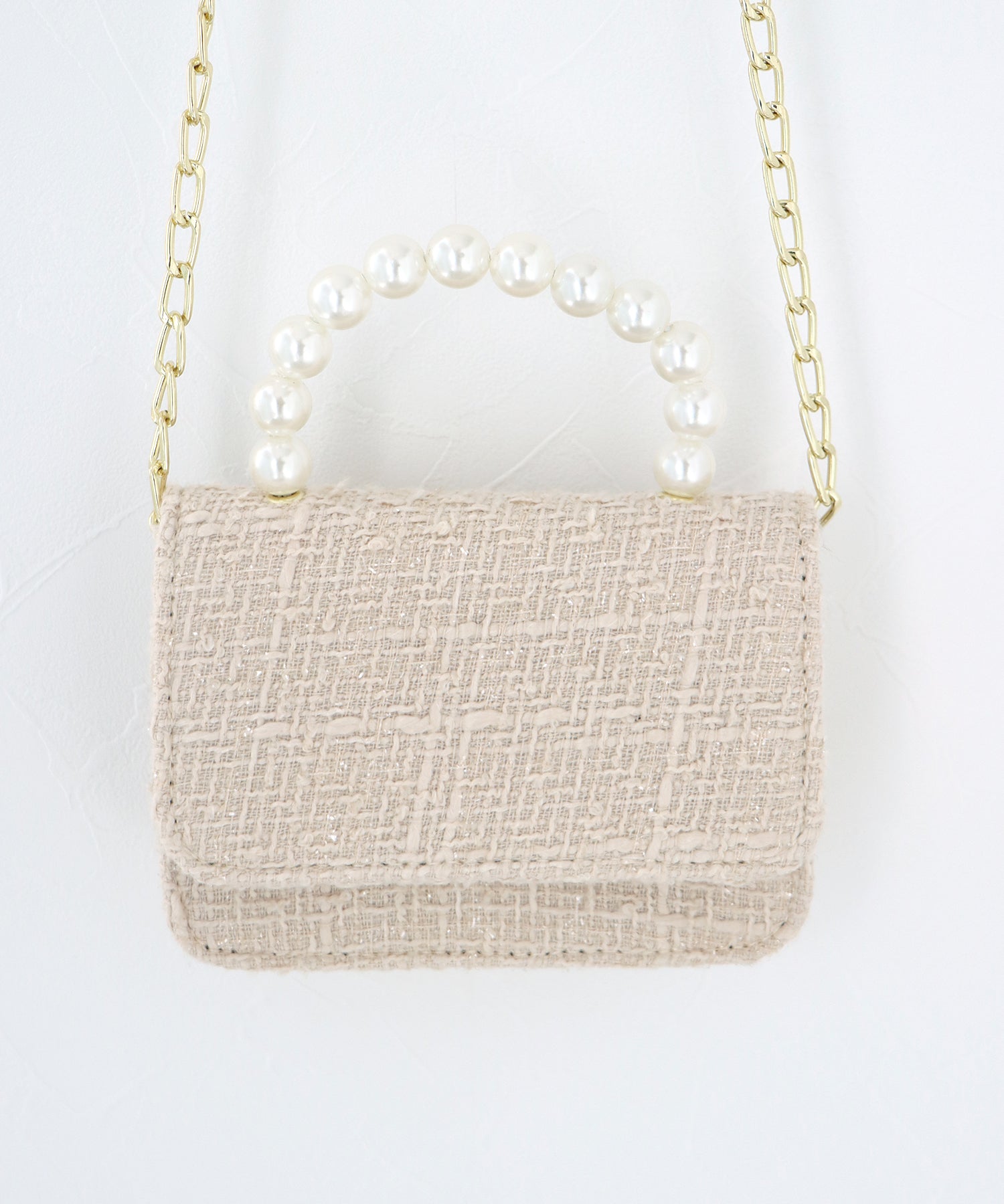アクセサリー感覚で使える、パールハンドルのミニサイズバッグ ?POINT ころんとした小さめサイズが可愛い、ミニショルダーバッグ。 コンパクトなサイズ感なので、コーデのアクセントとしてななめ掛けでアクセサリーのように使用していただくのが◎ マットなフェイクレザーとツイードが上品で、華やかなパールがパーティードレスにも馴染むので 結婚式やパーティー、成人式、お食事会などのオケージョンシーンにもおすすめです。