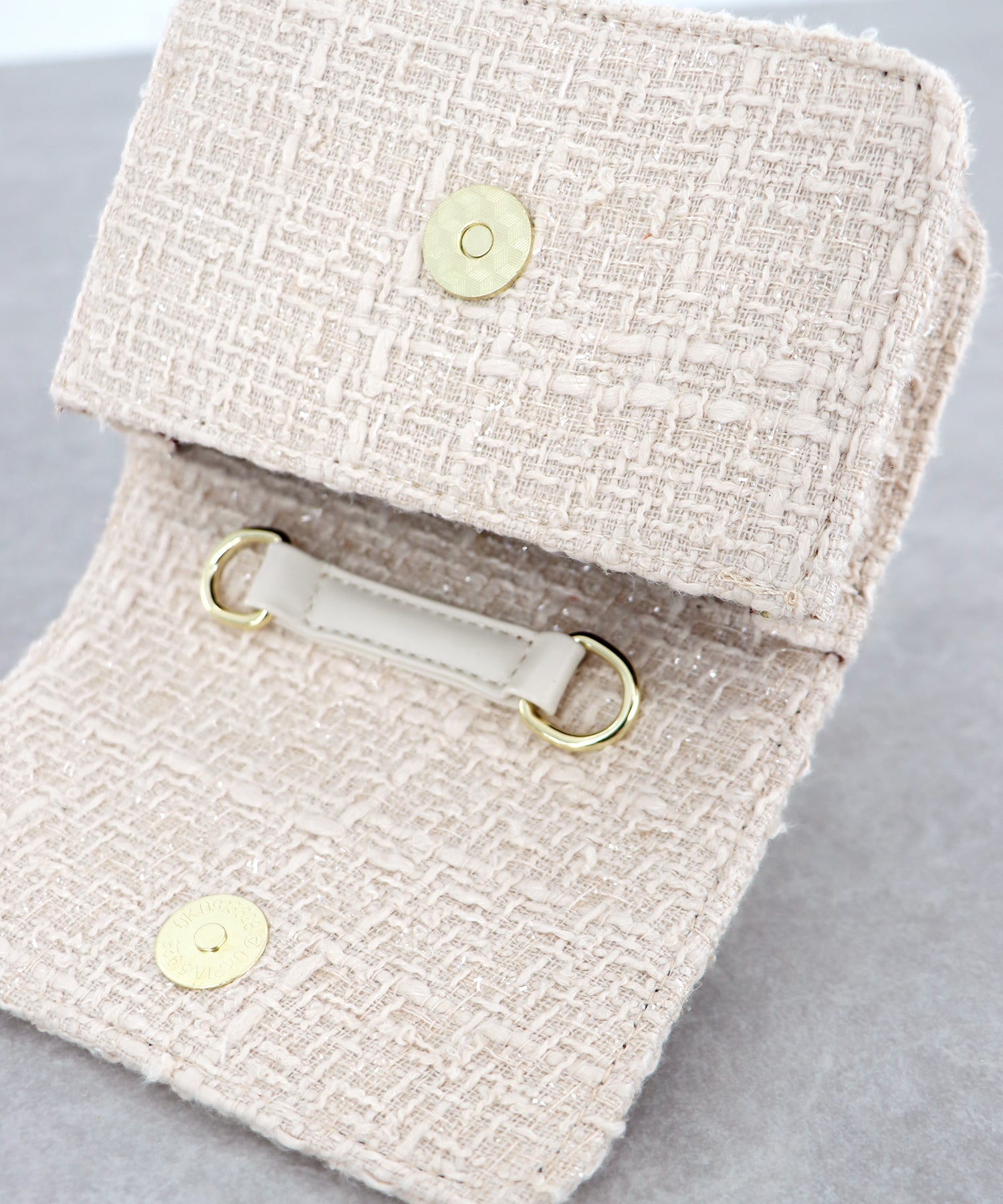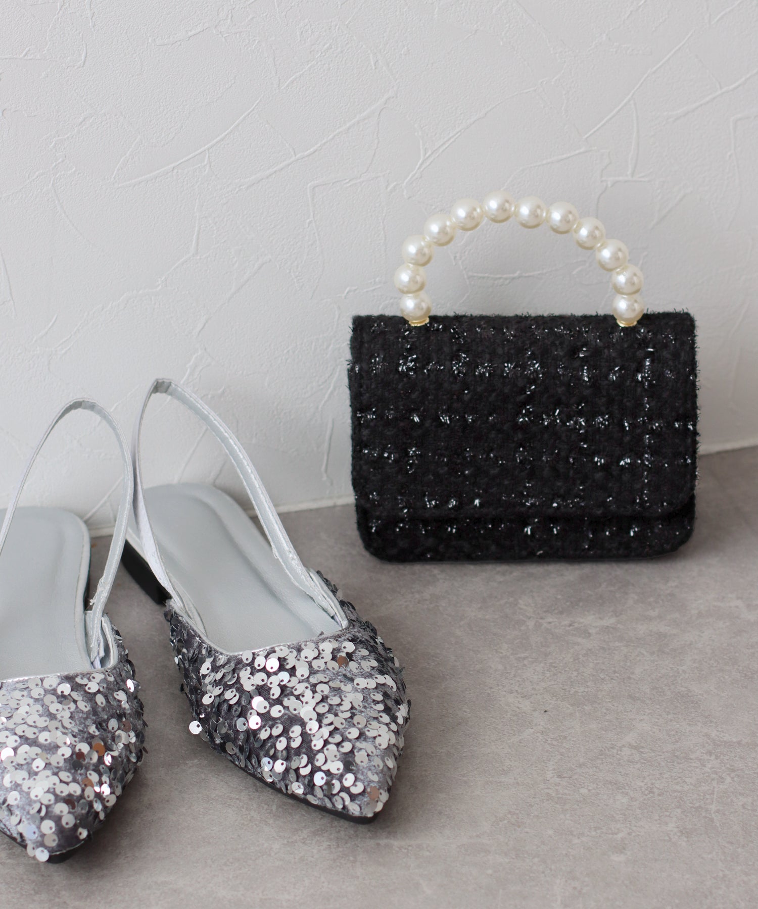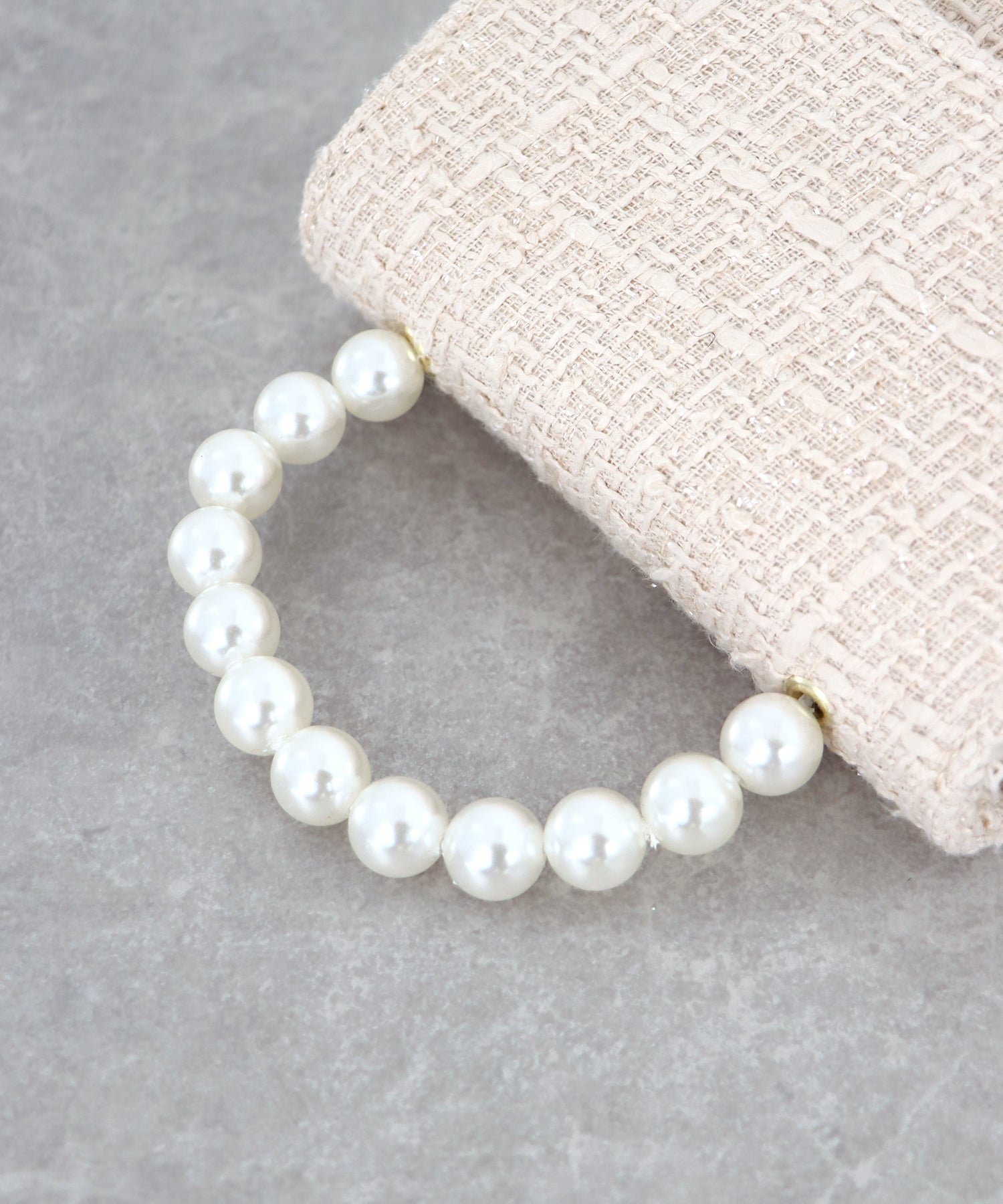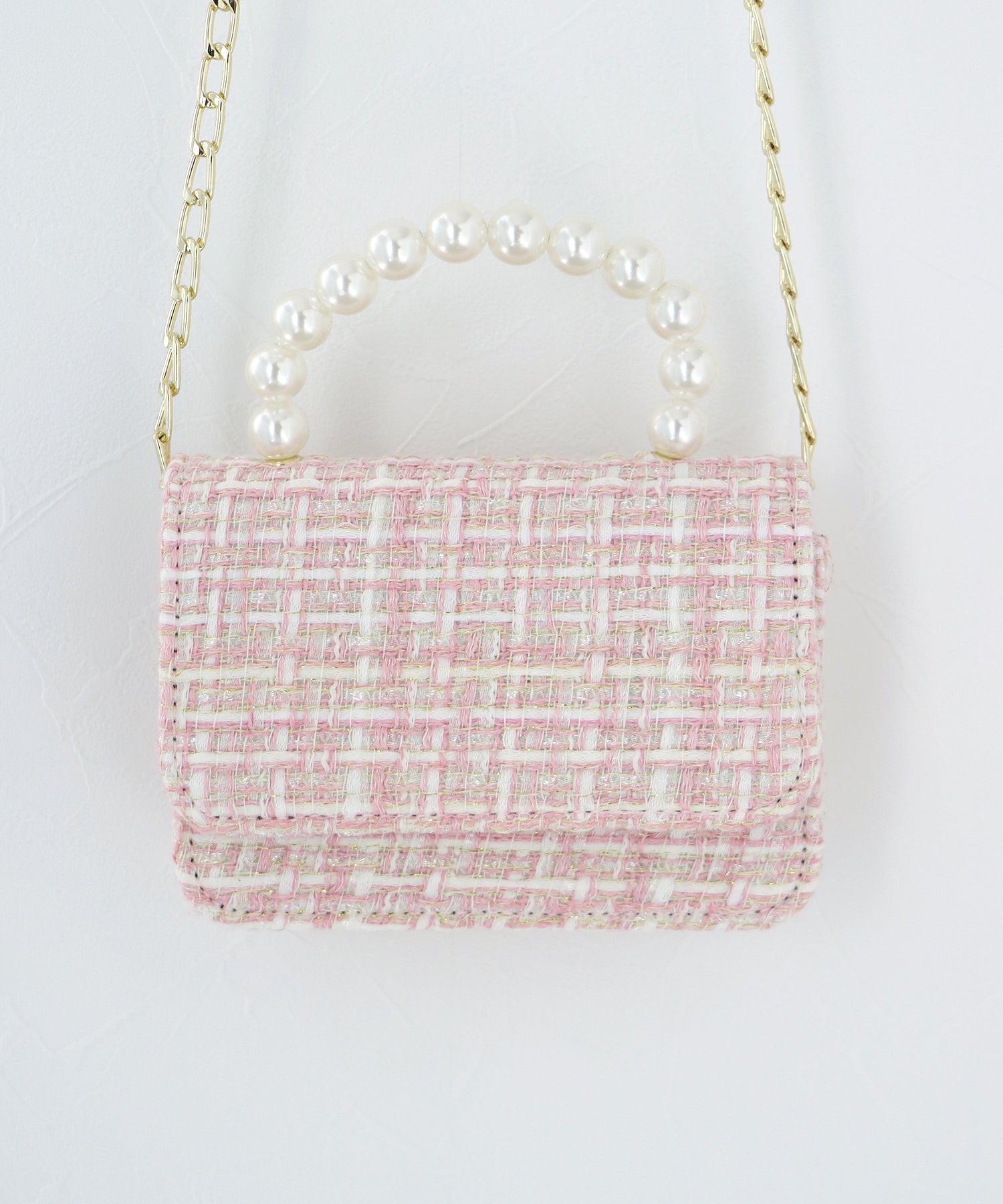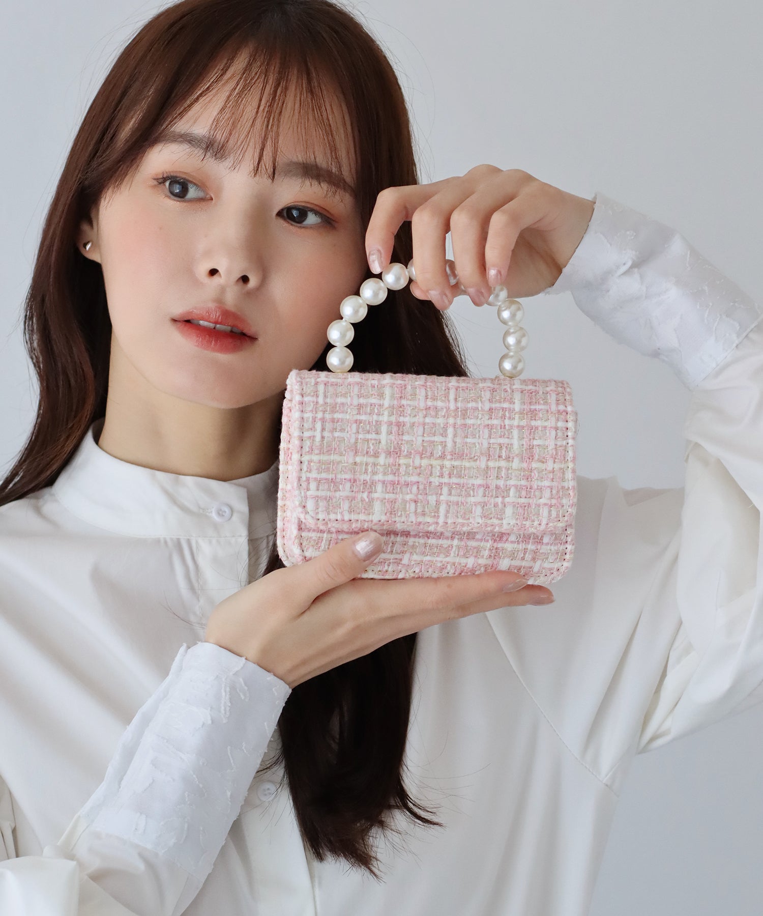 アクセサリー感覚で使える、パールハンドルのミニサイズバッグ ?POINT ころんとした小さめサイズが可愛い、ミニショルダーバッグ。 コンパクトなサイズ感なので、コーデのアクセントとしてななめ掛けでアクセサリーのように使用していただくのが◎ マットなフェイクレザーとツイードが上品で、華やかなパールがパーティードレスにも馴染むので 結婚式やパーティー、成人式、お食事会などのオケージョンシーンにもおすすめです。