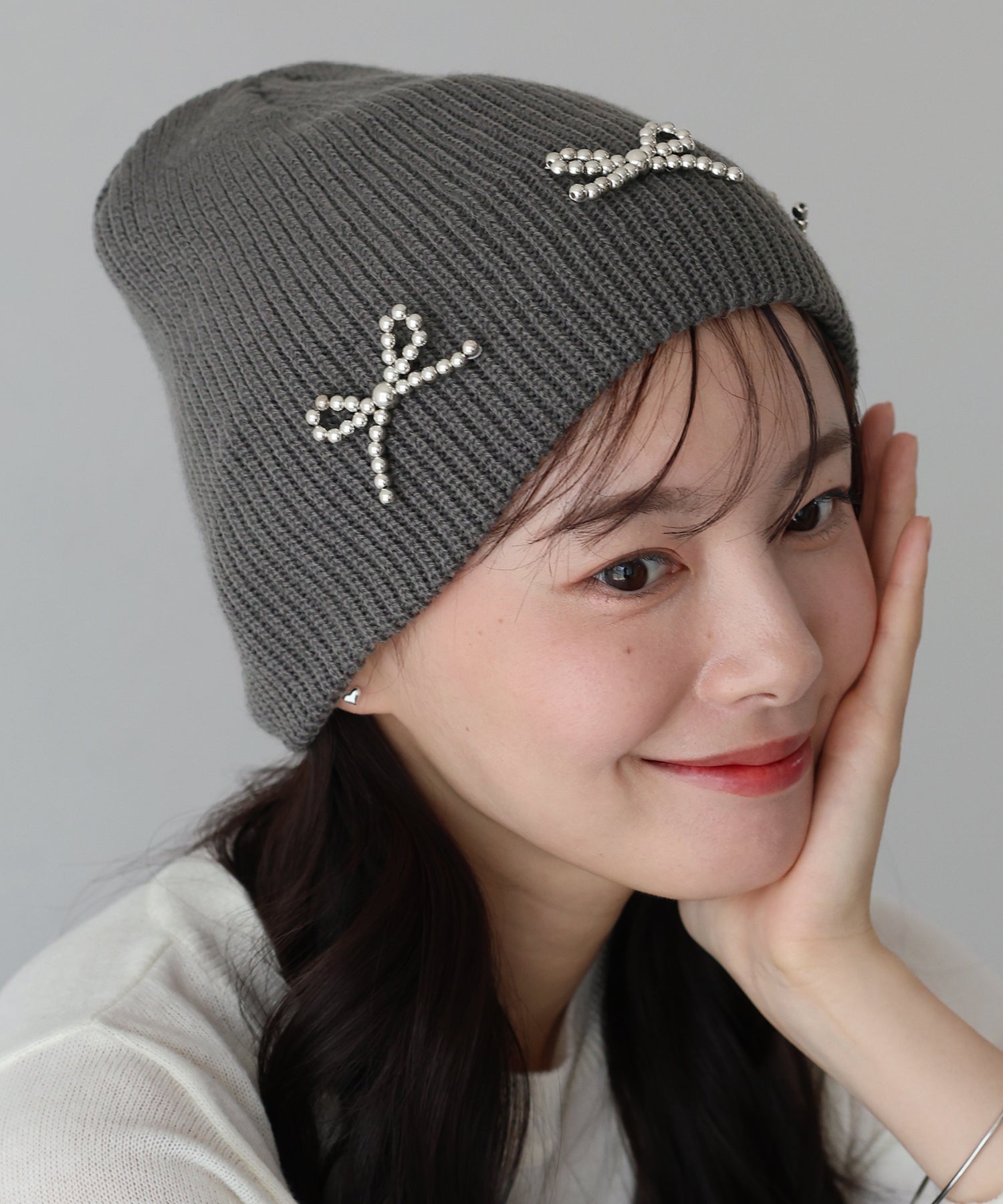 ベーシックなシルエットのニットキャップに、キュートなリボンモチーフを施しました。