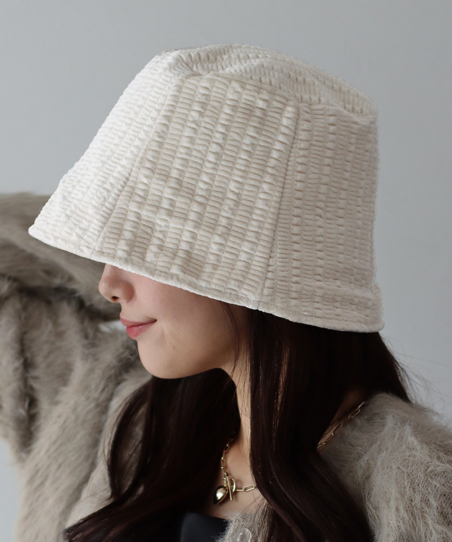秋冬におすすめのベロアバケットハット ?POINT 暖かみと光沢のあるベロア素材でシーズンムードたっぷりに仕上げたバケットハット。 頭がすっぽり入るサイズ感でスマートなシルエットなので、小顔効果も抜群。 シワが気になりにくく、柔らかい素材なので、使わない時も折りたたんでバッグにインできる手軽さ◎? 飽きのこないシンプルなデザインなので、長くご愛用頂けます。 秋冬のコーディネートを一気にグレードアップしてくれるアイテムです。