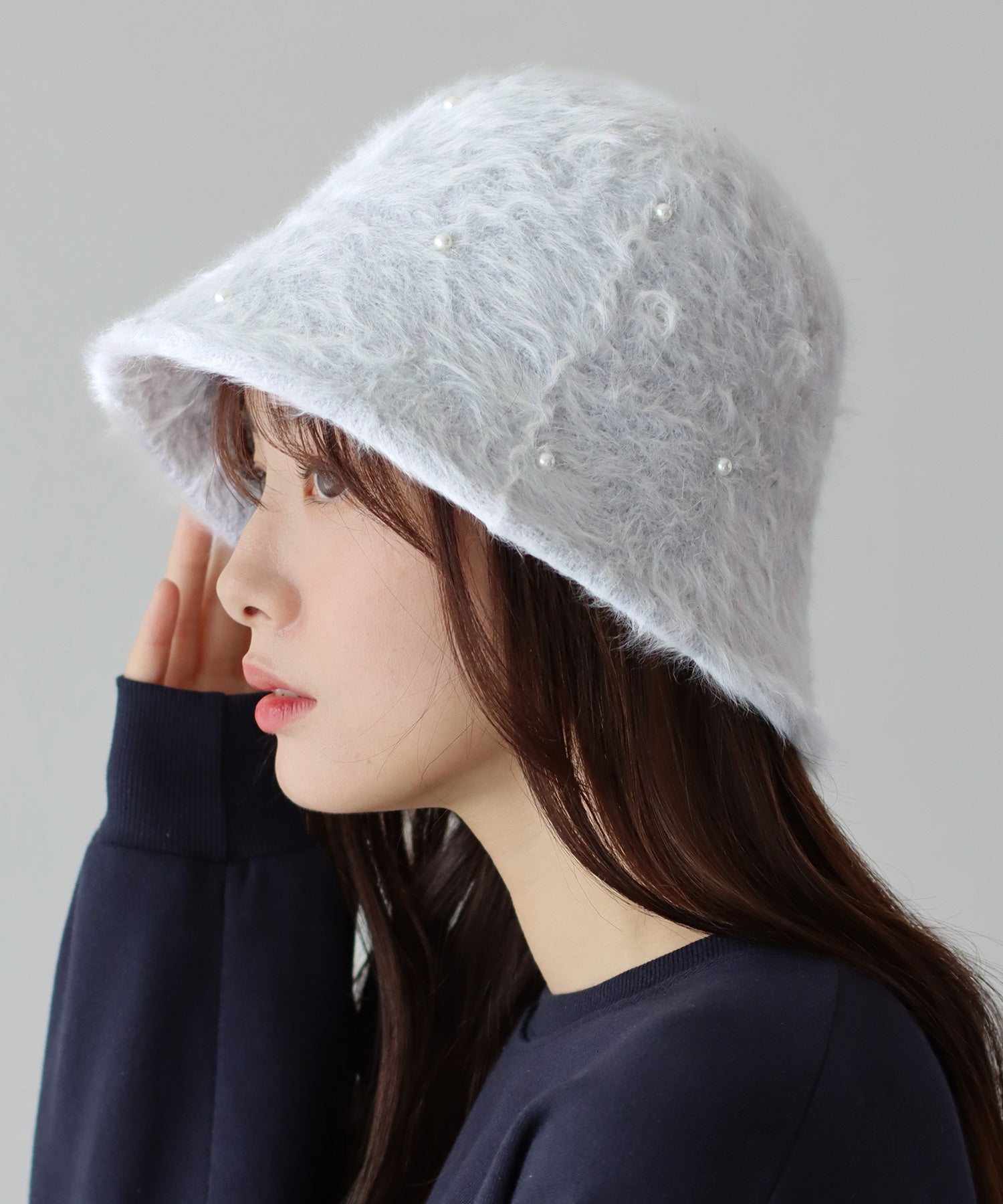 秋冬におすすめのシャギーファーバケットハット ?POINT 毛足が長めのふわふわとしたファーにパールを散りばめたデコラティブなデザインのバケットハット。 頭がすっぽり入るサイズ感でスマートなシルエットなので、小顔効果も抜群。 アンゴラが含まれている程よい毛並みのファー素材で、暖かく着用できます。 柔らかい素材なので、使わない時も折りたたんでバッグにインできる手軽さ◎? 秋冬のコーディネートを一気にグレードアップしてくれるアイテムです。