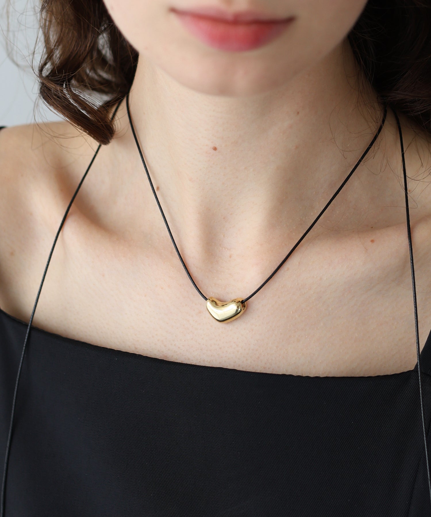 気分によってマルチウェイに楽しめるチョーカーネックレス ?POINT 短くしてチョーカーに、長くしてロングネックレスに…と 気分やお洋服に合わせて簡単にモチーフの位置や長さを調節して着用可能なデザイン。 きゅっと絞ってリボン結びにしたりとアレンジがマルチウェイで楽しめます。 ハートのようなニュアンス感のあるぷっくりとしたモチーフが洗練された印象で コード部分はブラックのチョーカーデザインで甘くなりすぎずカジュアルにつけられます。 シンプルなスタイリングの際にアクセントになるアイテムです。