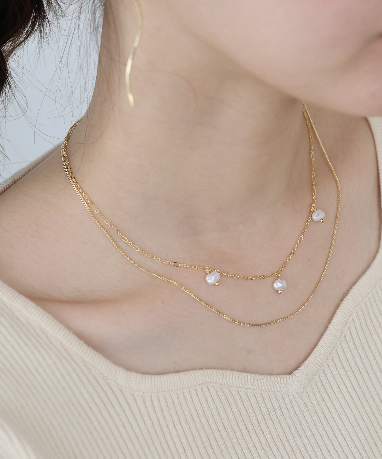 動くたびにきらきらと輝く華奢なチェーンと淡水パール風のビーズがちょこんと3つあしらわれたデザイン。