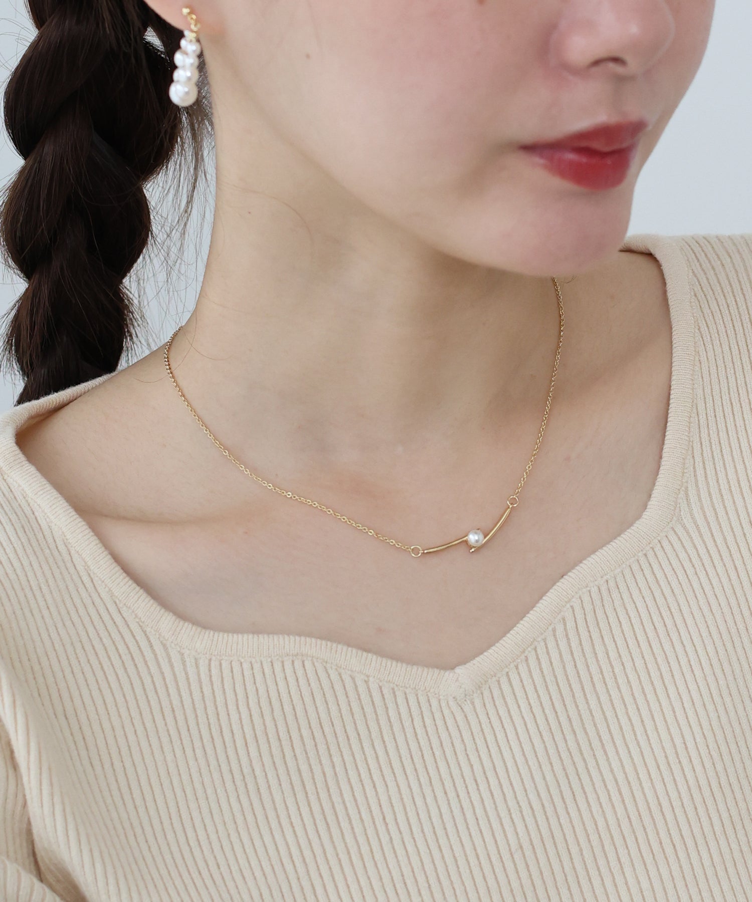 バーモチーフの中央にパールをセッティングした華奢ネックレス。