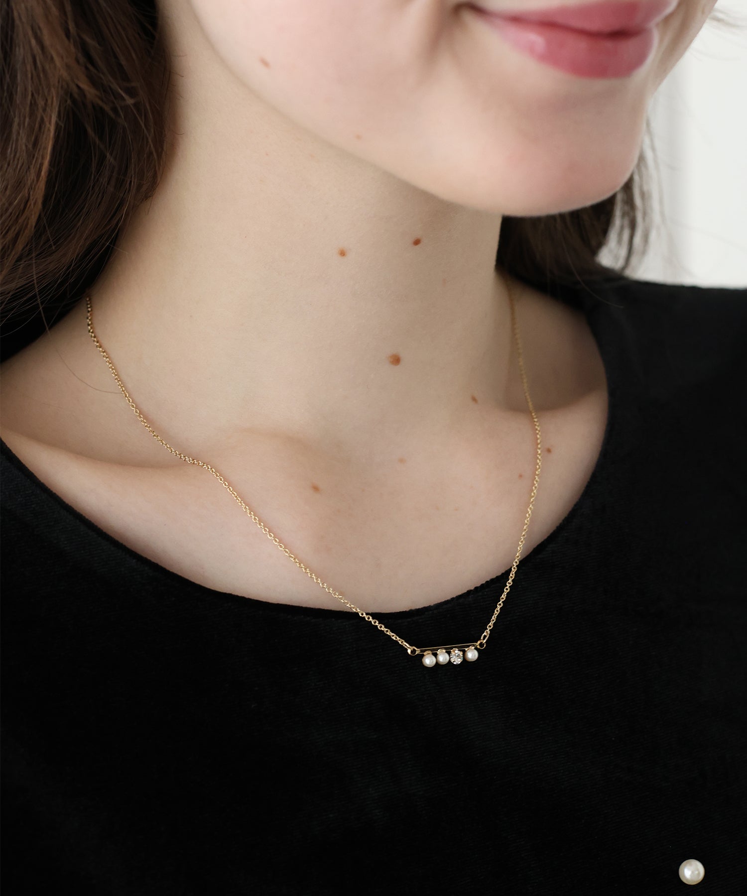 バーモチーフにミニパールとビジューをセッティングした華奢ネックレス。