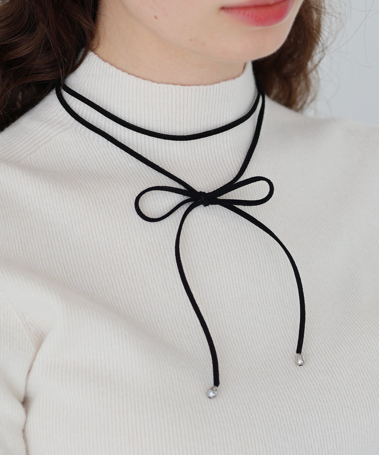 1本のリボンを結んだかのようなデザインのチョーカー風ネックレス ?POINT つけるだけで旬なスタイルが完成するコードネックレス。 リボンを巻き付けたようなデザインですが、 金具で着脱できるので、自分で巻き具合を調整する必要がなく楽に付けられます。 存在感があるので、シンプルなTシャツやワンピースに合わせていただくだけでコーディネートの幅が広がります。