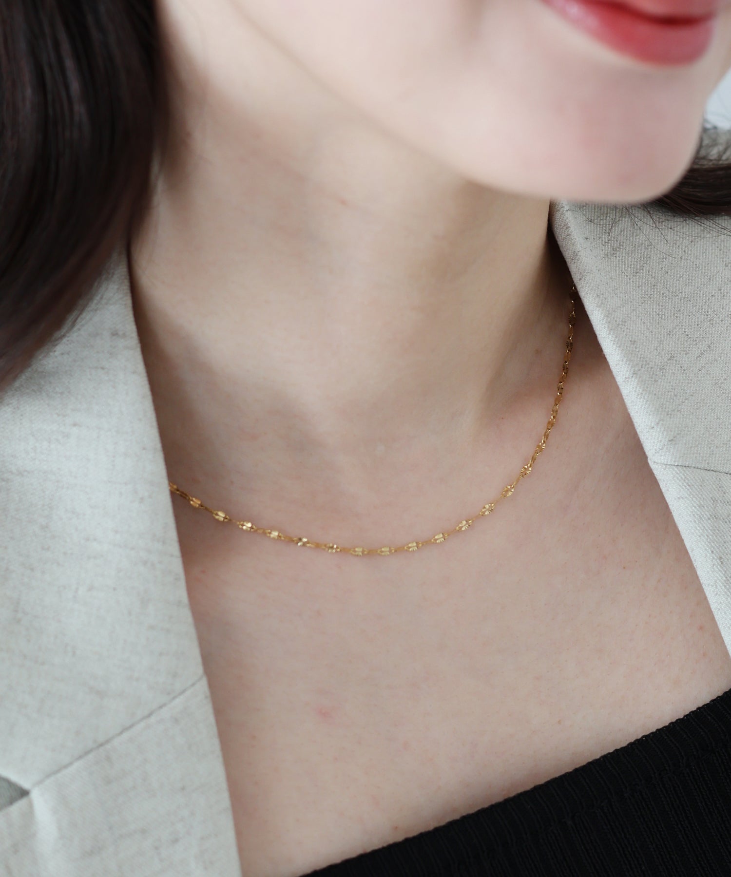 ?POINT 光の反射でキラキラと輝くグリッターのようなメタルチェーンが魅力のネックレス。 シンプルながらも洗練されたデザインで、コーディネートにさりげないエッジをプラス。 華奢でありながらも存在感のあるネックレスなので 一つ付けるだけでコーディネートのさり気ないワンポイントに。 シーズンレスで使えるため、デイリーから特別なシーンまで幅広く活躍。 カジュアルにもキレイめにも取り入れていただけるアイテムです。