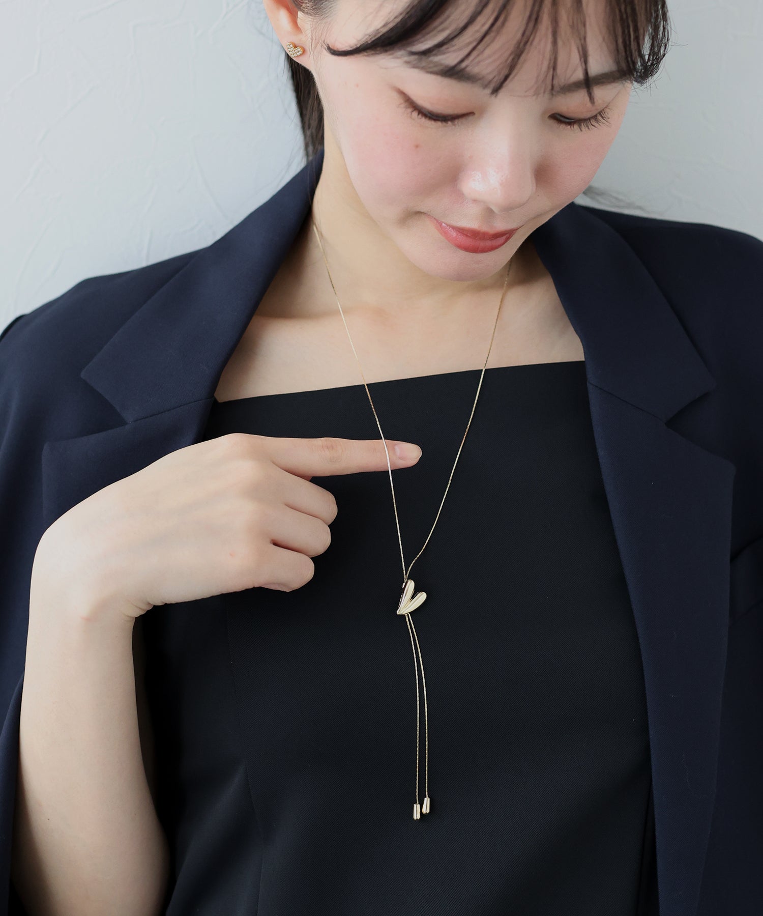 ?POINT ニュアンス感のあるハートモチーフが魅力のスライダーネックレス。 華奢なチェーンが上品な輝きを放ち、コーディネートにさりげないアクセントをプラスします。 スライド式で長さを自在に調整でき、ネックレスとしてはもちろん、そのまま垂らしてY字デザインにもアレンジ可能。 シンプルながらも洗練されたデザインで、オンオフ問わず幅広いスタイリングに活躍するアイテムです。