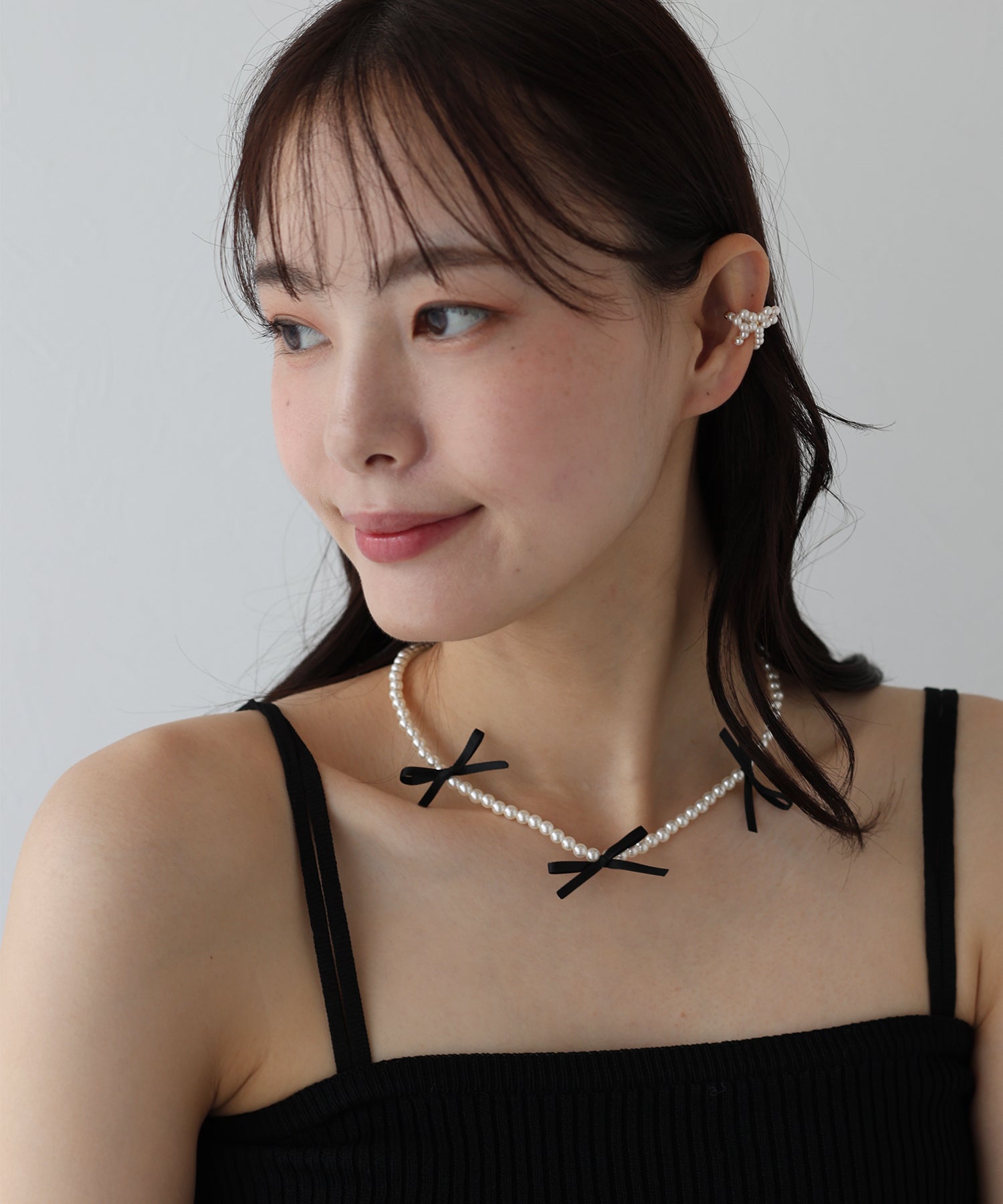 リボンを結びつけたようなデザインのパールネックレス ?POINT ?華奢なパールビーズに小ぶりのリボンが付いたトレンド感たっぷりのネックレス。 パールで洗練された印象と上品さを加え、リボンでラブリーさを加えました。 いつものコーデにプラスするだけで、トレンドコーデを完成するアイテム。 派手過ぎず、甘すぎないオススメのアイテムです。