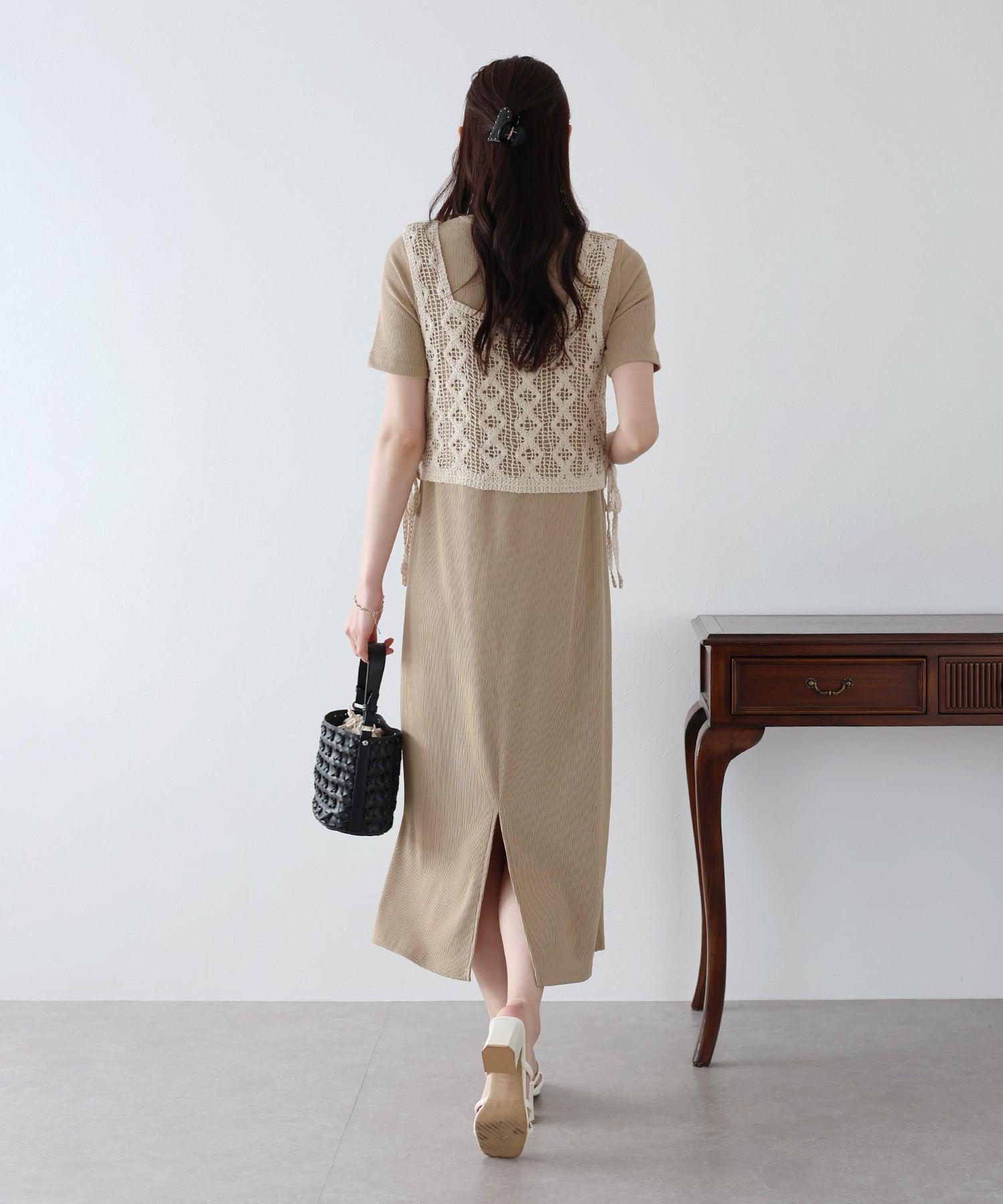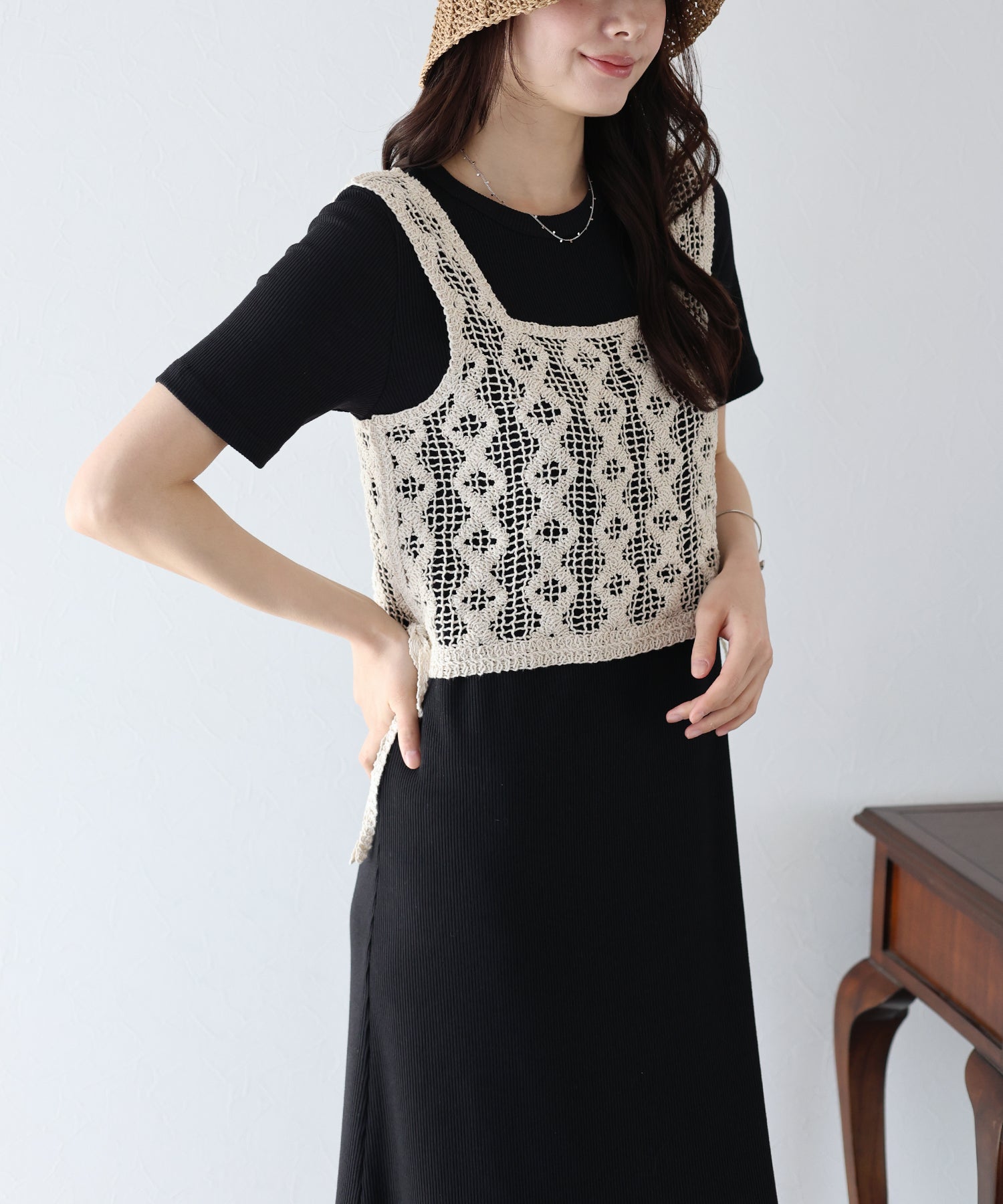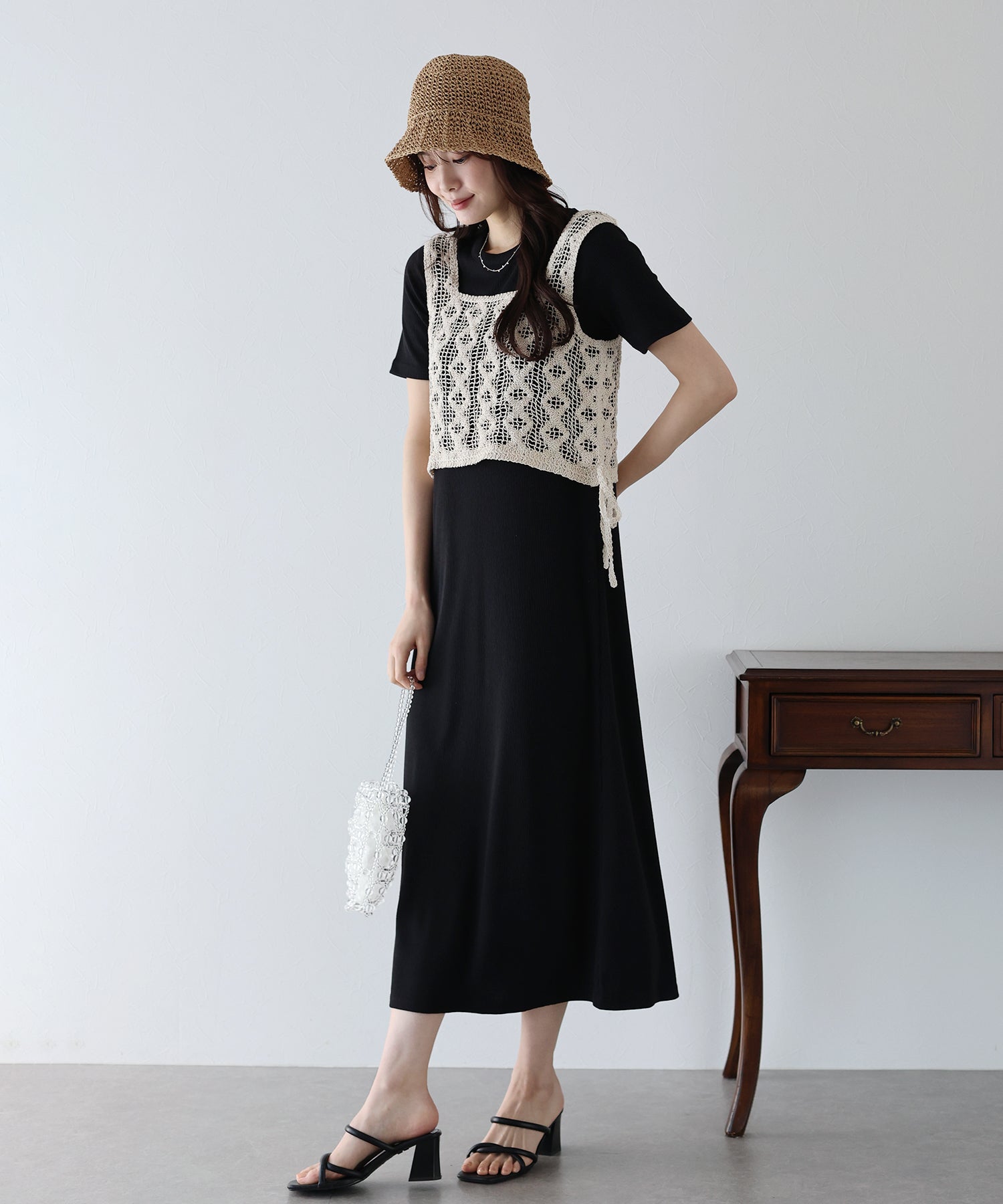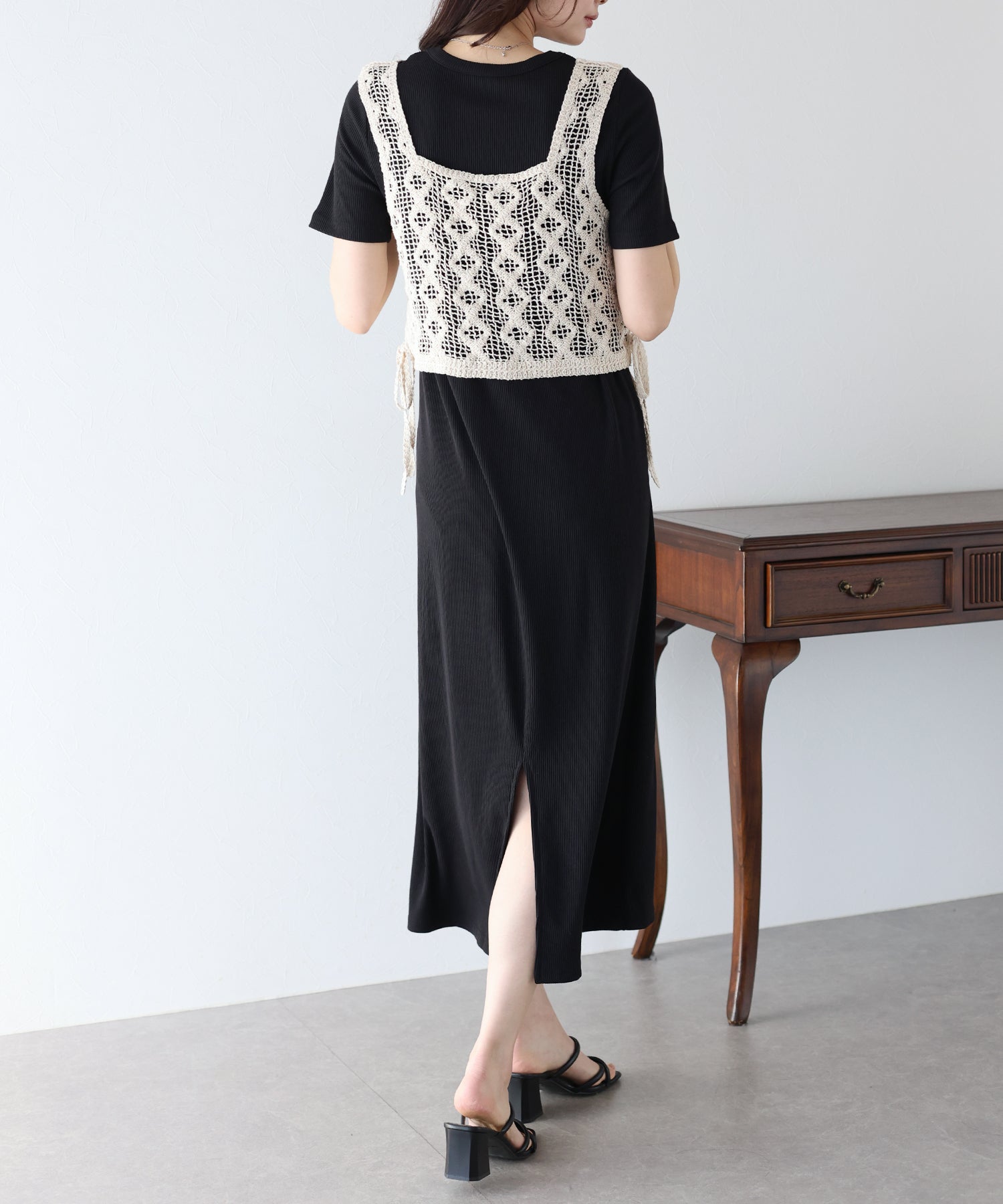 ?POINT 抜け感のあるおしゃれなクロシェ編みベスト×ベーシックなワンピースがセットになったアイテム。 着るだけで、シーズンライクなコーデに仕上がり、おしゃれなコーディネートが即完成する優れもの。 滑らかな触り心地のワンピースと涼し気なクロシェ編みのベストで着やすさも抜群! ベストは両サイドにリボンを施しフェミニンに仕上げ、さらに短めの丈でスタイルアップを叶えます。 ワンピースはベーシックなデザインなので一枚でもデイリーに着まわしやすく、 バックスリットを入れ、足さばき良く楽に着用いただけます。 セットでも単品でもご着用いただける、着回し力抜群のアイテムです。