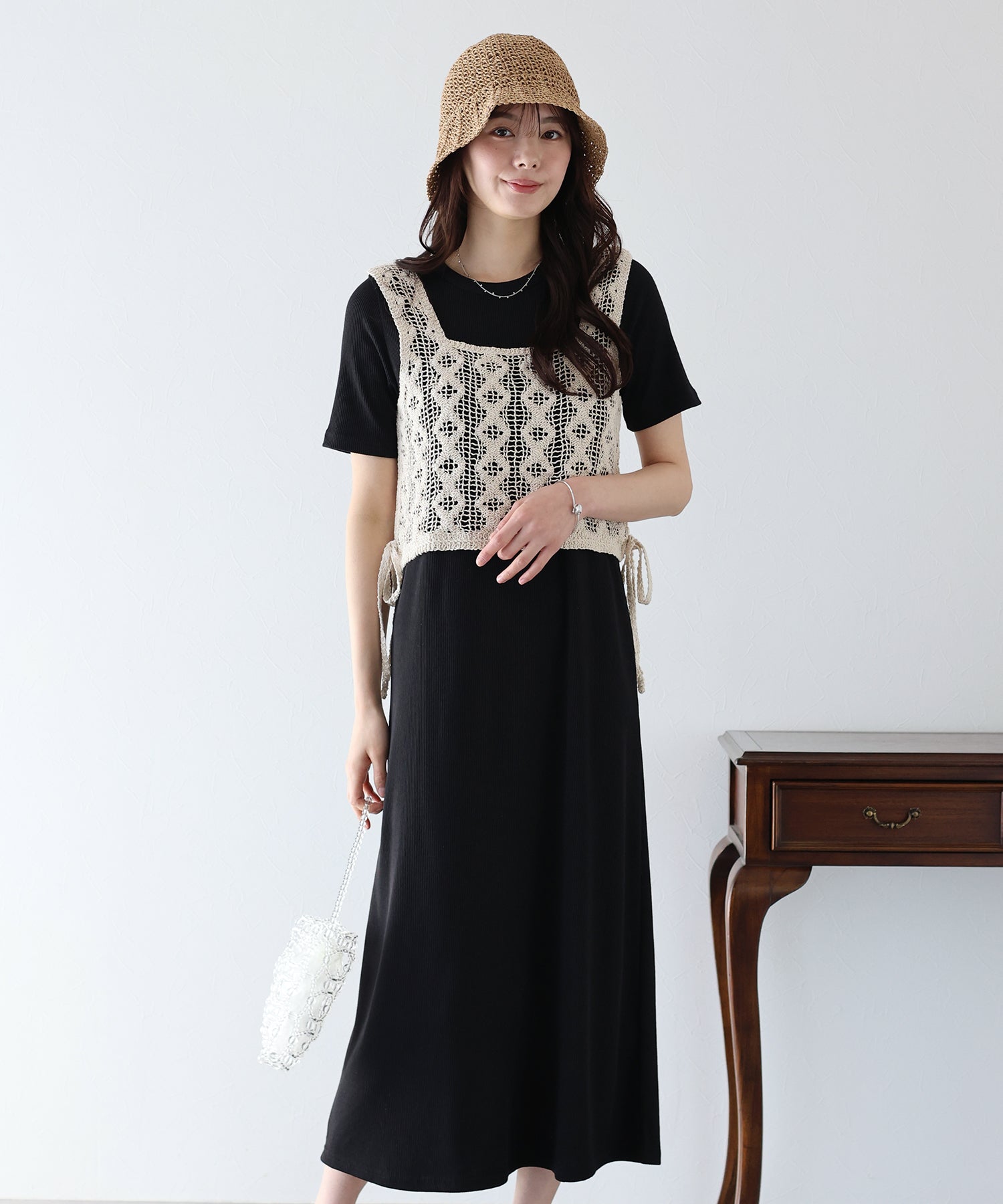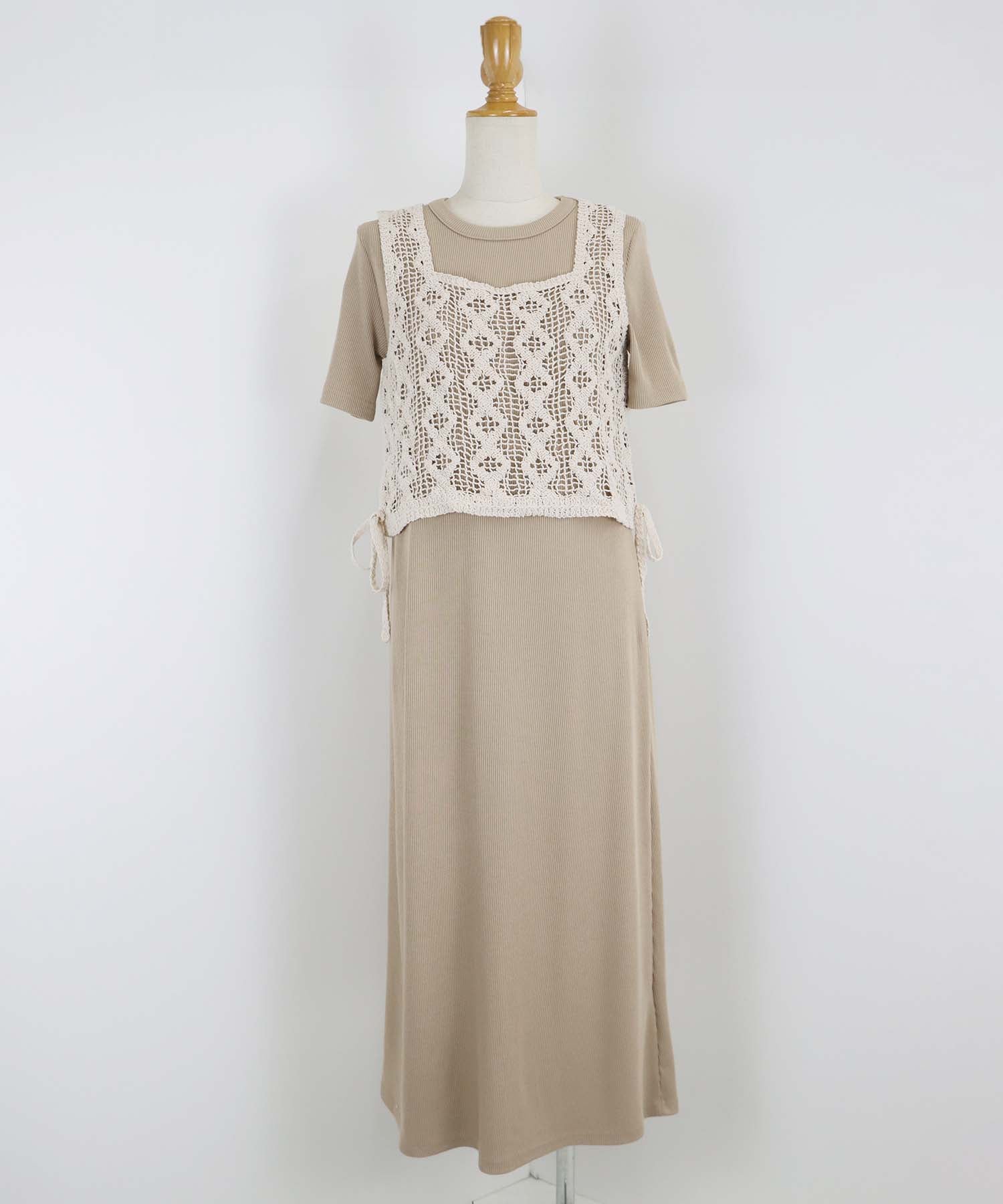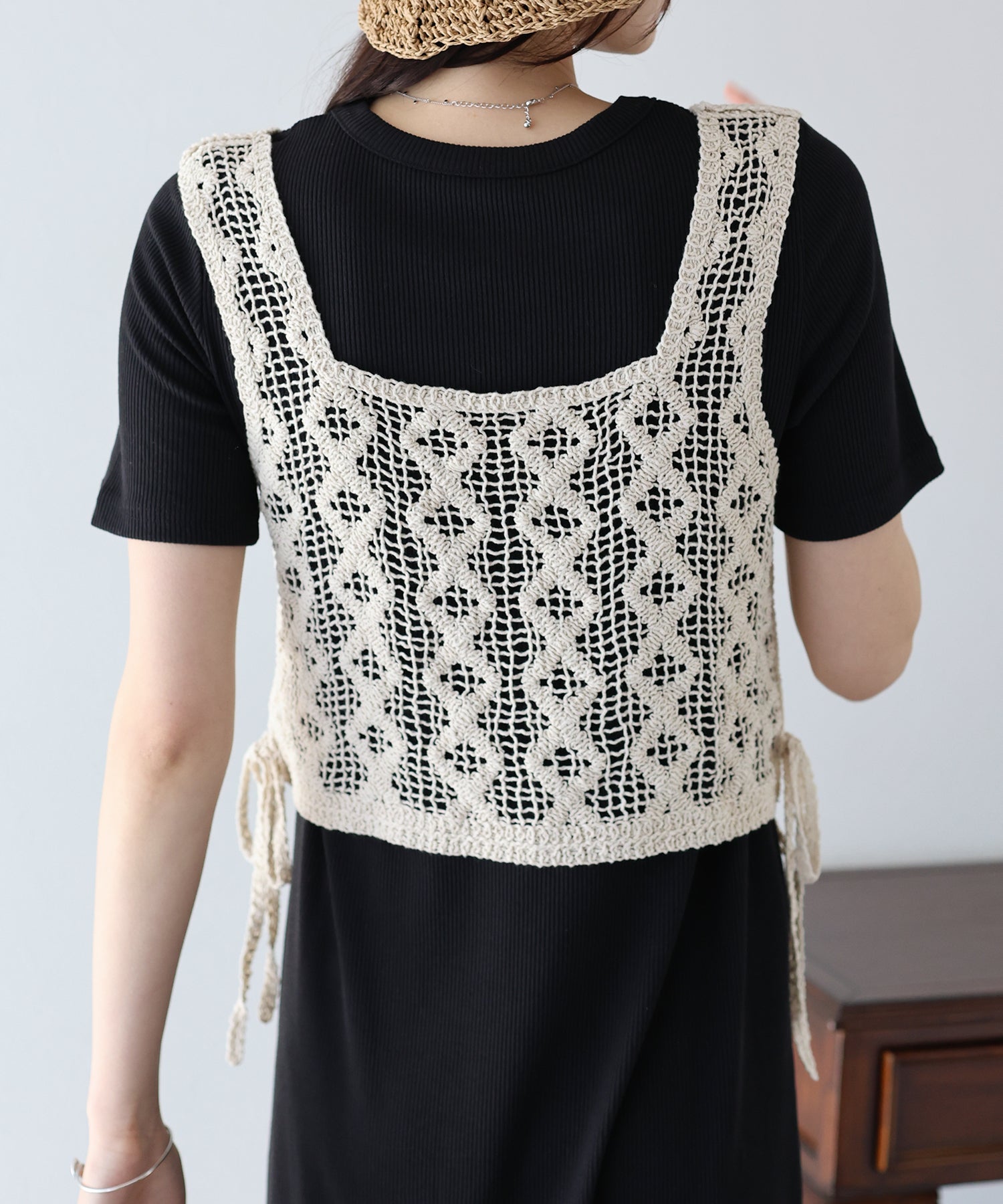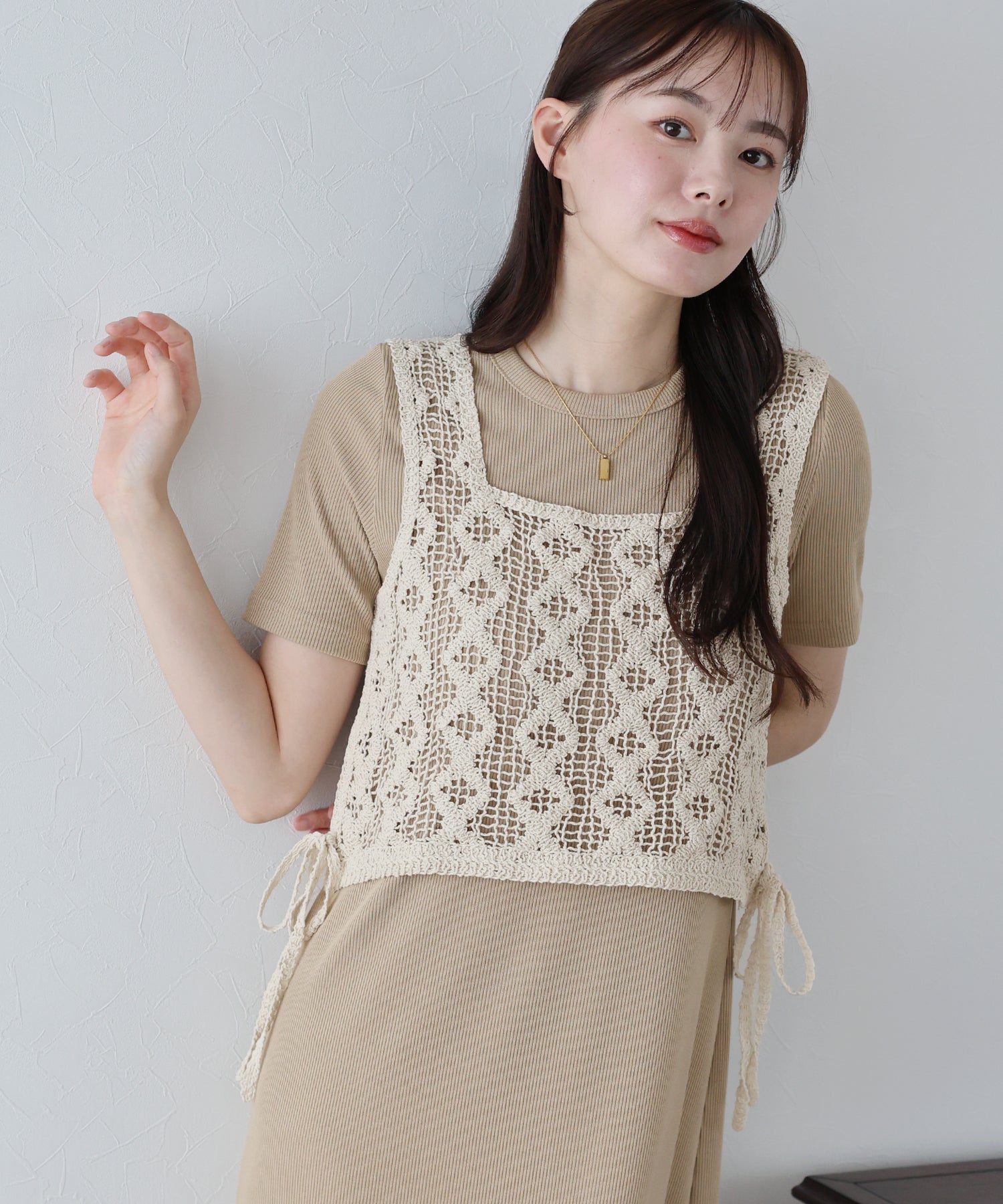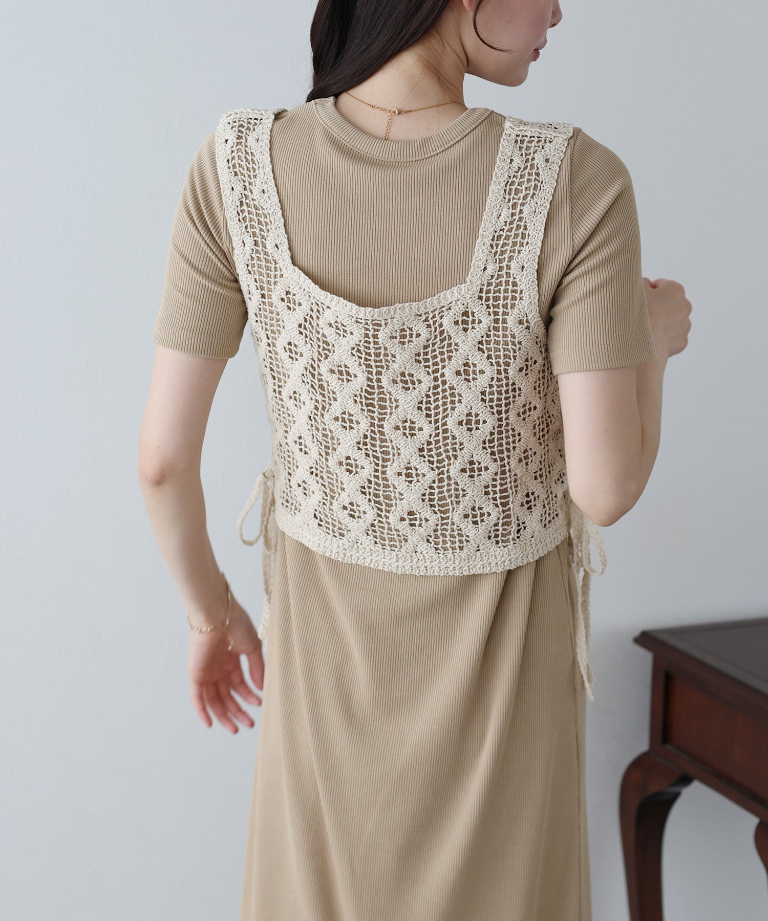 ?POINT 抜け感のあるおしゃれなクロシェ編みベスト×ベーシックなワンピースがセットになったアイテム。 着るだけで、シーズンライクなコーデに仕上がり、おしゃれなコーディネートが即完成する優れもの。 滑らかな触り心地のワンピースと涼し気なクロシェ編みのベストで着やすさも抜群! ベストは両サイドにリボンを施しフェミニンに仕上げ、さらに短めの丈でスタイルアップを叶えます。 ワンピースはベーシックなデザインなので一枚でもデイリーに着まわしやすく、 バックスリットを入れ、足さばき良く楽に着用いただけます。 セットでも単品でもご着用いただける、着回し力抜群のアイテムです。