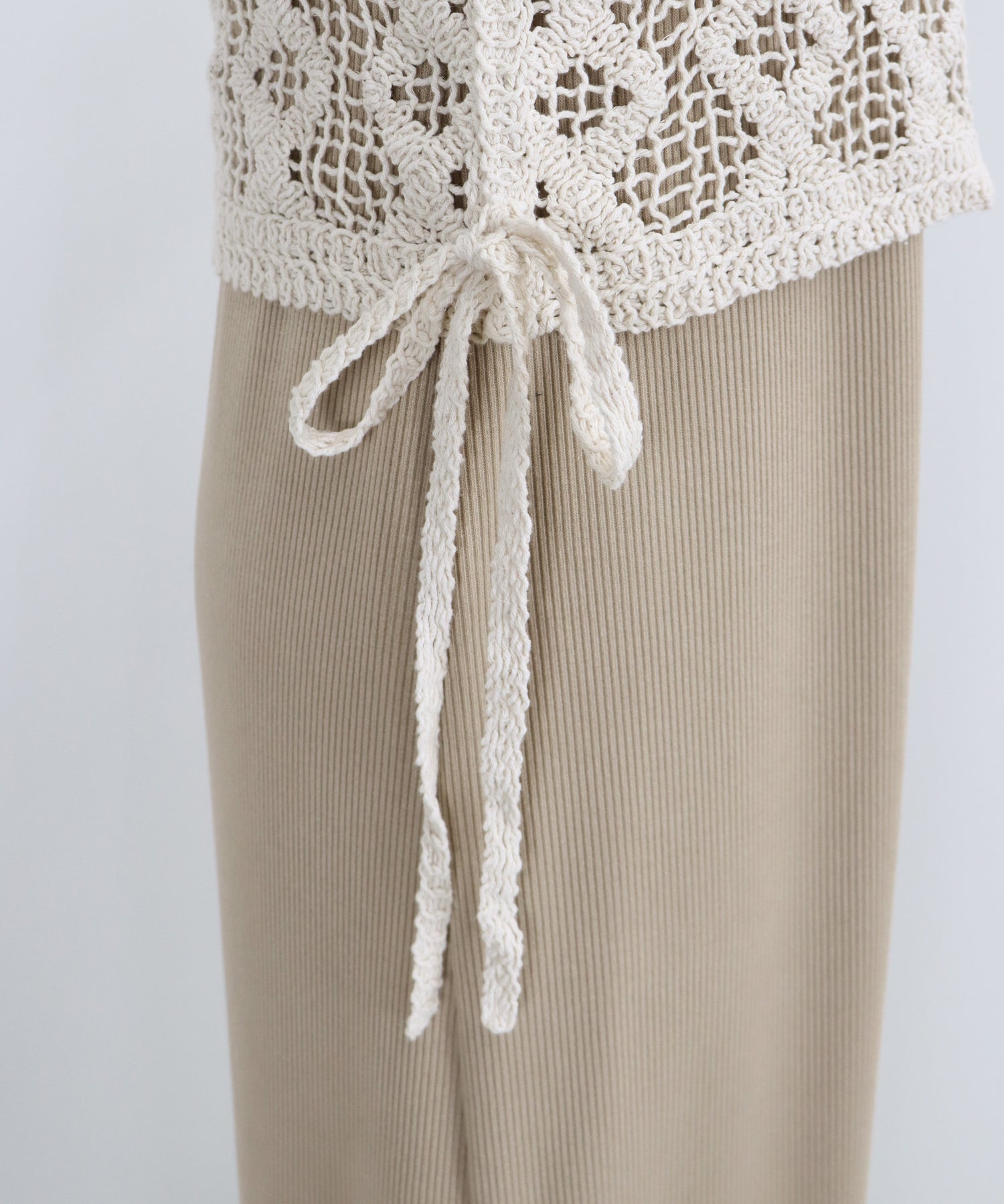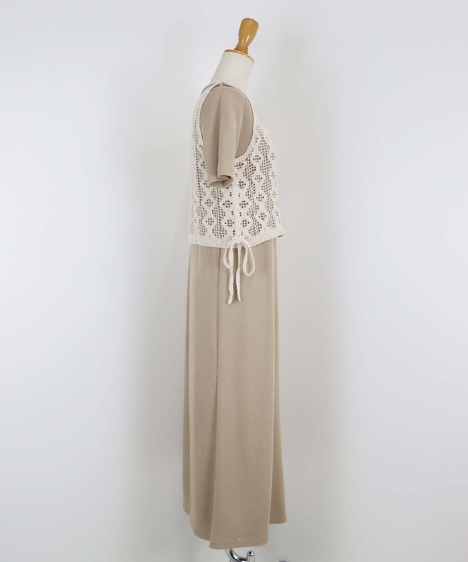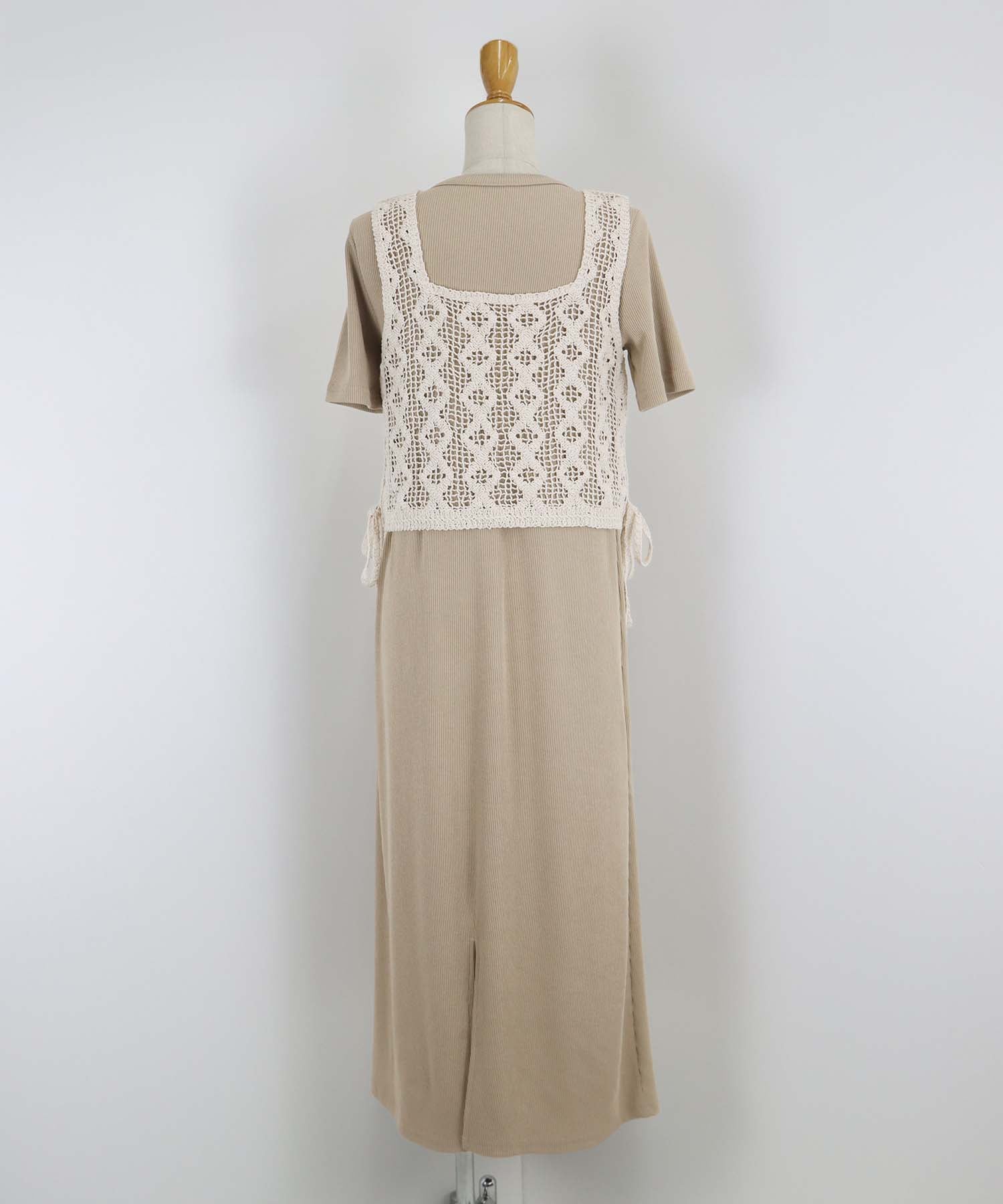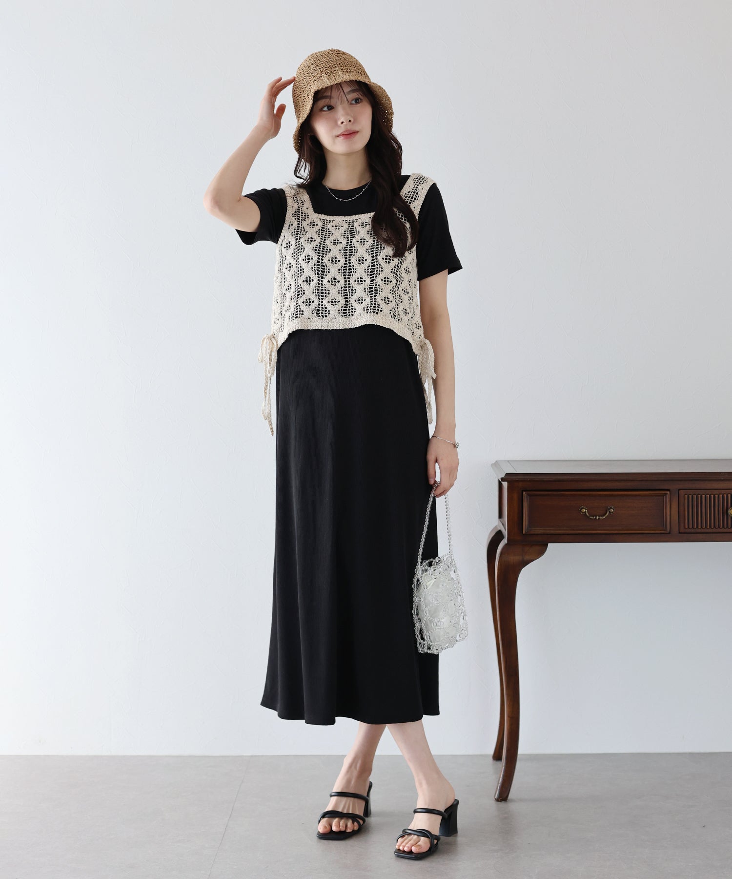 ?POINT 抜け感のあるおしゃれなクロシェ編みベスト×ベーシックなワンピースがセットになったアイテム。 着るだけで、シーズンライクなコーデに仕上がり、おしゃれなコーディネートが即完成する優れもの。 滑らかな触り心地のワンピースと涼し気なクロシェ編みのベストで着やすさも抜群! ベストは両サイドにリボンを施しフェミニンに仕上げ、さらに短めの丈でスタイルアップを叶えます。 ワンピースはベーシックなデザインなので一枚でもデイリーに着まわしやすく、 バックスリットを入れ、足さばき良く楽に着用いただけます。 セットでも単品でもご着用いただける、着回し力抜群のアイテムです。