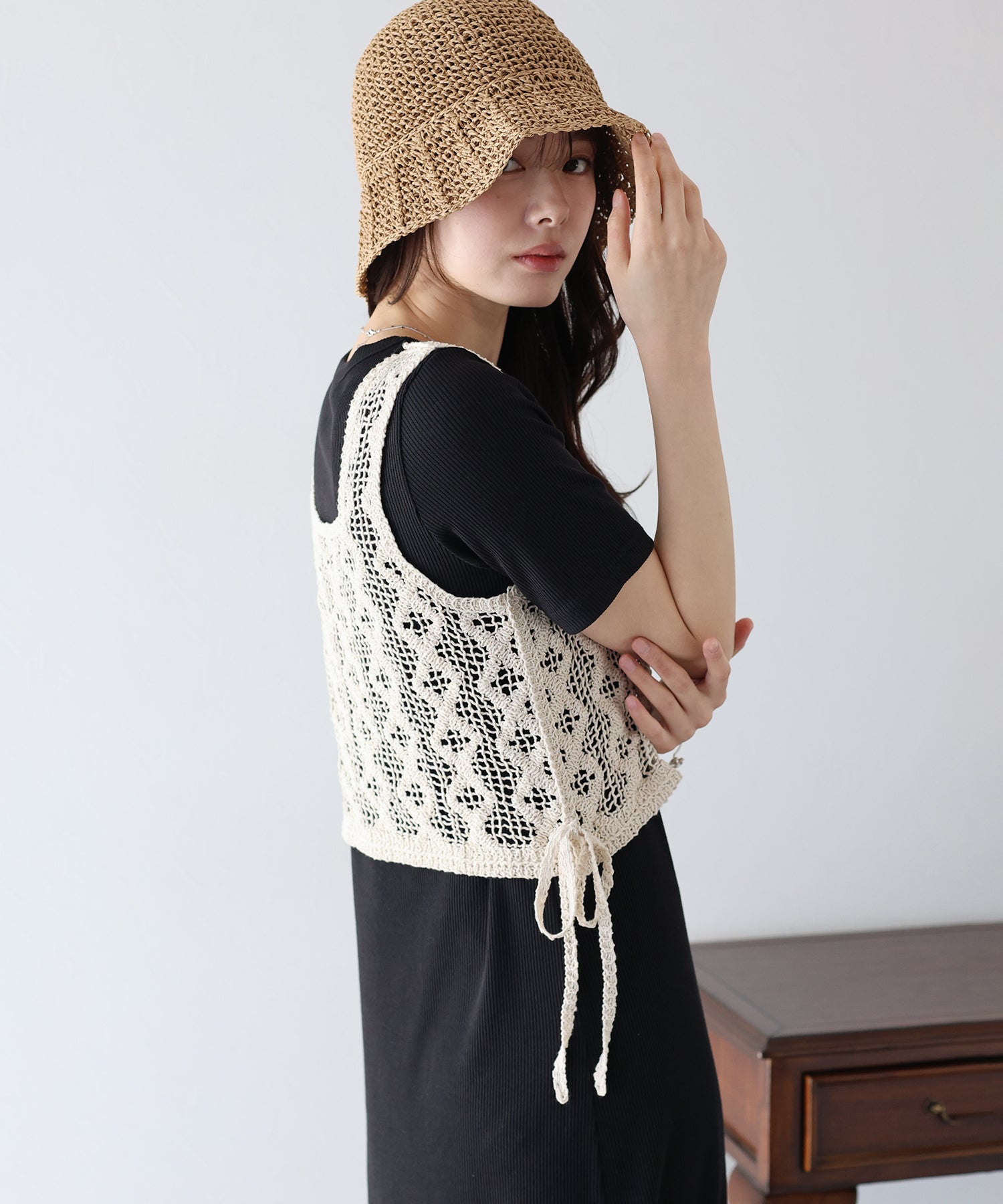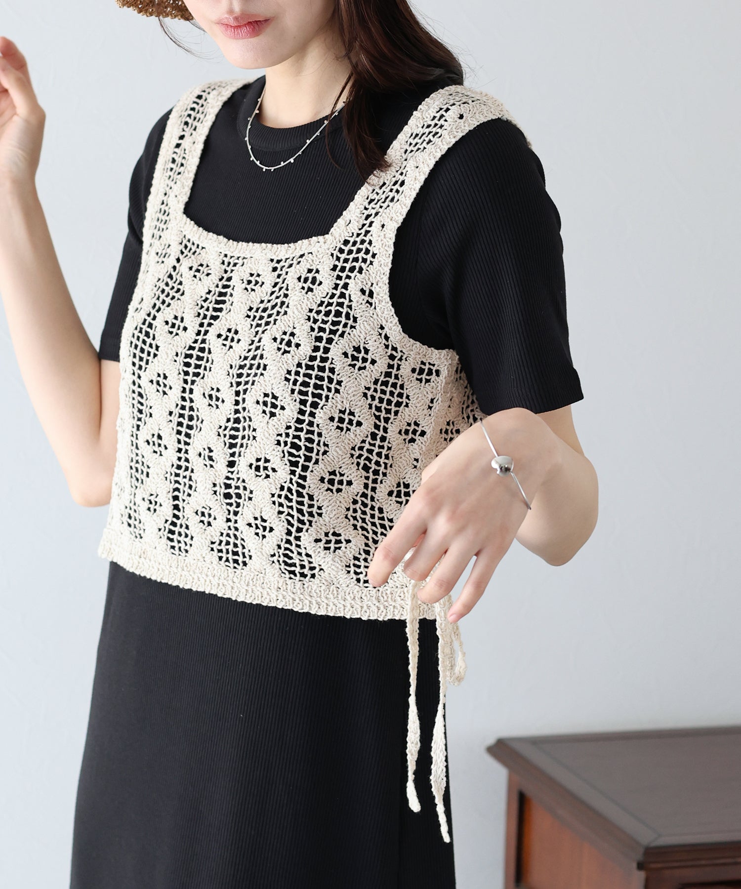 ?DETAIL 【ベスト】 クロシェレース 両サイドリボン付き ショート丈