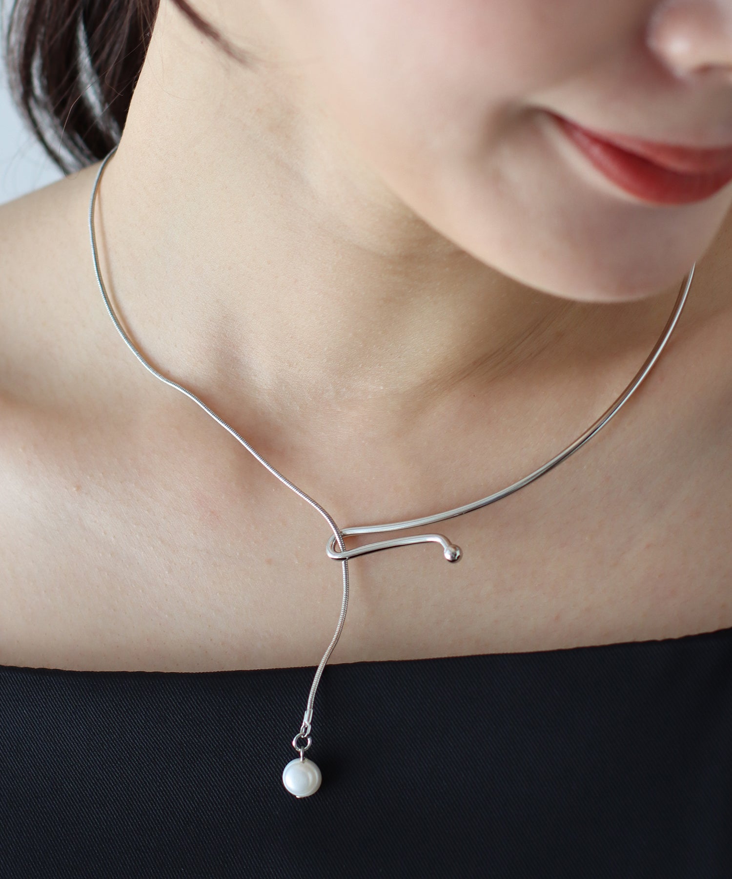 モードな雰囲気のチョーカーネックレス ?POINT メタルラインとスネークチェーンに淡水パールを組み合わせた上品なデザイン。 ネックレスとチョーカーをドッキングしたようなデザインで、 身に着けるだけでこなれ感のあるY字シルエットになり洗練されたスタイルに。 1つ持っておくだけでコーディネートの幅が広がります。?