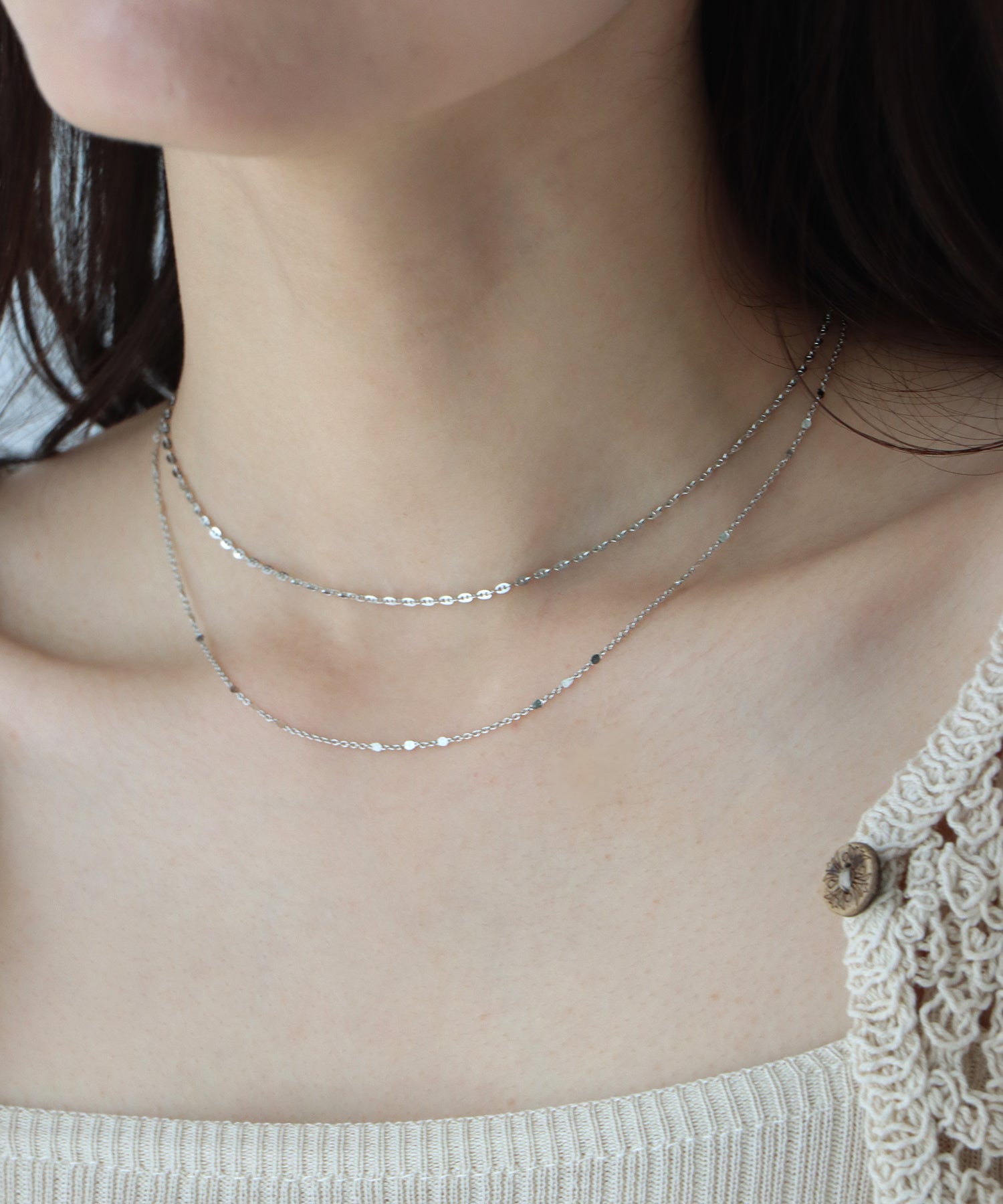 動くたびにきらきらと輝くペタルチェーンネックレス ?POINT 光の反射できらきらと輝くグリッターのような艶めきの2連ネックレス。 動くたびに光を反射してきらきらと輝く2種類のチェーンが目を惹くデザイン。 華奢でありながらも存在感のあるネックレスなので1つ付けるだけでコーディネートのさりげないワンポイントに。 カジュアルにも綺麗めにも取り入れていただけるアイテムです。
