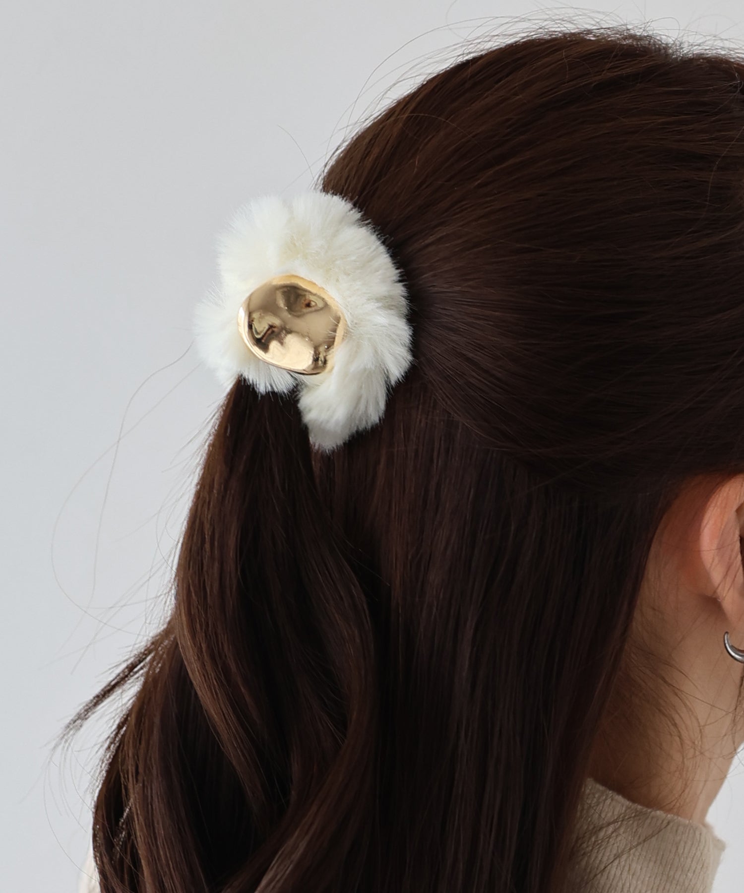ニュアンス感のあるメタルプレートが目を惹く、フェイクファーのシュシュ。