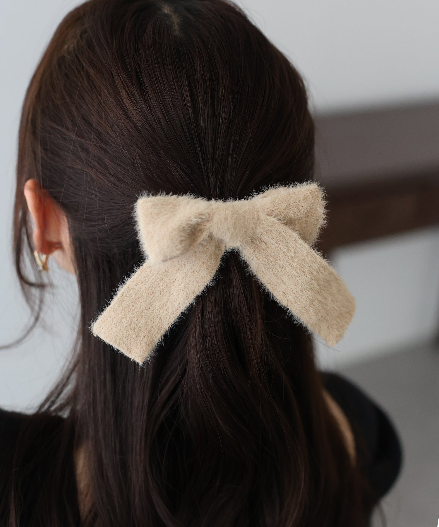 簡単ヘアアレンジが叶う、ポニーフック ?POINT シンプルなまとめ髪を一気にこなれ感のあるスタイルに変えられるリボンヘアカフ。 フックが付いているため、ヘアゴムでまとめた髪に差し込むだけでヘアアレンジが苦手な方でも簡単にお使いいただけるアイテム。 シーズンライクなシャギー素材なので、秋冬スタイルをぐっと格上げしてくれて大人っぽいうしろ姿に導いてくれます。 結婚式やパーティーなどのオケージョンシーンにもおすすめです。