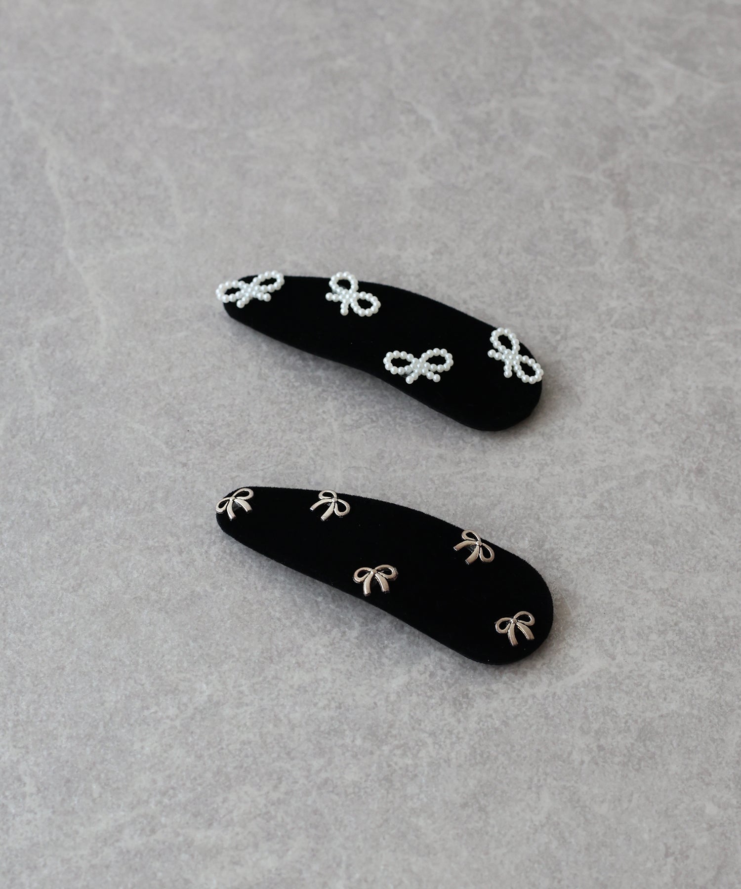 トレンドのバレエコアな雰囲気を演出するベロアヘアピン ?POINT 小粒パール&メタルのリボンがかわいいヘアピン。 気軽にさっと前髪をねじってパチッと留めるだけで簡単にヘアアレンジが楽しめるのがポイント。 サイドの髪の毛をとめたり、オケージョンシーンのヘアアレンジに添えたりとアレンジの幅が広がります。 高級感のあるベルベット素材なので、秋冬スタイルをぐっと格上げしてくれるヘアアクセです。