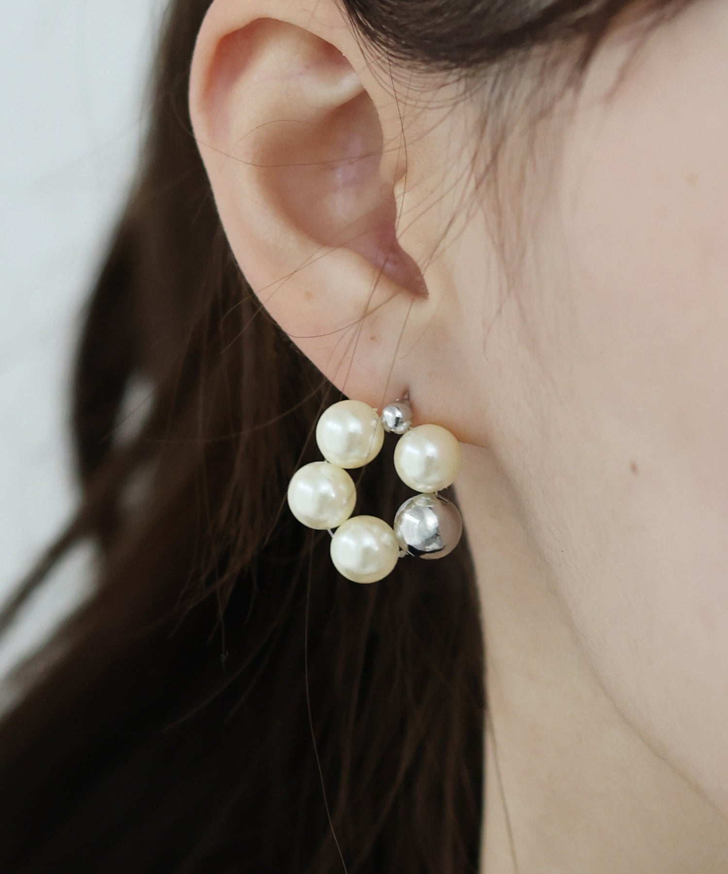 上品な光沢のパールとメタルボールをあしらった女性らしさを感じるピアス。