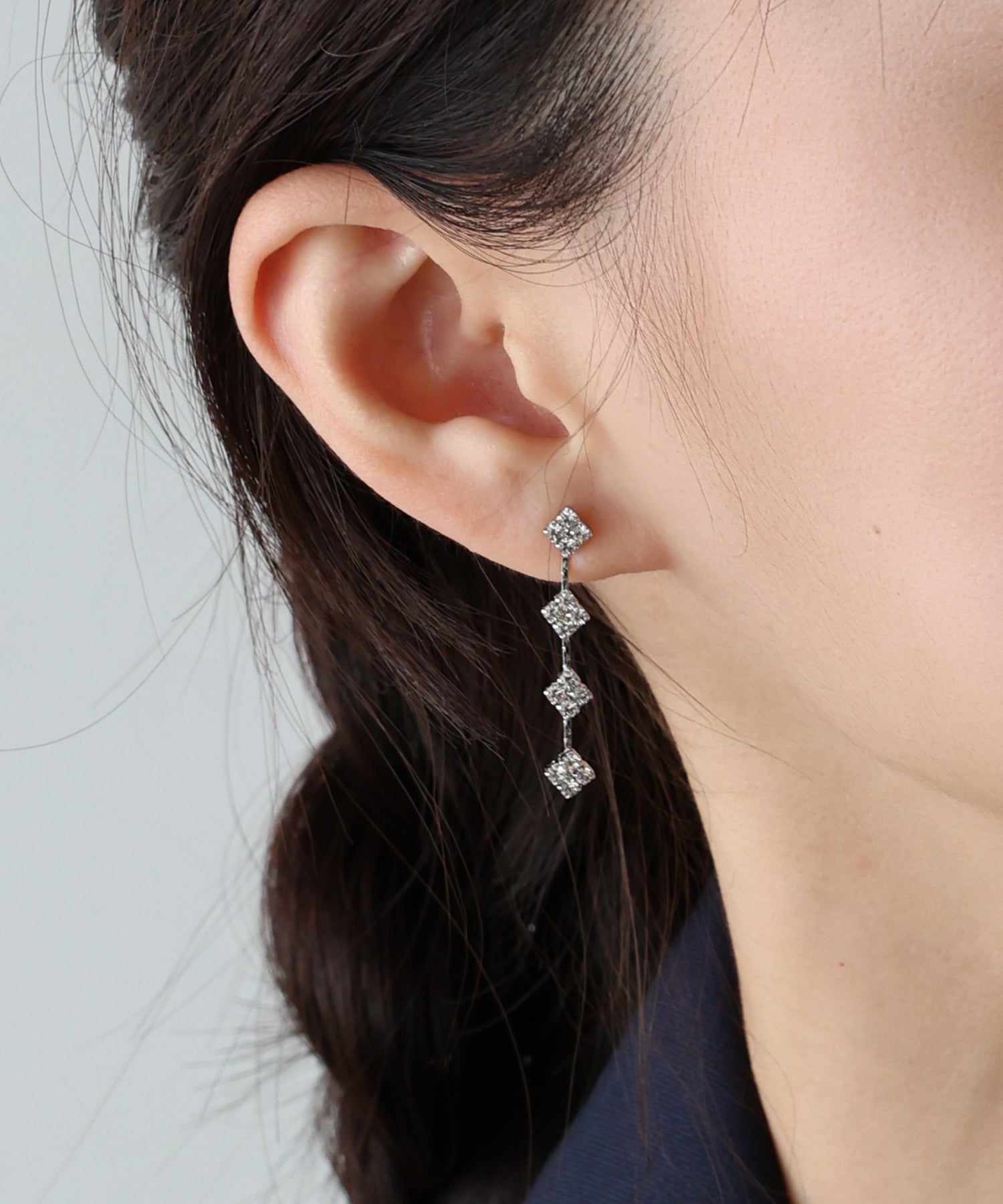 ゴールド/シルバーのスクエアモチーフの上にビジューをのせ、華やか&上品に仕上げたピアス。