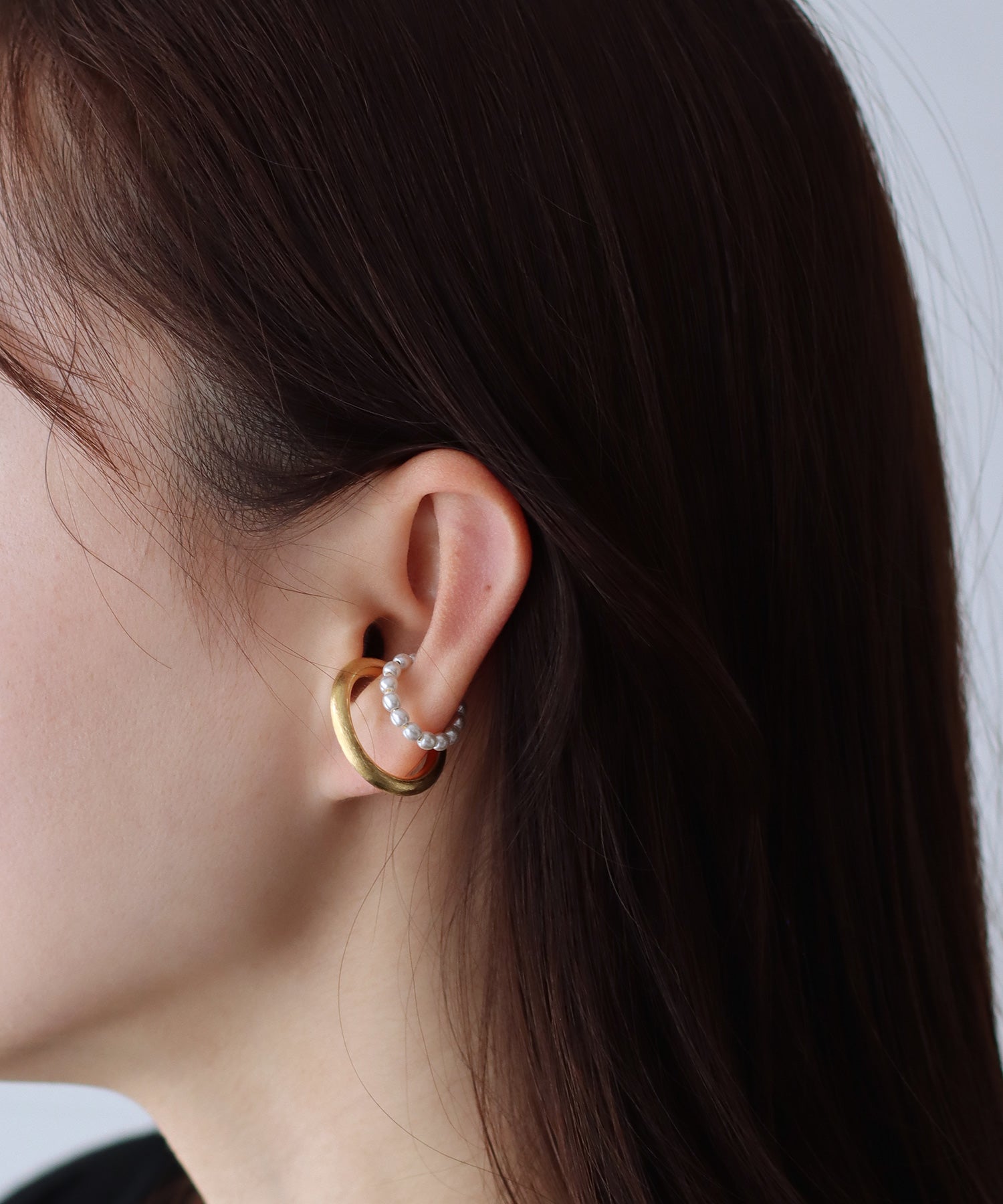小粒パールとマットなメタルラインの組み合わせが目を惹くイヤーカフ ?POINT 耳に引っ掛けるタイプのイヤーカフは、ピアスやイヤリングとはまた違う印象の目を惹くアイテム。 ピアスホールがない方にも着用していただけます。 パールとマットな光沢のメタルラインを組み合わせたシンプルな2連デザインで使い勝手がよく、 どんなコーディネートにも合わせやすいアクセサリーです。