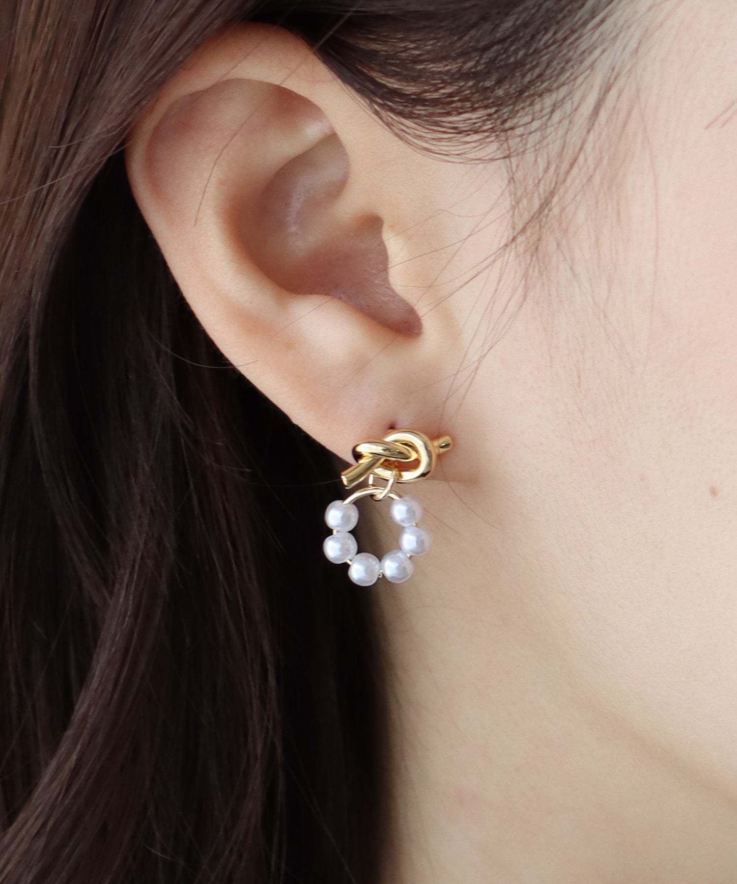 きゅっと結んだノットデザインが目を惹くピアス ?POINT ノットデザインとパールがやわらかな印象で、遊び心がありながら女性らしさを感じるデザイン。 サークル状にデザインした小粒のパールが動く度に揺れ、顔周りを華やかにしてくれます。 大きすぎず小さすぎない程よいサイズ感で、どんな服にも馴染みやすく普段使いにぴったり。 カジュアルにも綺麗めにも取り入れていただけるアイテムです。