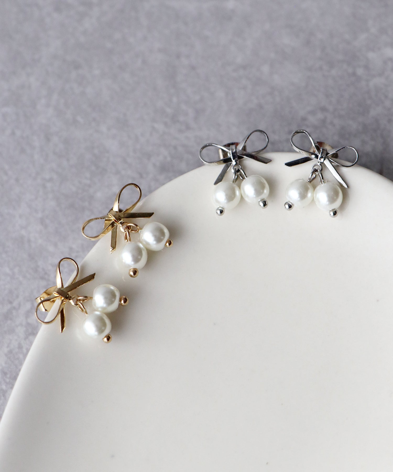 洗練された華奢リボンモチーフピアス ?POINT 小粒のパール×華奢リボンモチーフが可愛いピアス。 ガーリーなモチーフでありながらもメタリックな素材感で、カジュアルなコーディネートにも取り入れやすく 動く度に揺れるデザインは顔周りを華やかにしてくれます。 程よいサイズ感でどんなコーディネートにも合わせやすく、旬な印象を与えてくれるアクセサリーです。