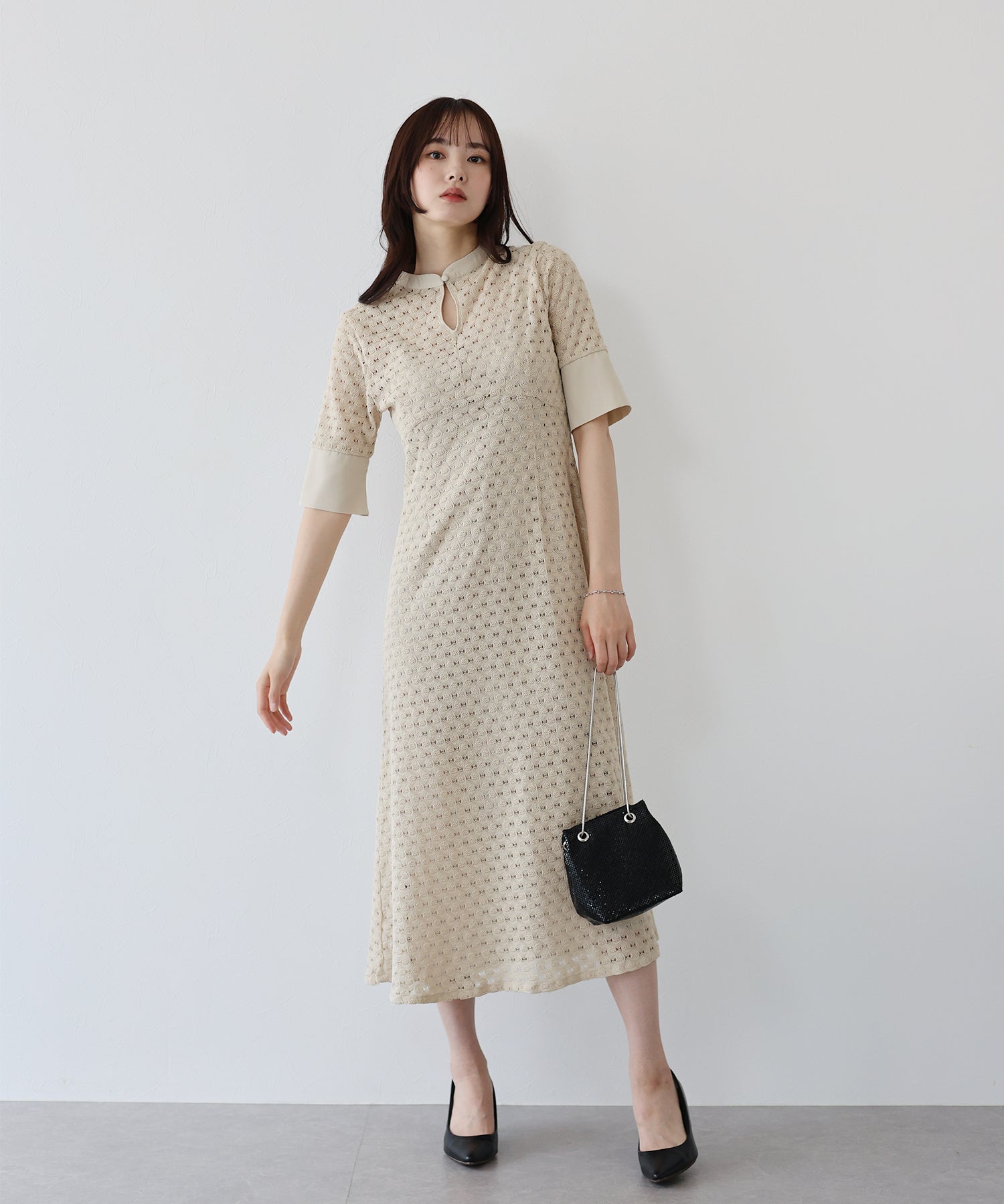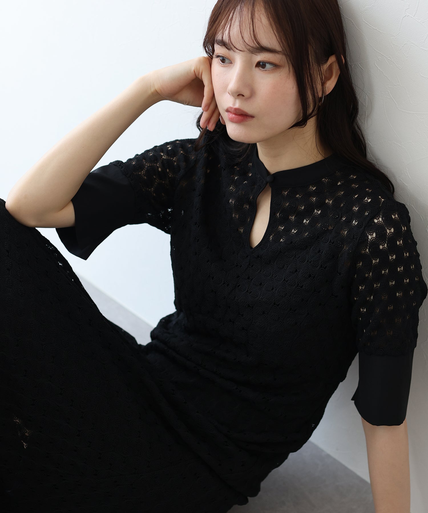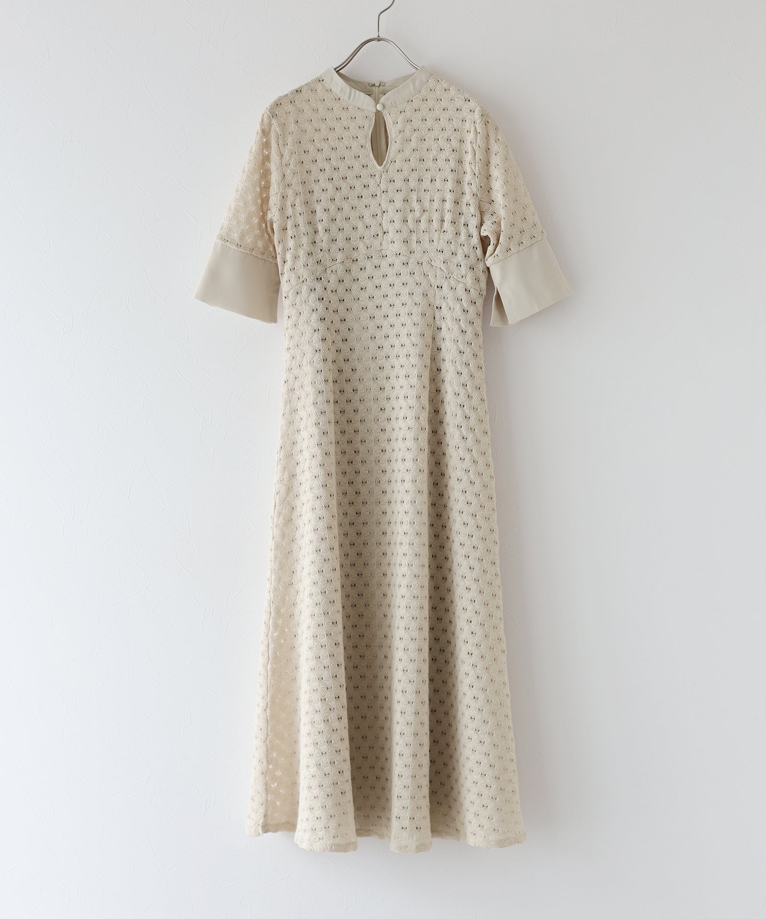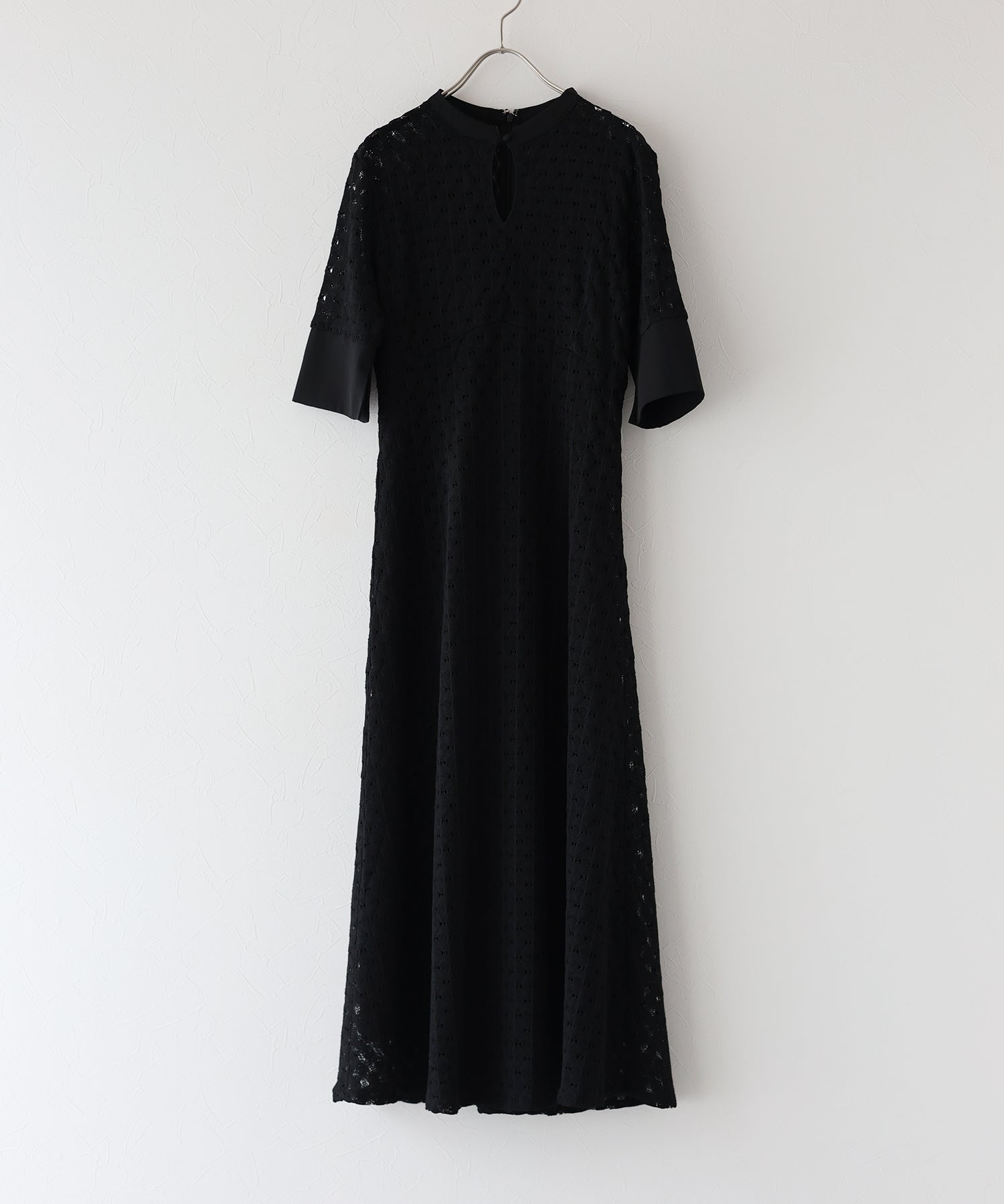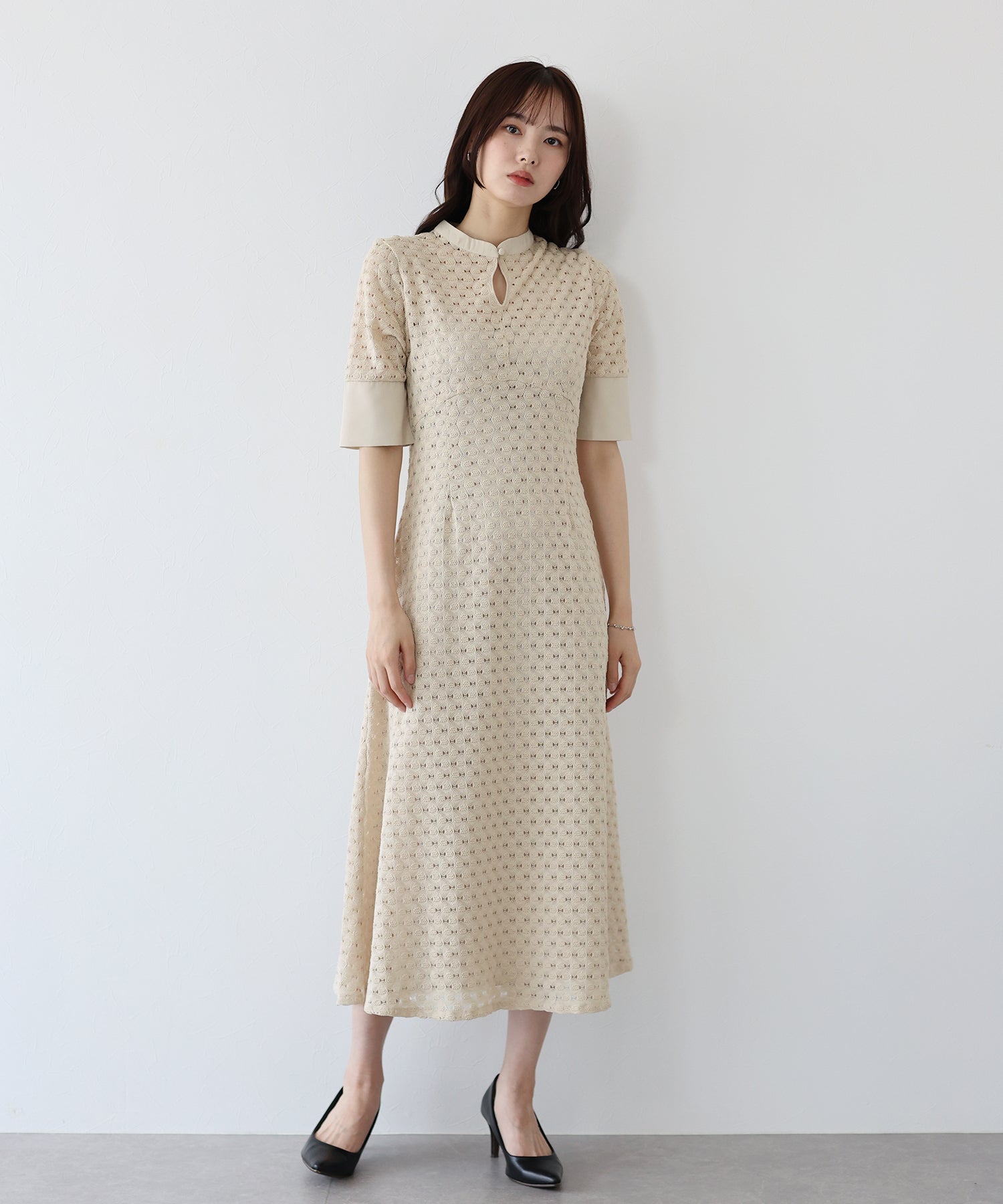 ?POINT スタンドネックと上品な胸元あきが総レースながらもモードに見せてくれる1着。 襟ぐりと袖には異素材を使用し、デザイン性をプラス。高めのウエスト切り替えでスタイルアップ効果も。 袖はすっきりと袖口に向かってフレアスリーブのシルエットがトレンド感のあるデザインで、膨らみのあるバルファスレースの柄が着映えする一枚です。