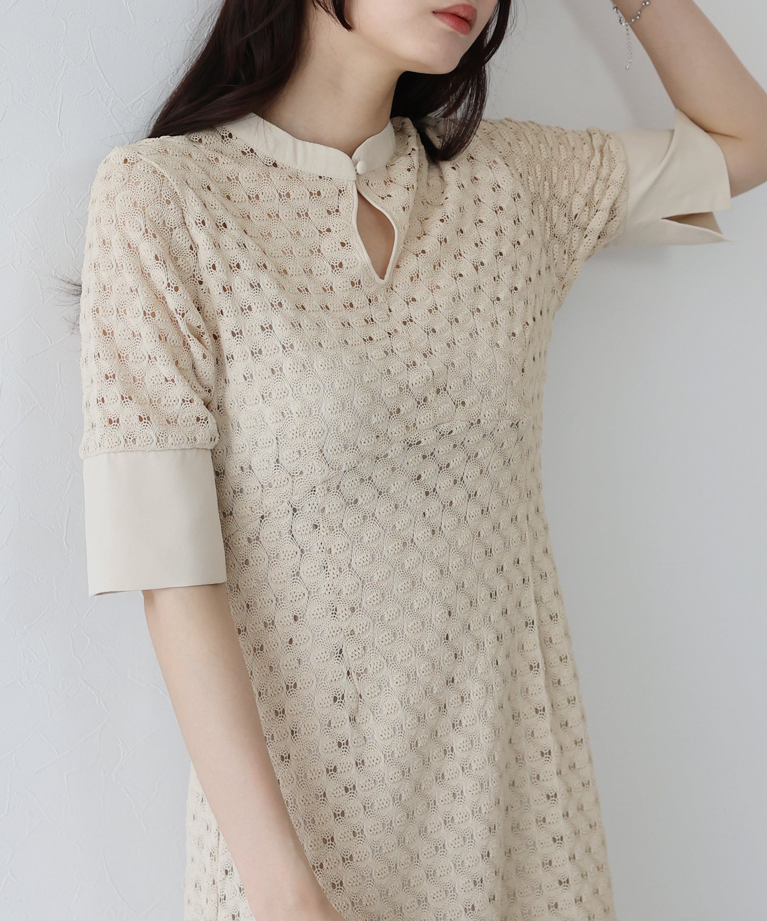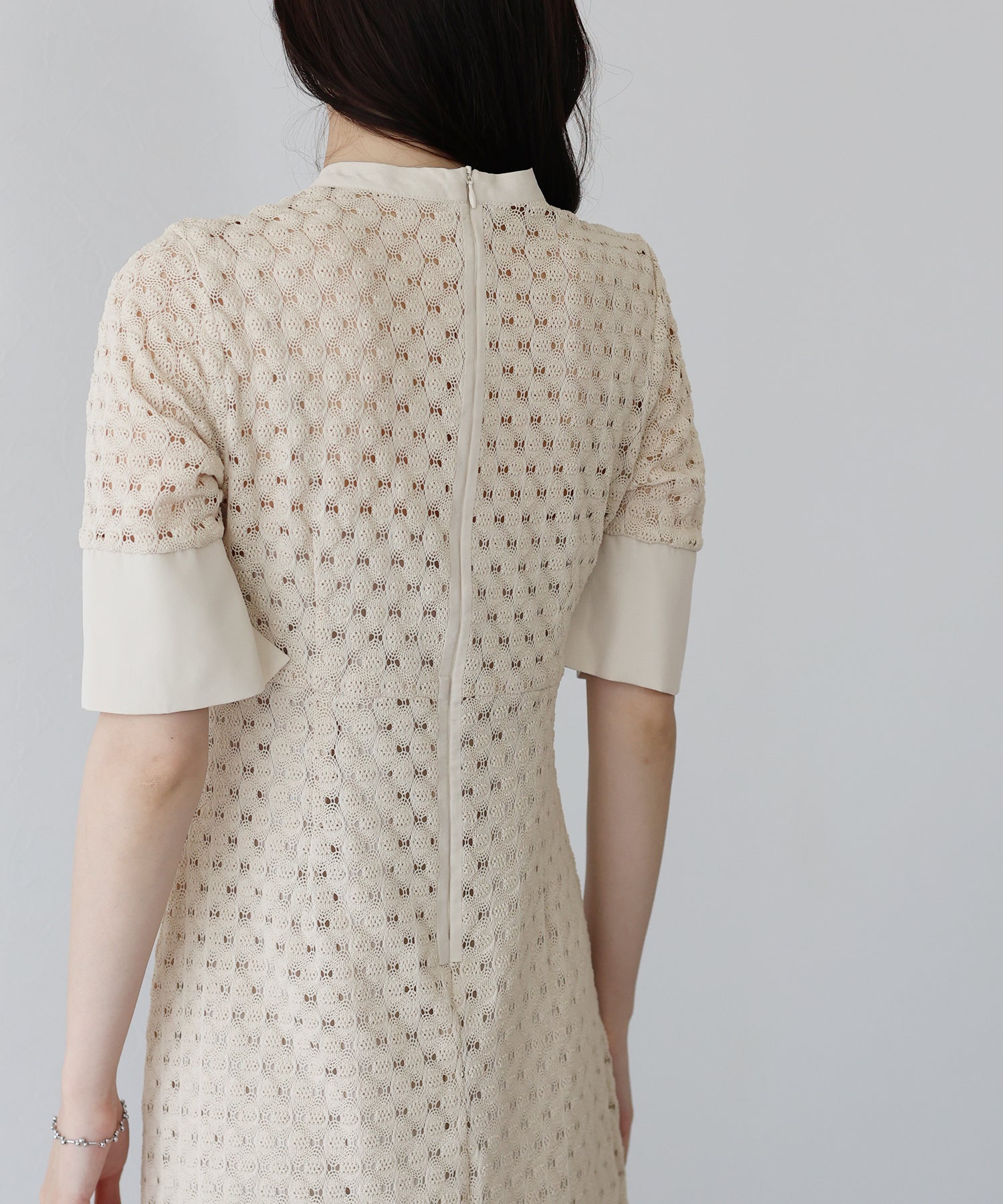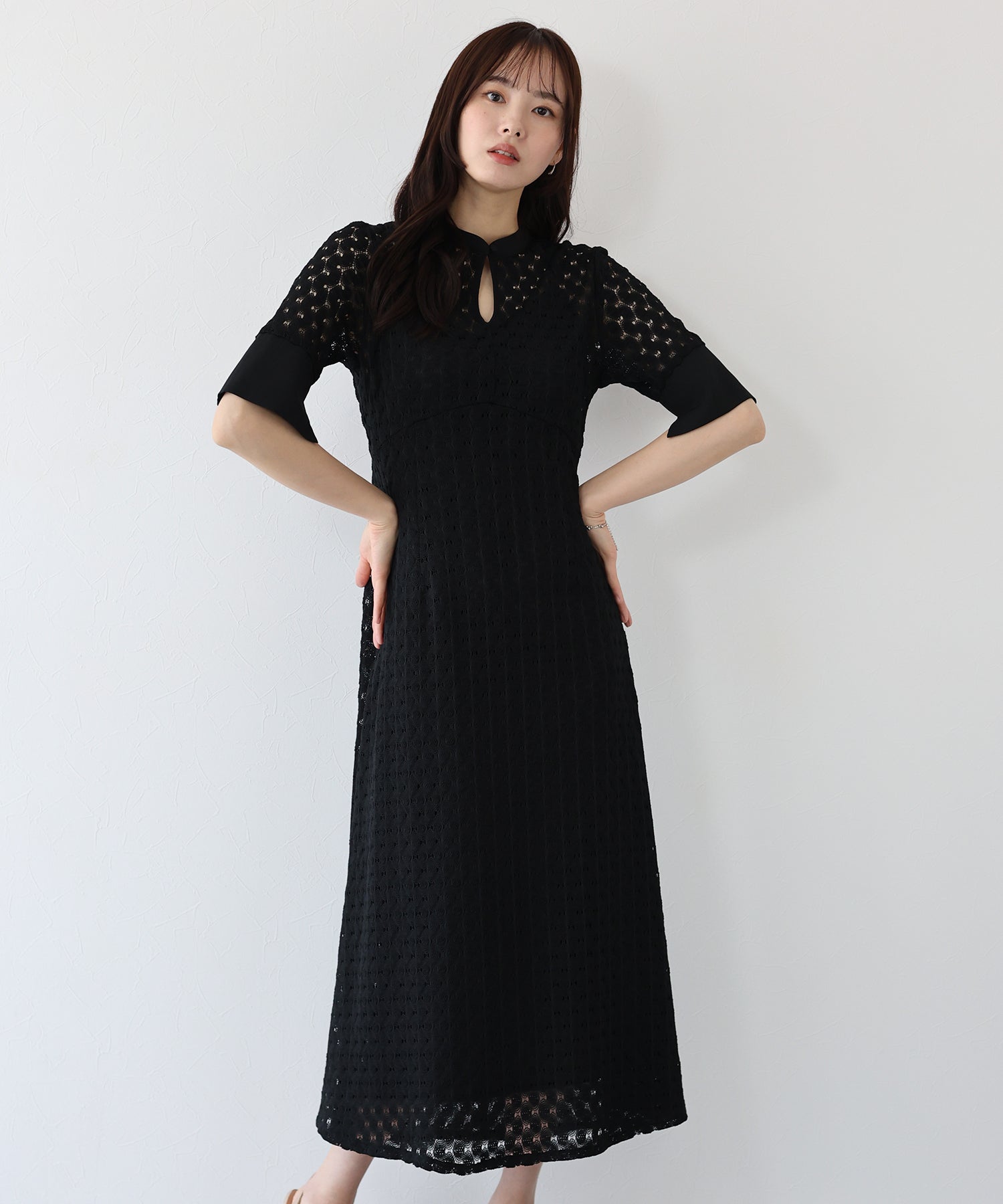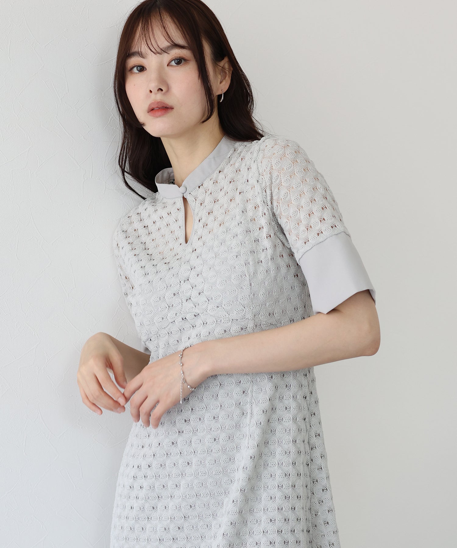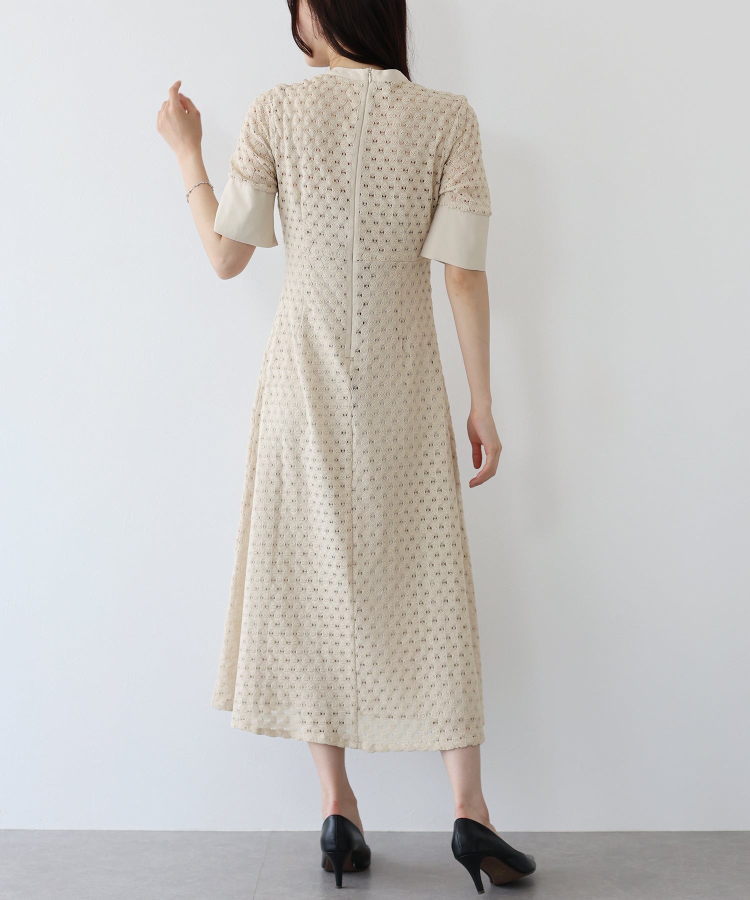 ?POINT スタンドネックと上品な胸元あきが総レースながらもモードに見せてくれる1着。 襟ぐりと袖には異素材を使用し、デザイン性をプラス。高めのウエスト切り替えでスタイルアップ効果も。 袖はすっきりと袖口に向かってフレアスリーブのシルエットがトレンド感のあるデザインで、膨らみのあるバルファスレースの柄が着映えする一枚です。