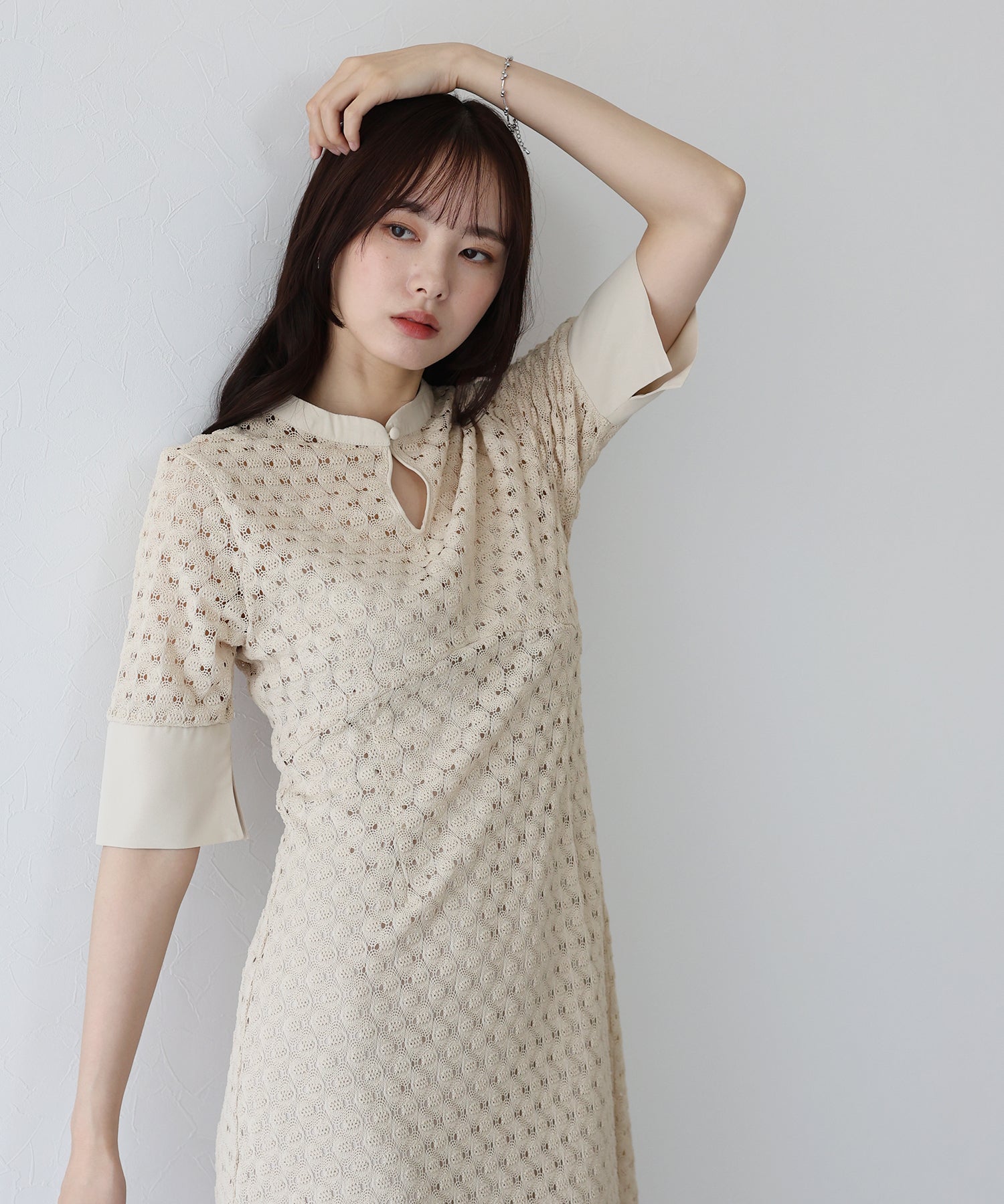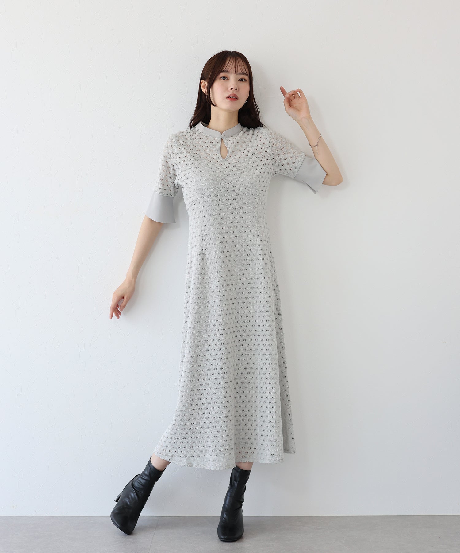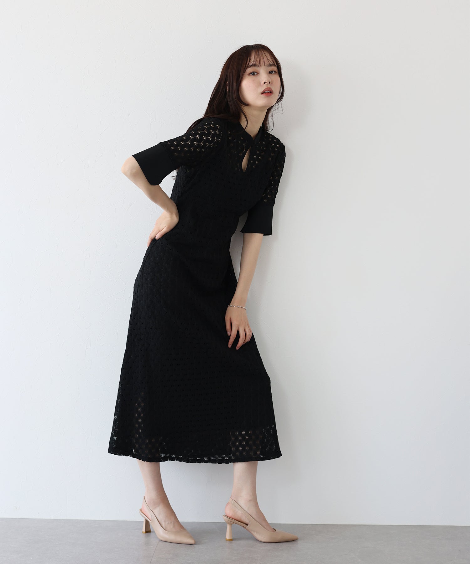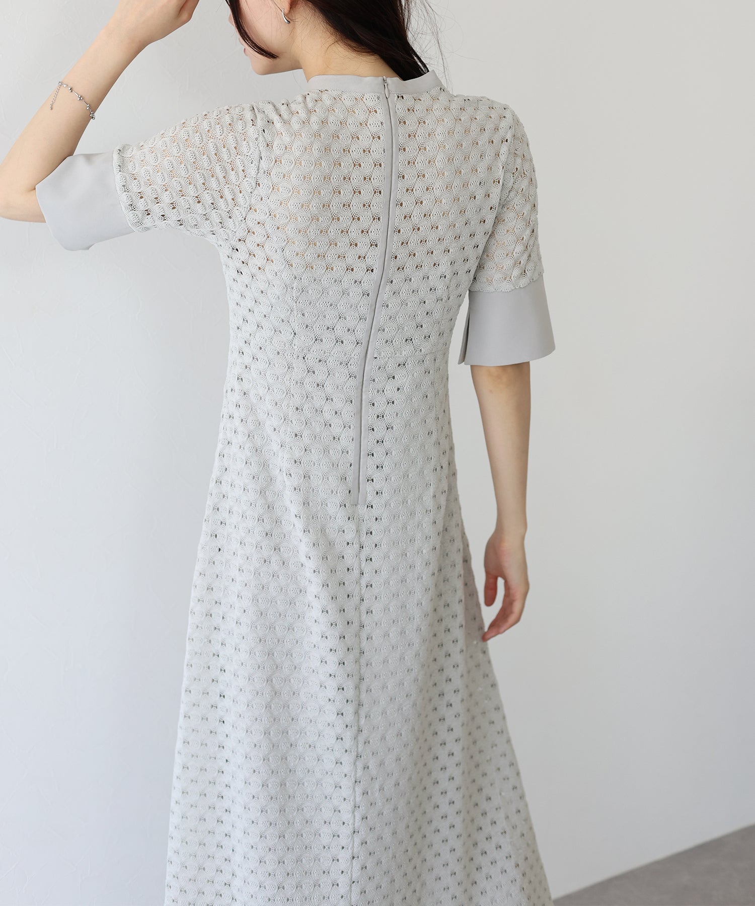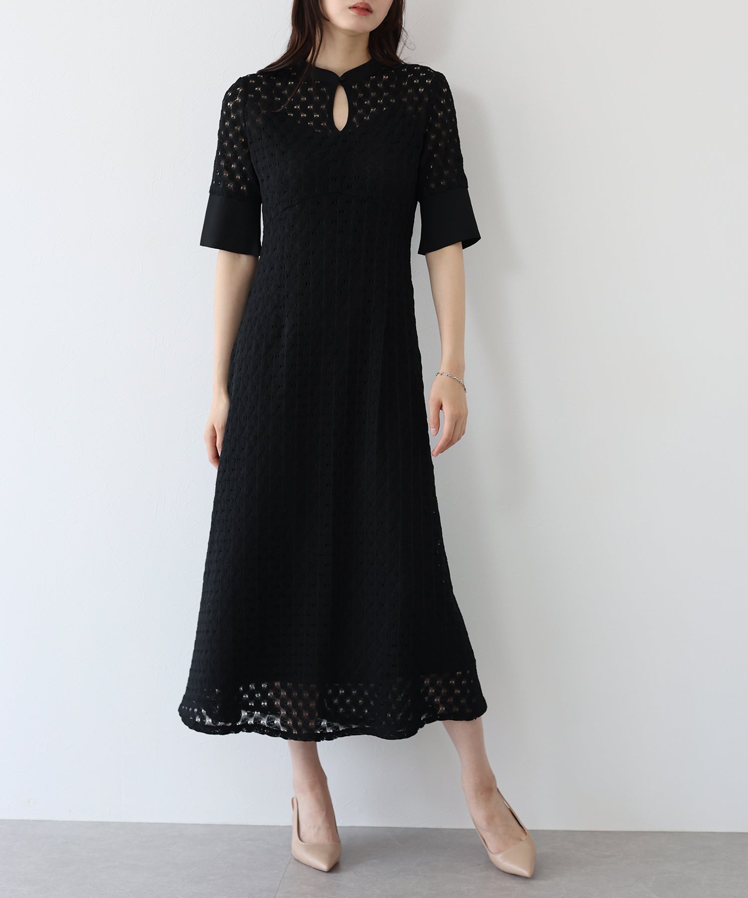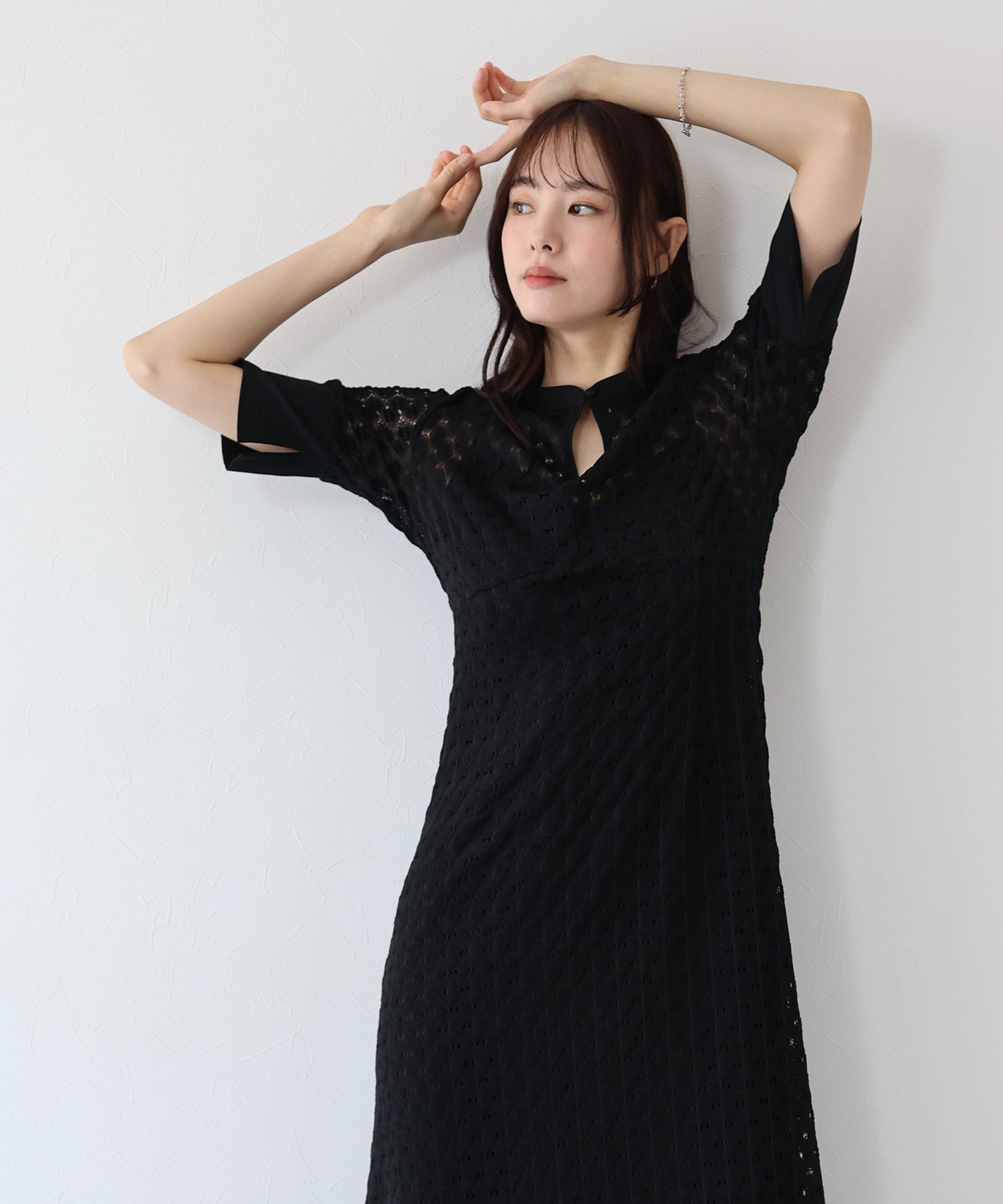 ?POINT スタンドネックと上品な胸元あきが総レースながらもモードに見せてくれる1着。 襟ぐりと袖には異素材を使用し、デザイン性をプラス。高めのウエスト切り替えでスタイルアップ効果も。 袖はすっきりと袖口に向かってフレアスリーブのシルエットがトレンド感のあるデザインで、膨らみのあるバルファスレースの柄が着映えする一枚です。