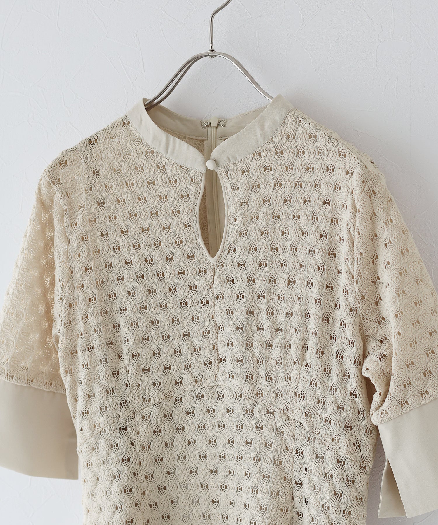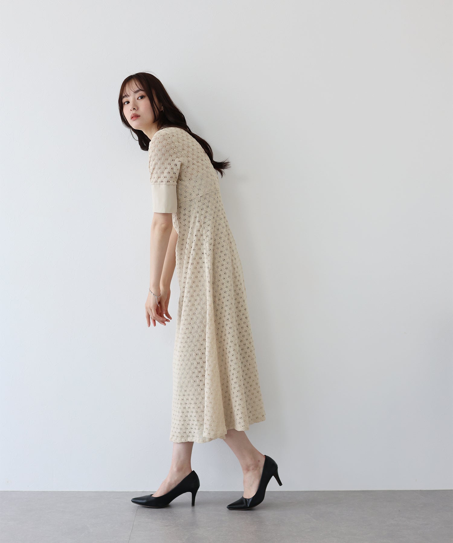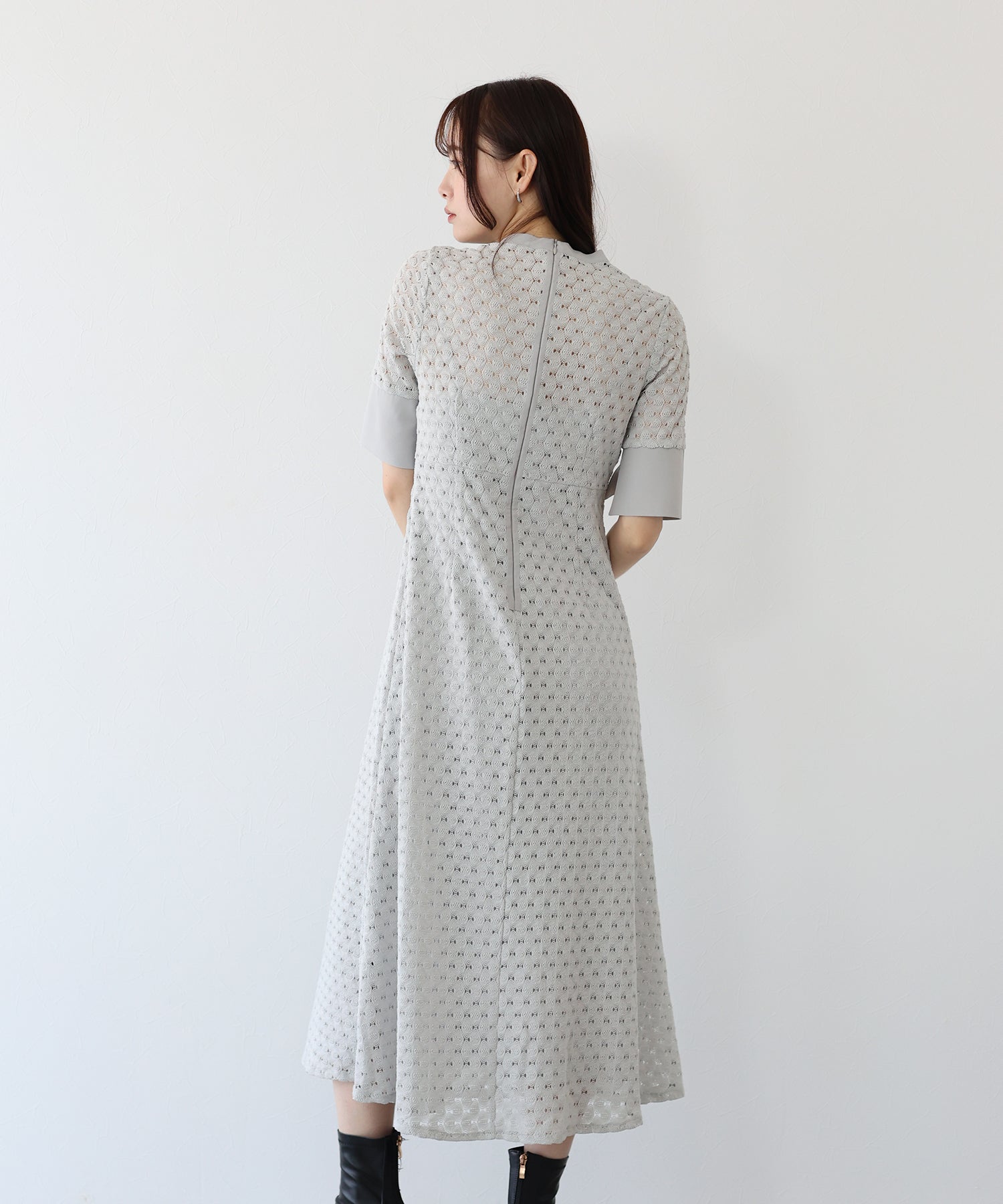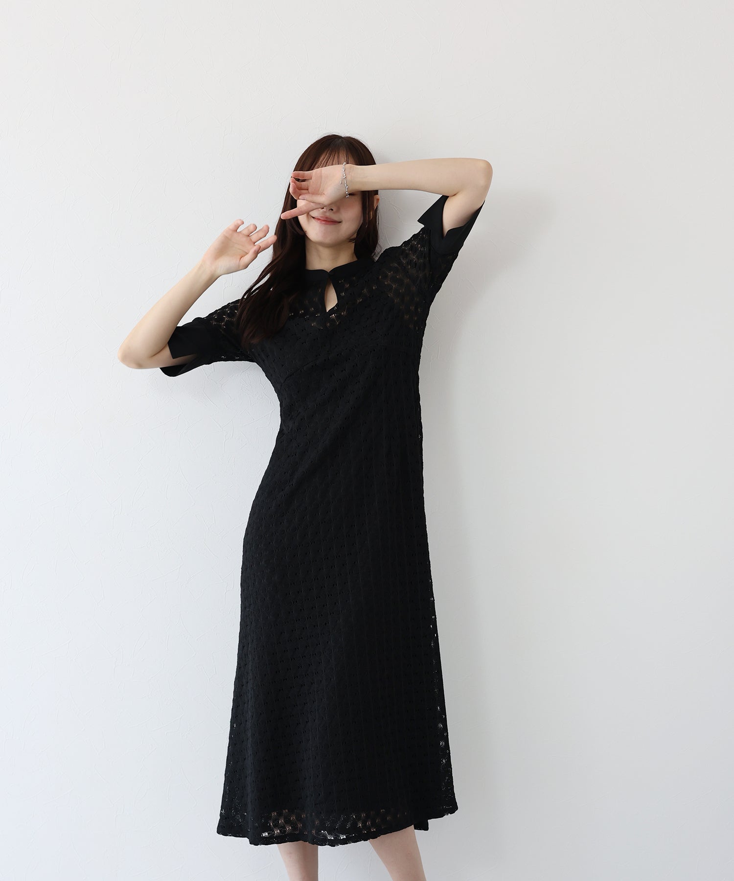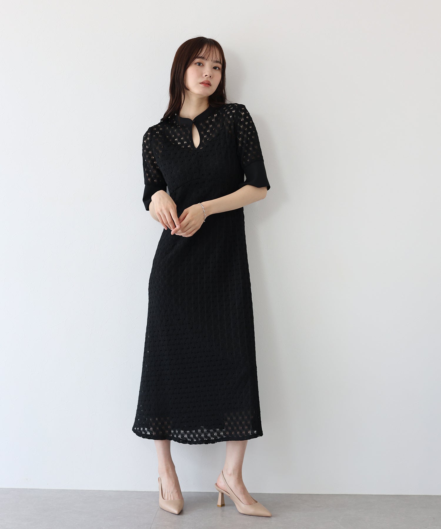?POINT スタンドネックと上品な胸元あきが総レースながらもモードに見せてくれる1着。 襟ぐりと袖には異素材を使用し、デザイン性をプラス。高めのウエスト切り替えでスタイルアップ効果も。 袖はすっきりと袖口に向かってフレアスリーブのシルエットがトレンド感のあるデザインで、膨らみのあるバルファスレースの柄が着映えする一枚です。