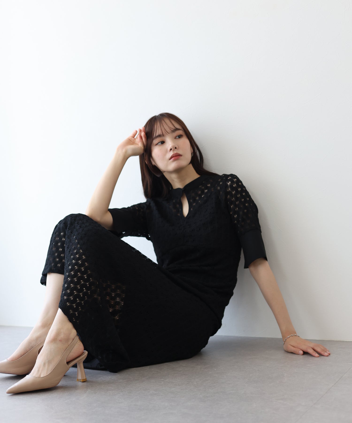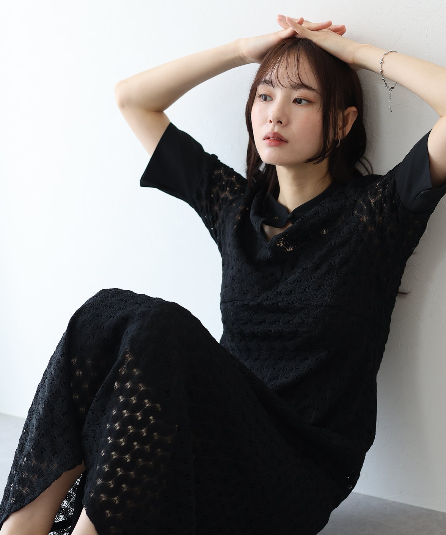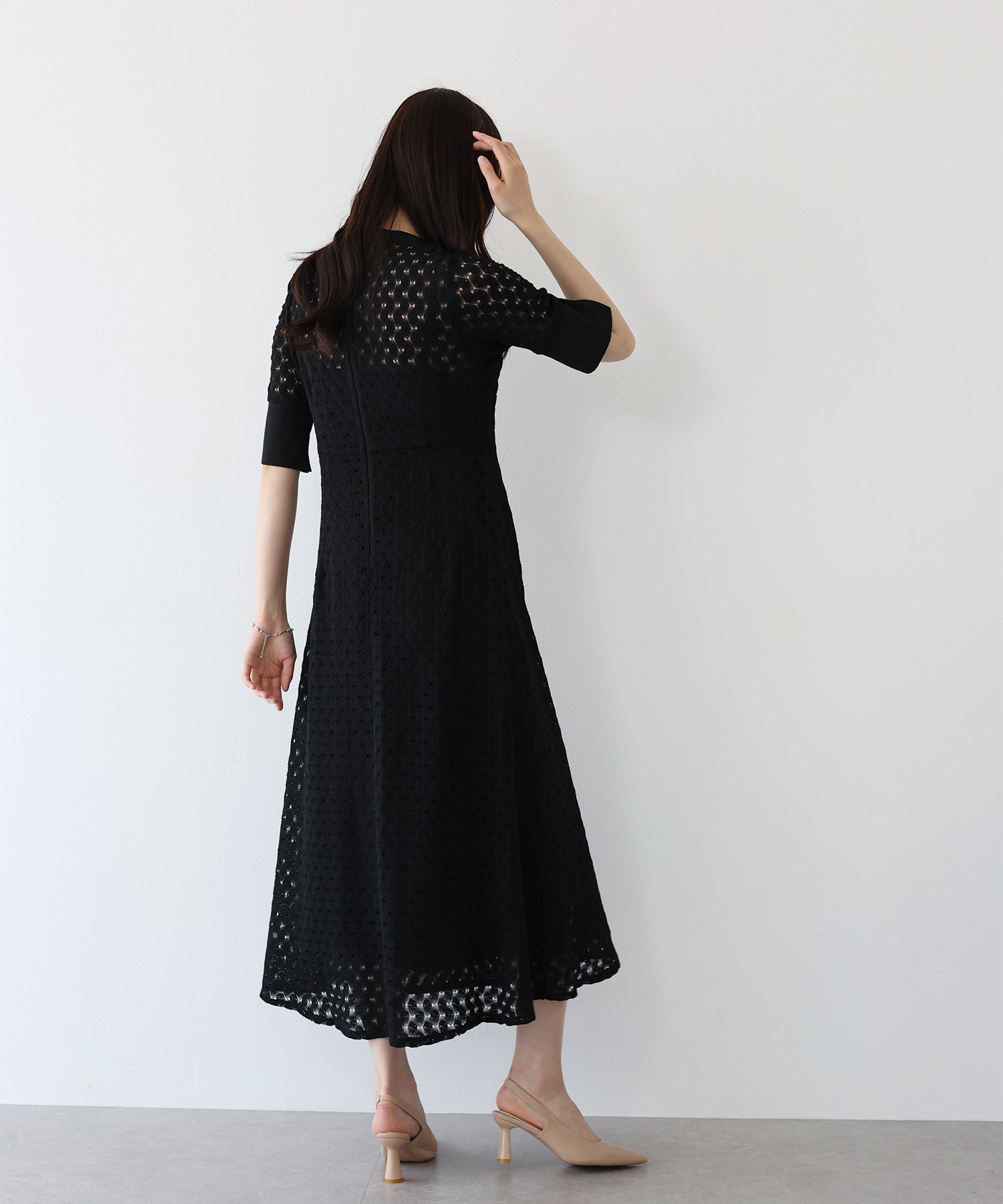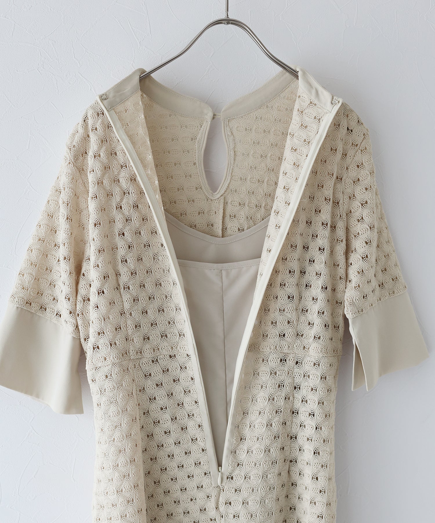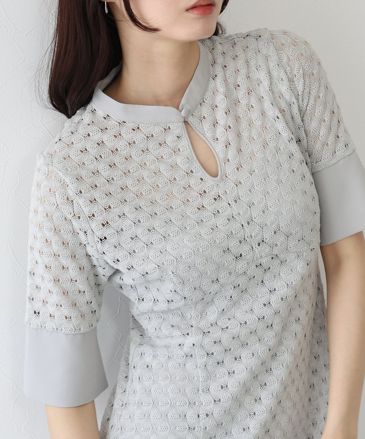 ?POINT スタンドネックと上品な胸元あきが総レースながらもモードに見せてくれる1着。 襟ぐりと袖には異素材を使用し、デザイン性をプラス。高めのウエスト切り替えでスタイルアップ効果も。 袖はすっきりと袖口に向かってフレアスリーブのシルエットがトレンド感のあるデザインで、膨らみのあるバルファスレースの柄が着映えする一枚です。