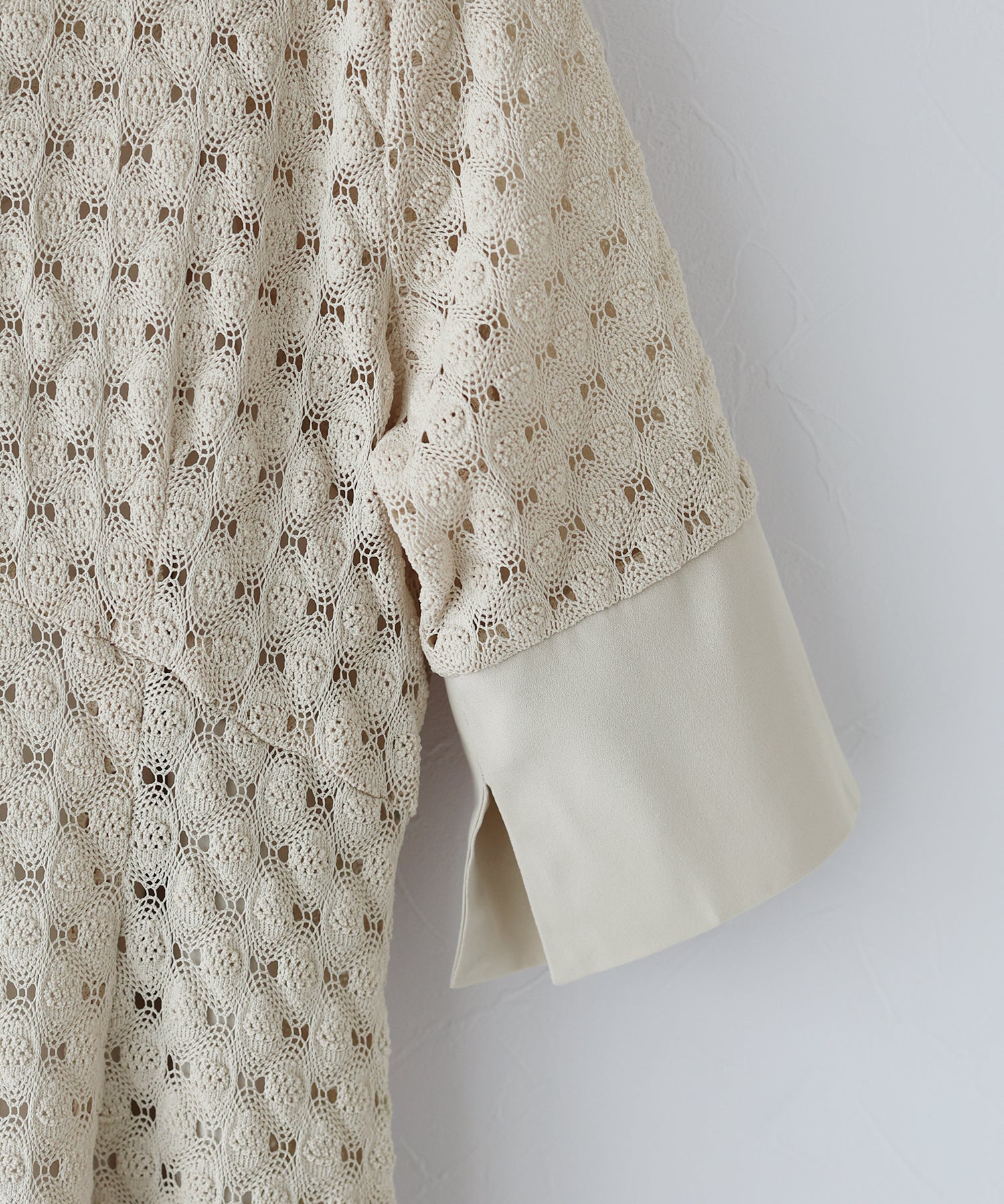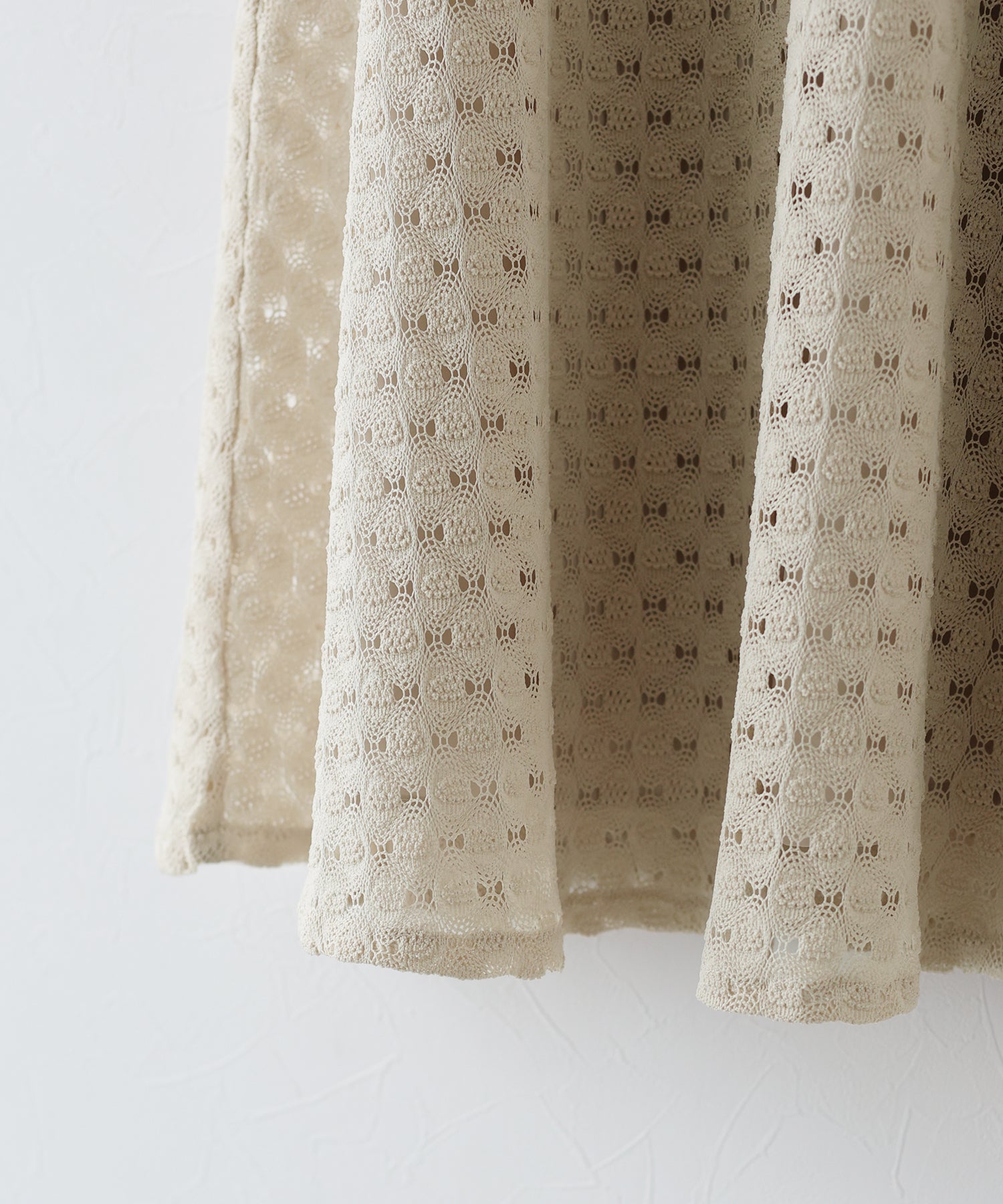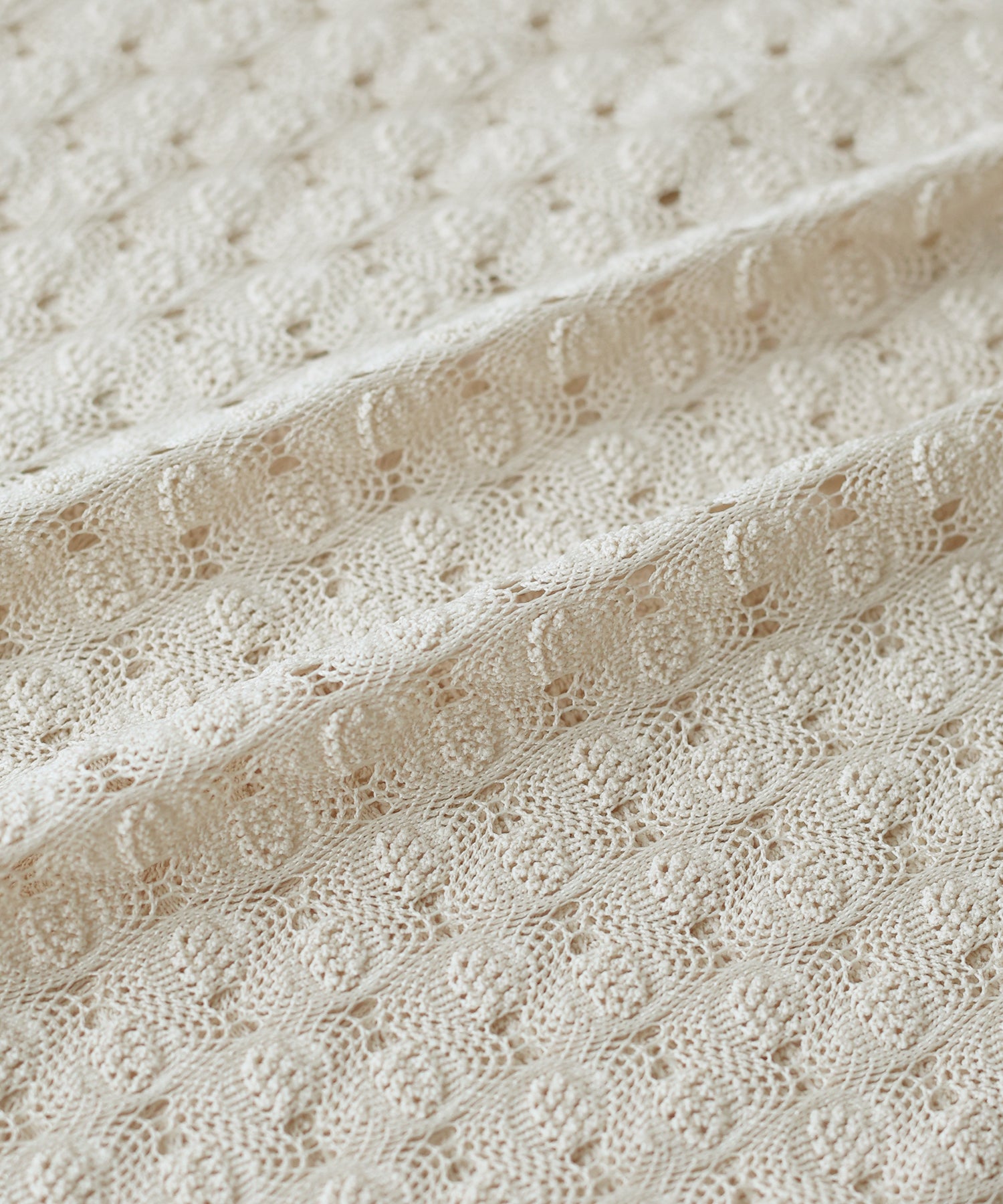 | 生地 | 国内のレース産地である福井県の希少な緯編みの機械で編んでおり、繊細で凹凸のある表情の豊かさが特徴。 とても柔らかく伸縮性が有るので、肌あたりや着心地も抜群です。