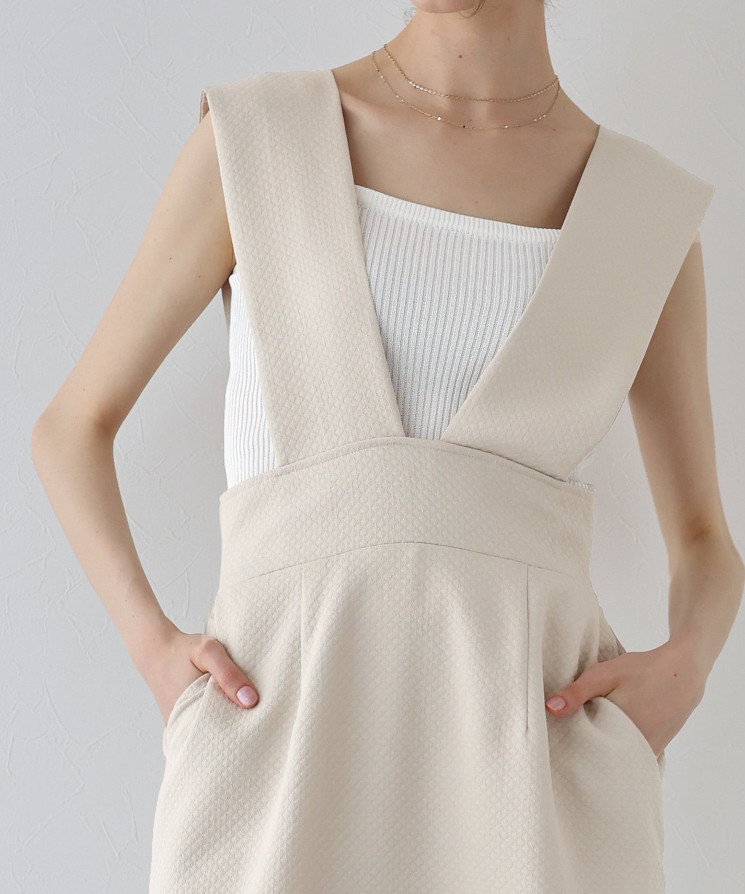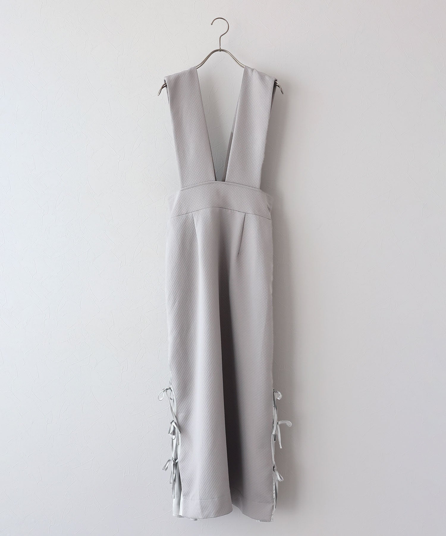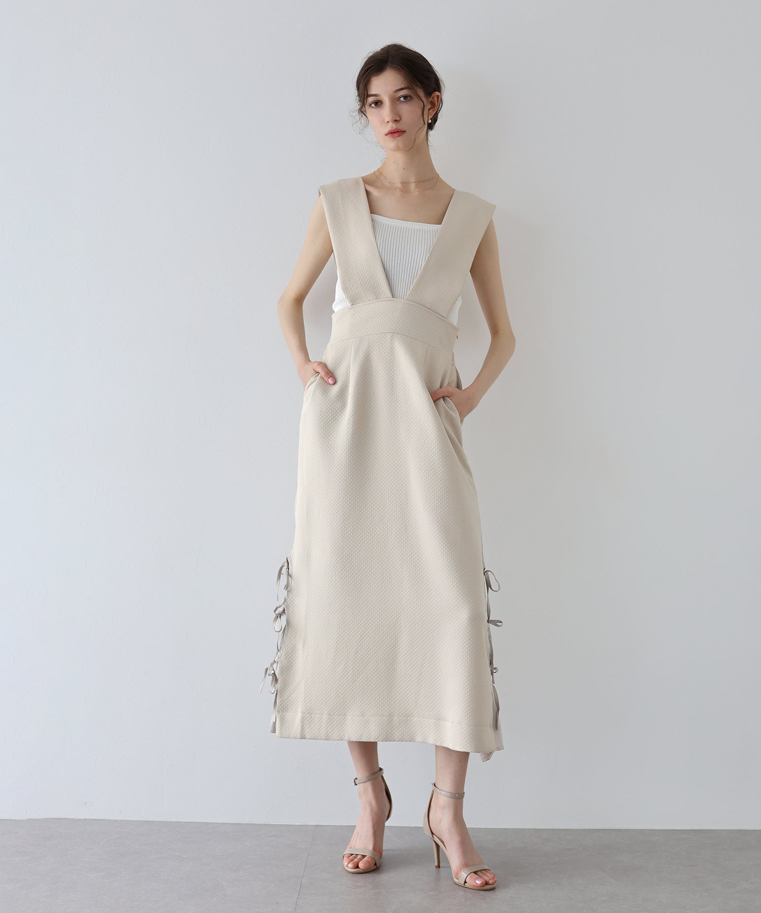 ?POINT 深めのVネックでインナーによって雰囲気を変えて楽しめるジャンスカ。 キルティングデザインでカジュアルダウンし、サイドリボンでトレンド感とフェミニンさを加えました。 ウエストバックゴムでラクに着用でき、ダーツラインとやや高めのウエストラインでシルエットをよりスタイル良く見せてくれます。 裏地と裾の切り替え部分に柔らかく肌触りの良い生地をあしらい、おしゃれなディテールと心地よさをプラス。 ウエストから広がるフレアシルエットでスタイルアップ効果を与え、サイドにはあると便利なポケット付きです。
