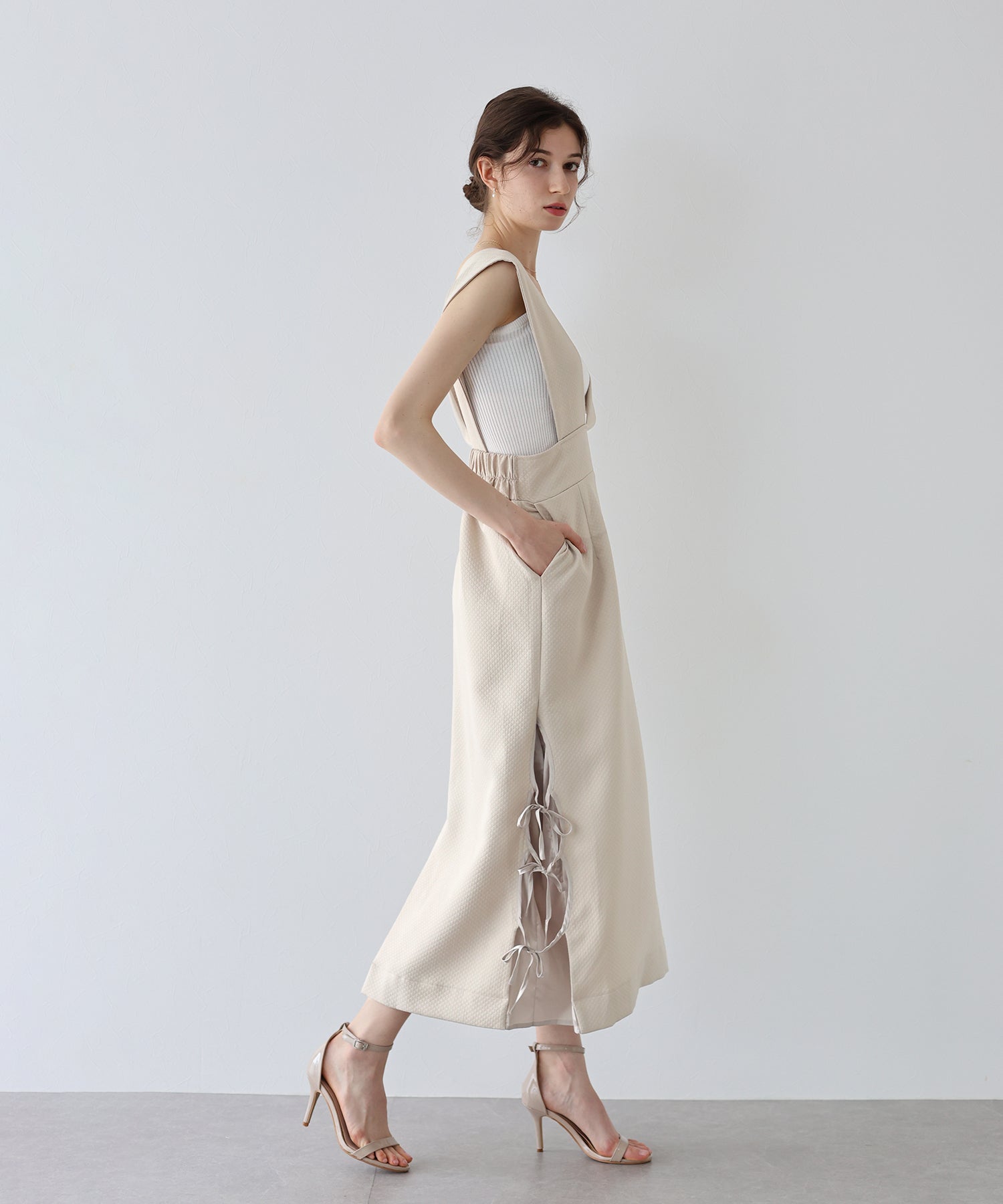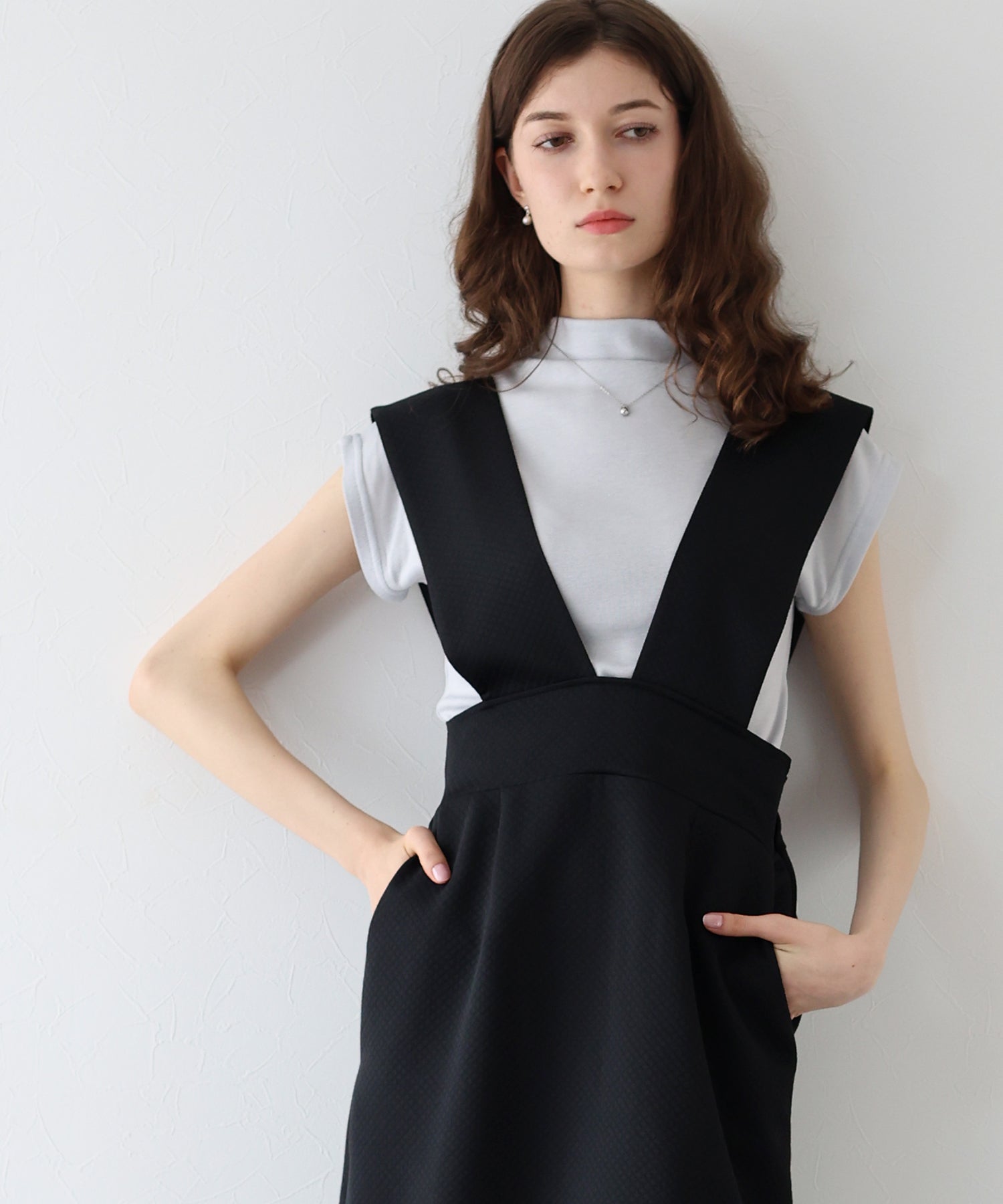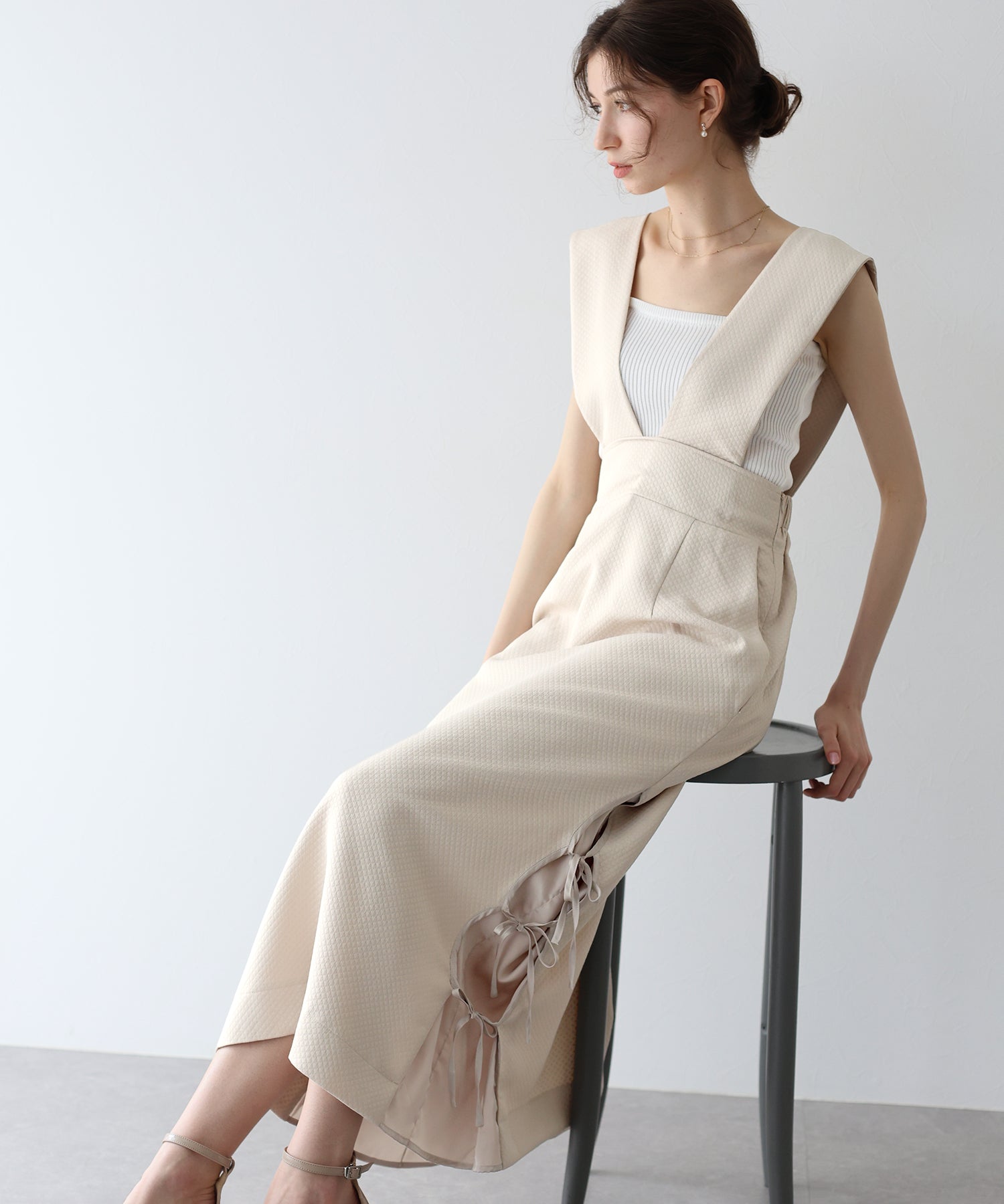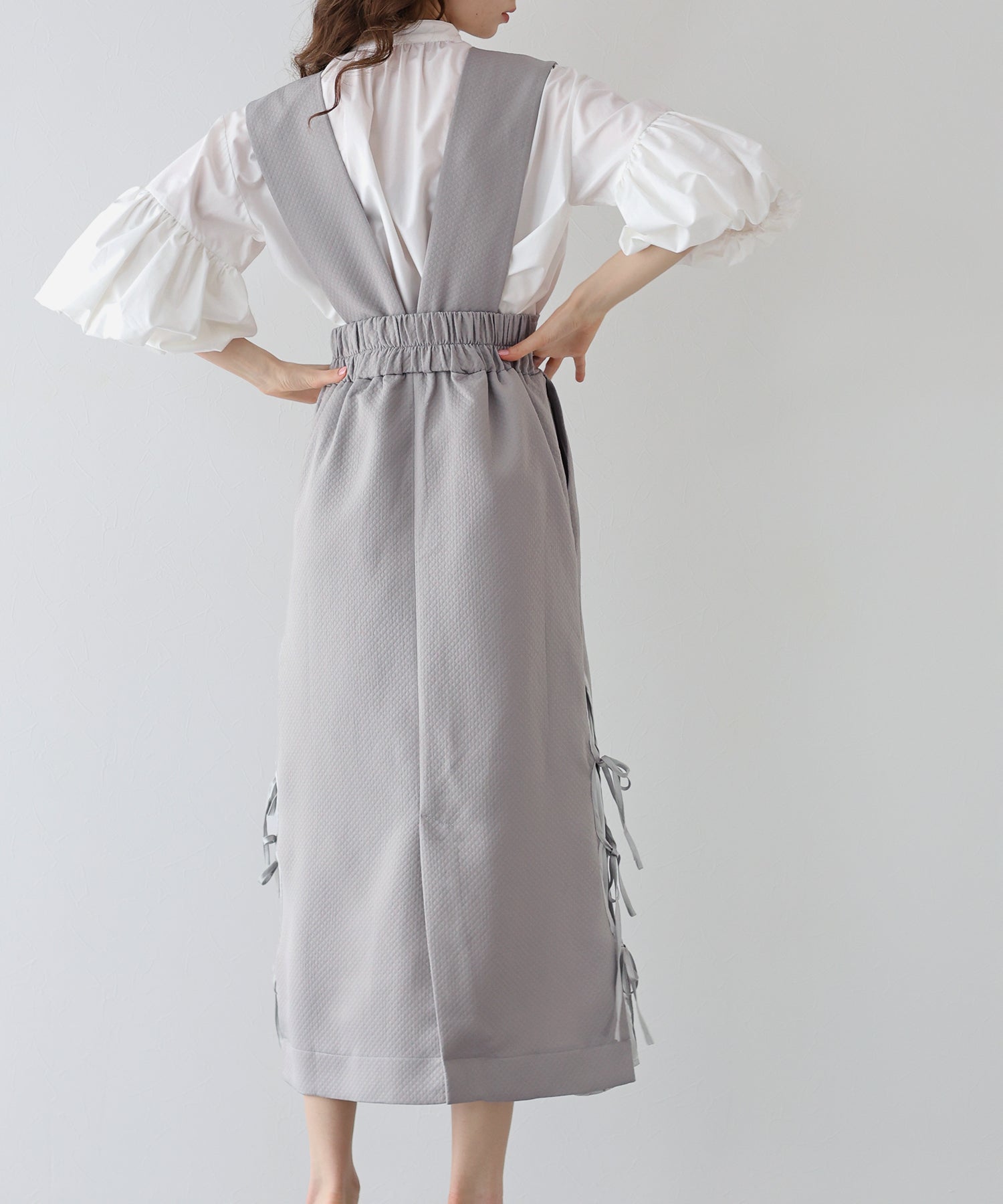 ?POINT 深めのVネックでインナーによって雰囲気を変えて楽しめるジャンスカ。 キルティングデザインでカジュアルダウンし、サイドリボンでトレンド感とフェミニンさを加えました。 ウエストバックゴムでラクに着用でき、ダーツラインとやや高めのウエストラインでシルエットをよりスタイル良く見せてくれます。 裏地と裾の切り替え部分に柔らかく肌触りの良い生地をあしらい、おしゃれなディテールと心地よさをプラス。 ウエストから広がるフレアシルエットでスタイルアップ効果を与え、サイドにはあると便利なポケット付きです。