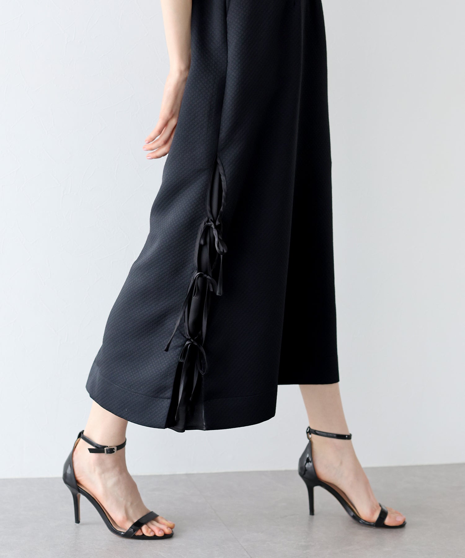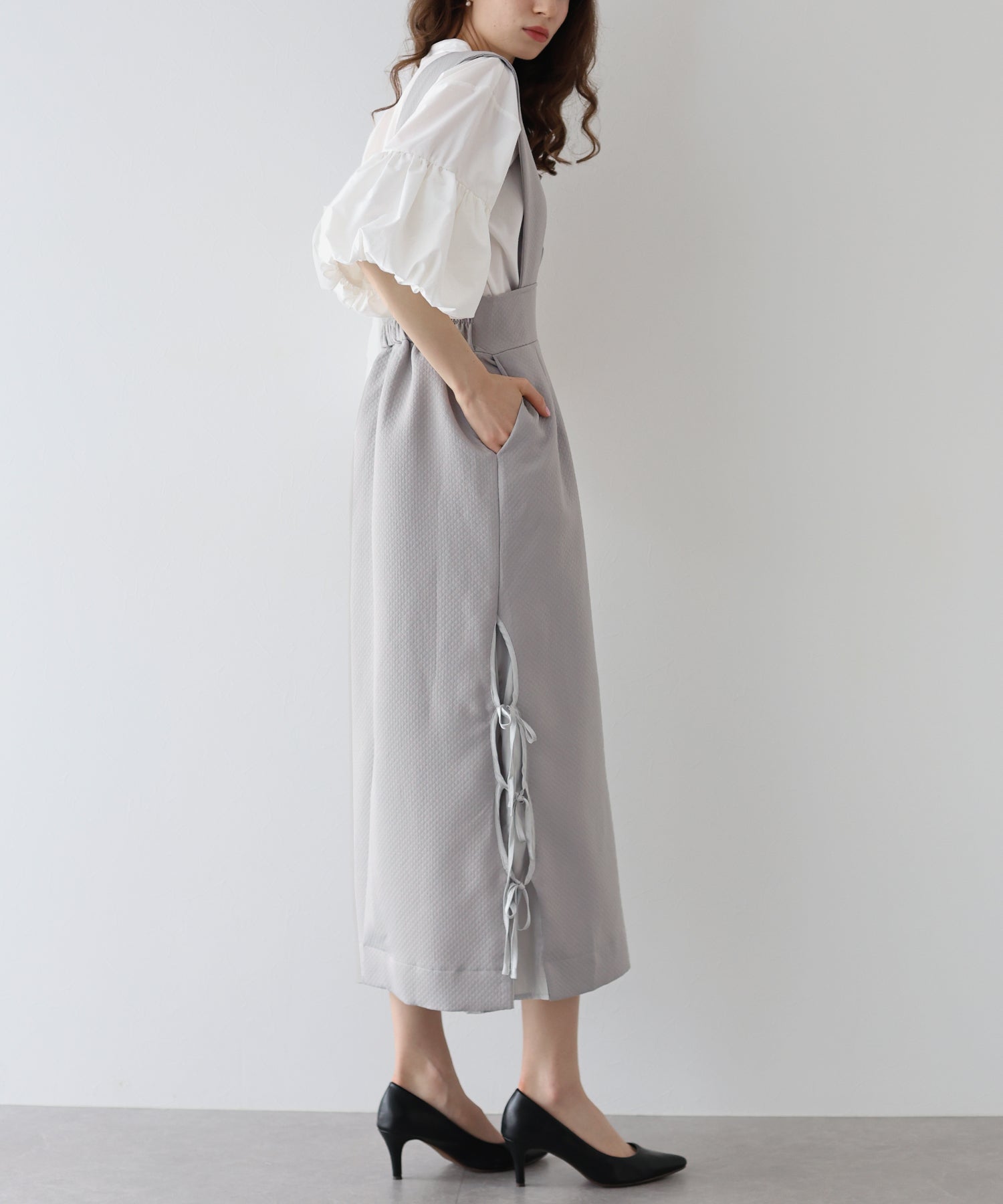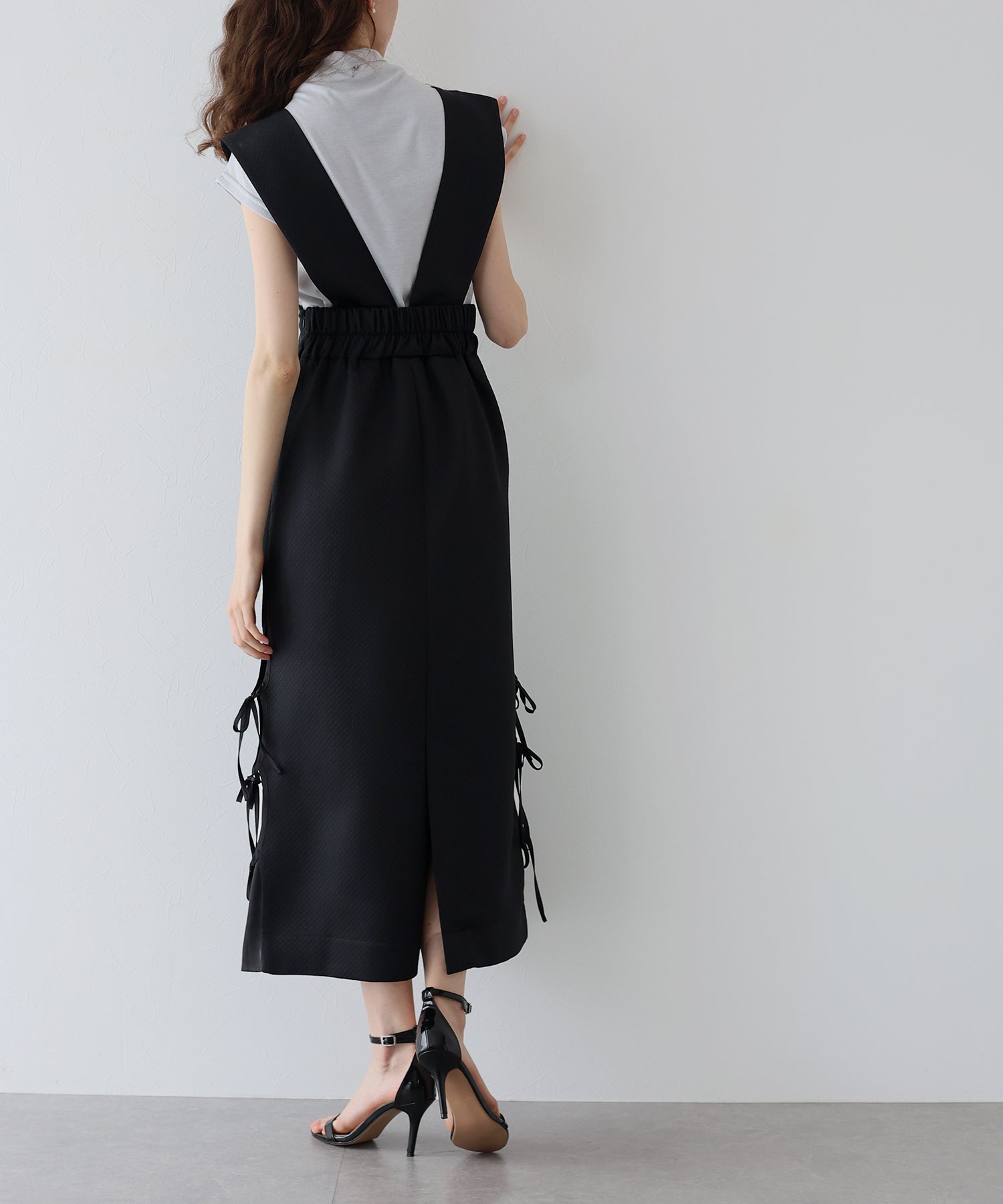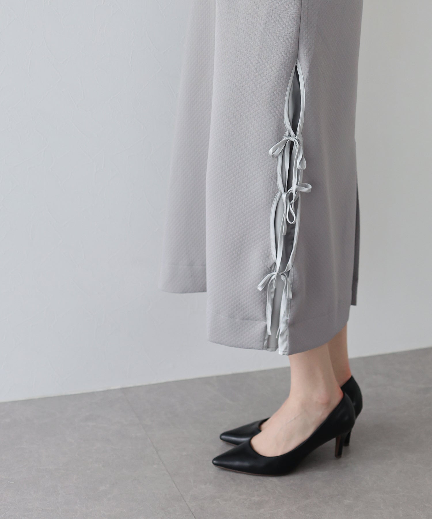 ?DETAIL ポケットあり 裏地あり サイド裾リボン スカート部分ダーツライン入り キルティングデザイン バックスリット入り ウエストバックゴム入り サイドファスナー付き