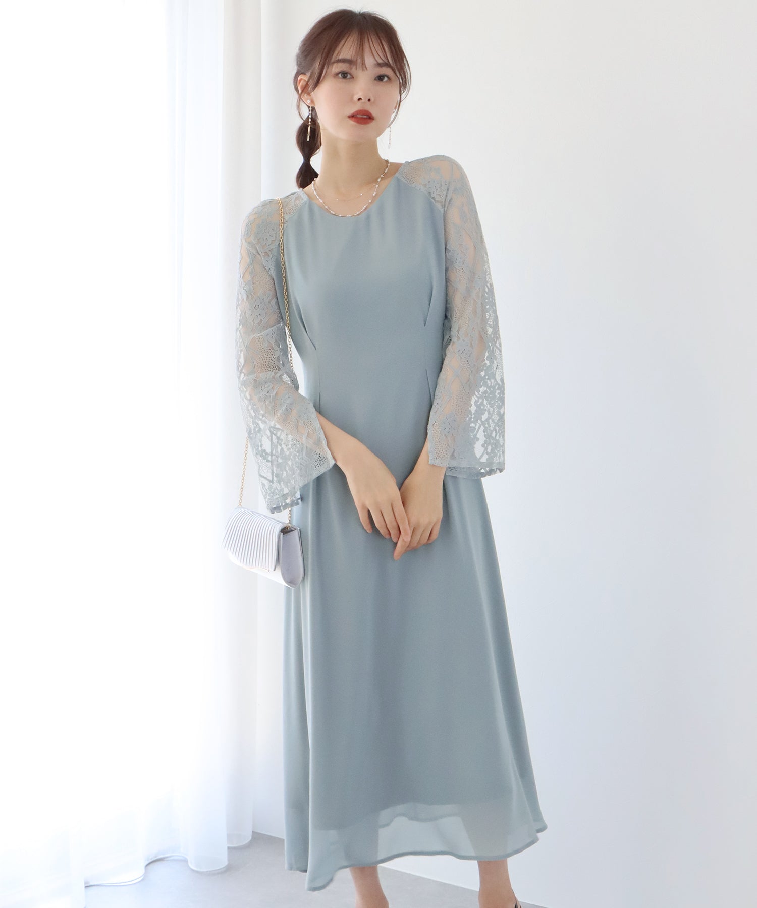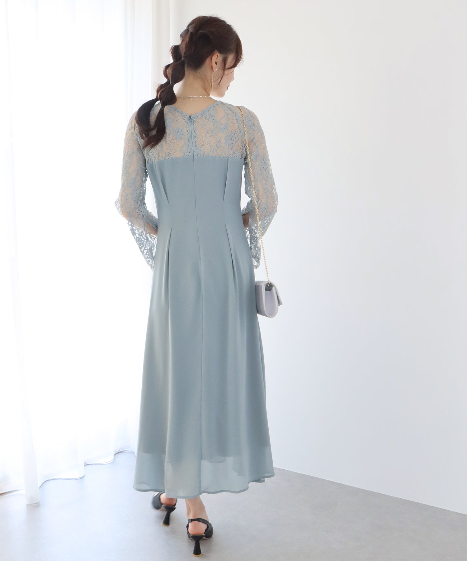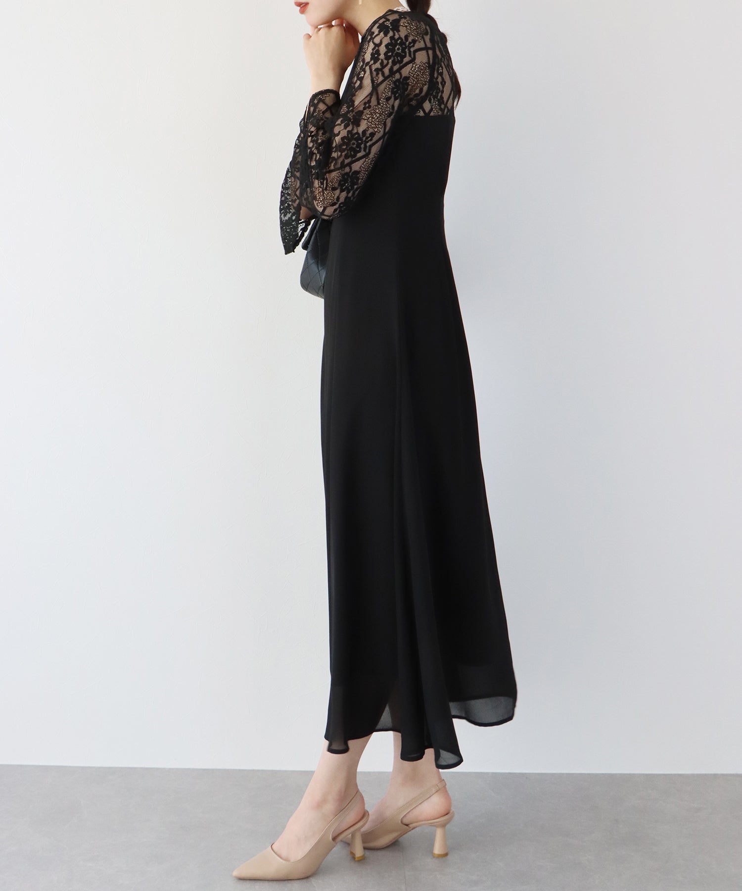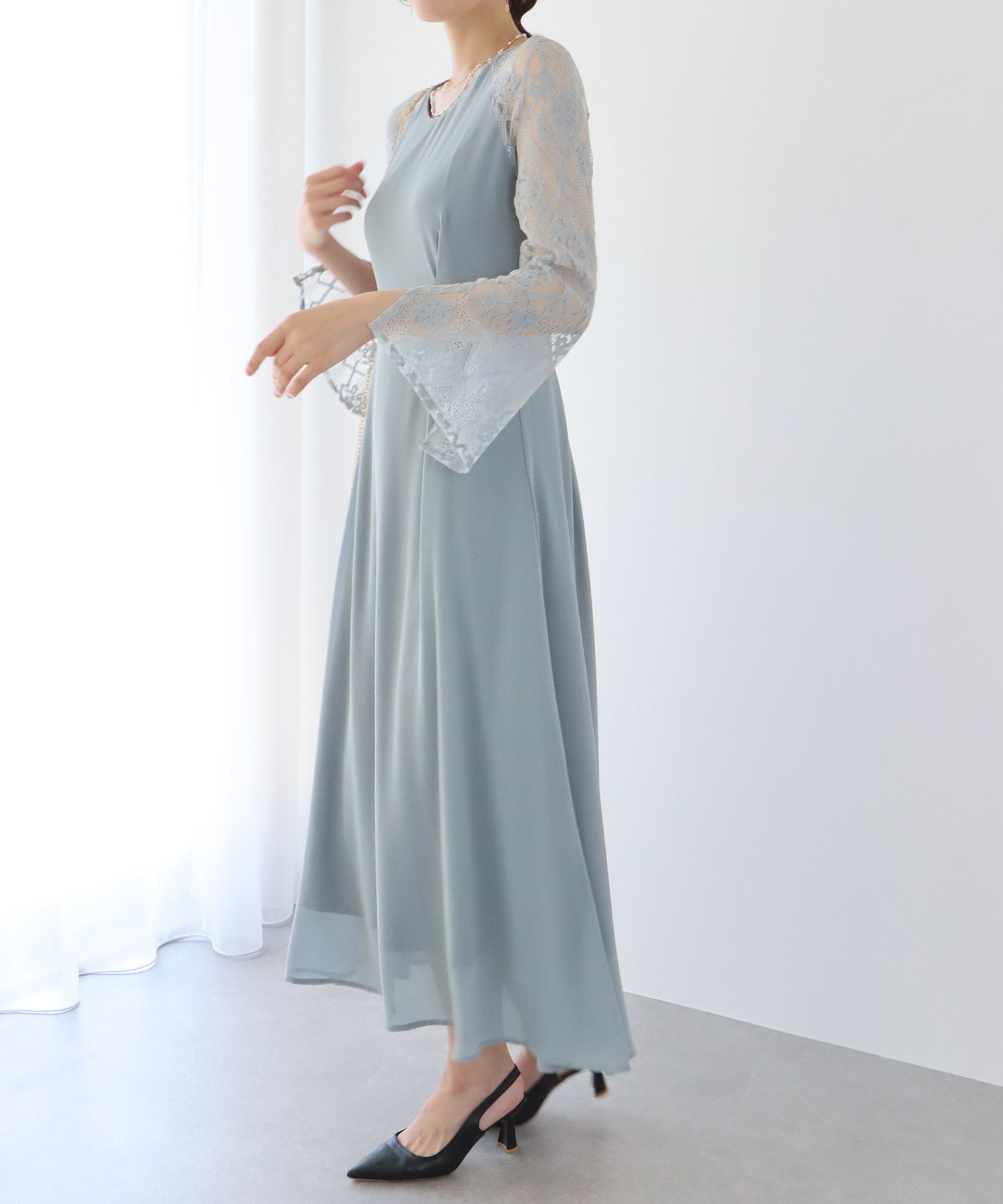 レースと軽やかなシフォン素材を使用したロング丈パーティードレス。