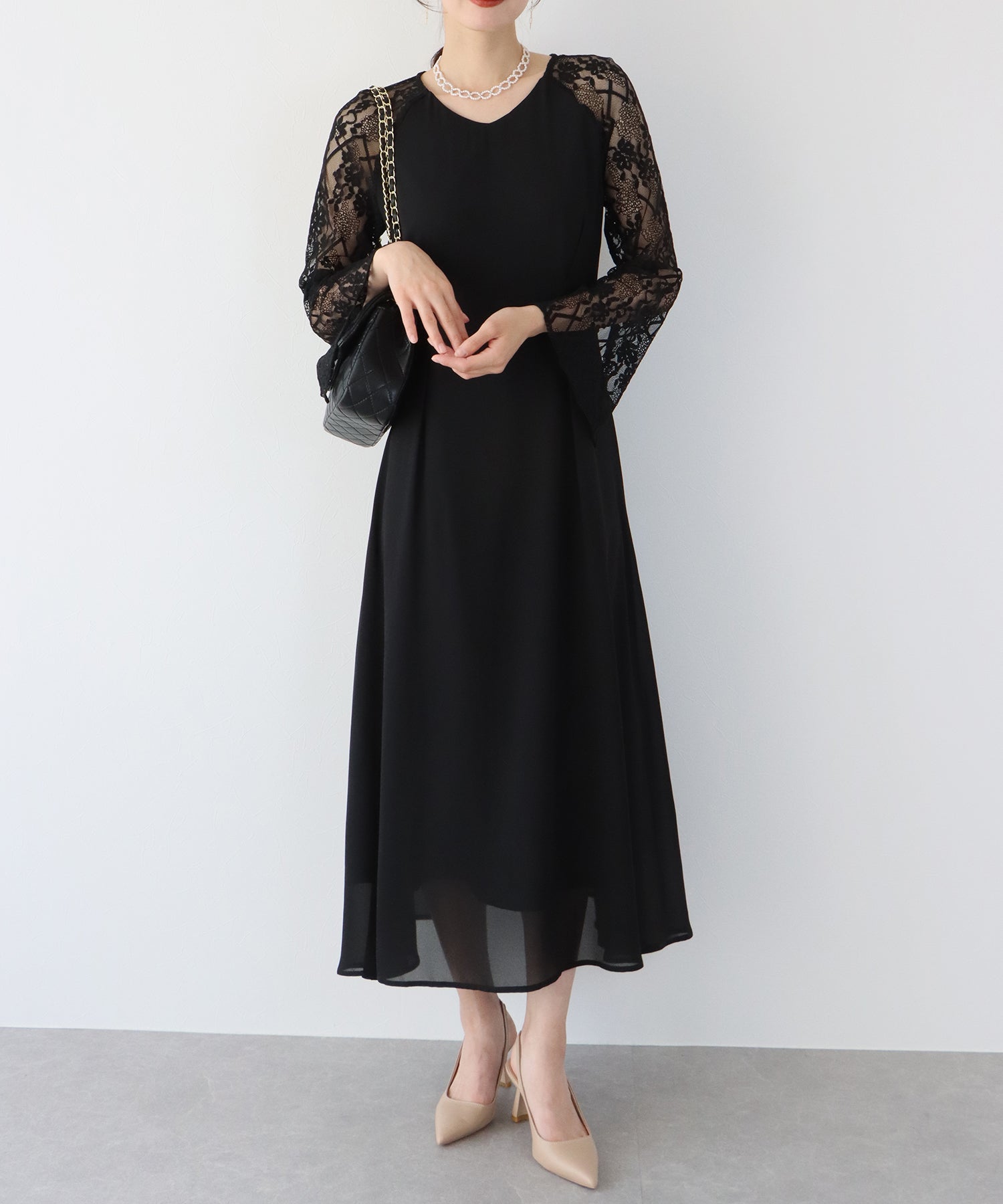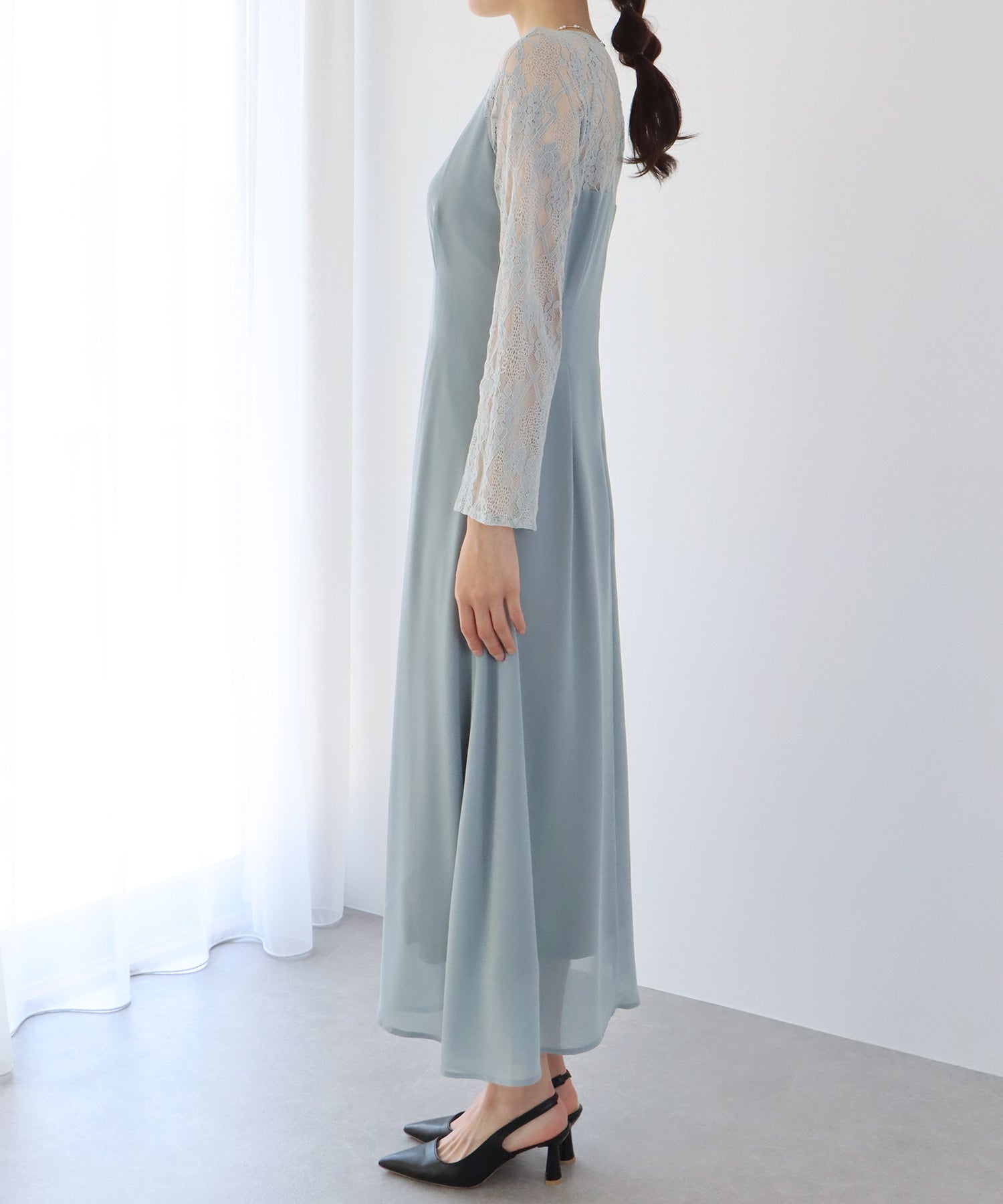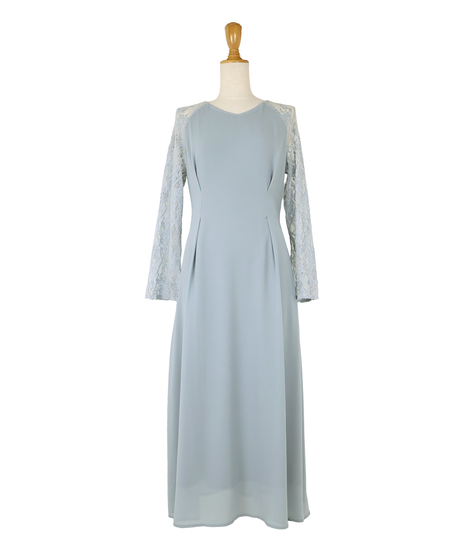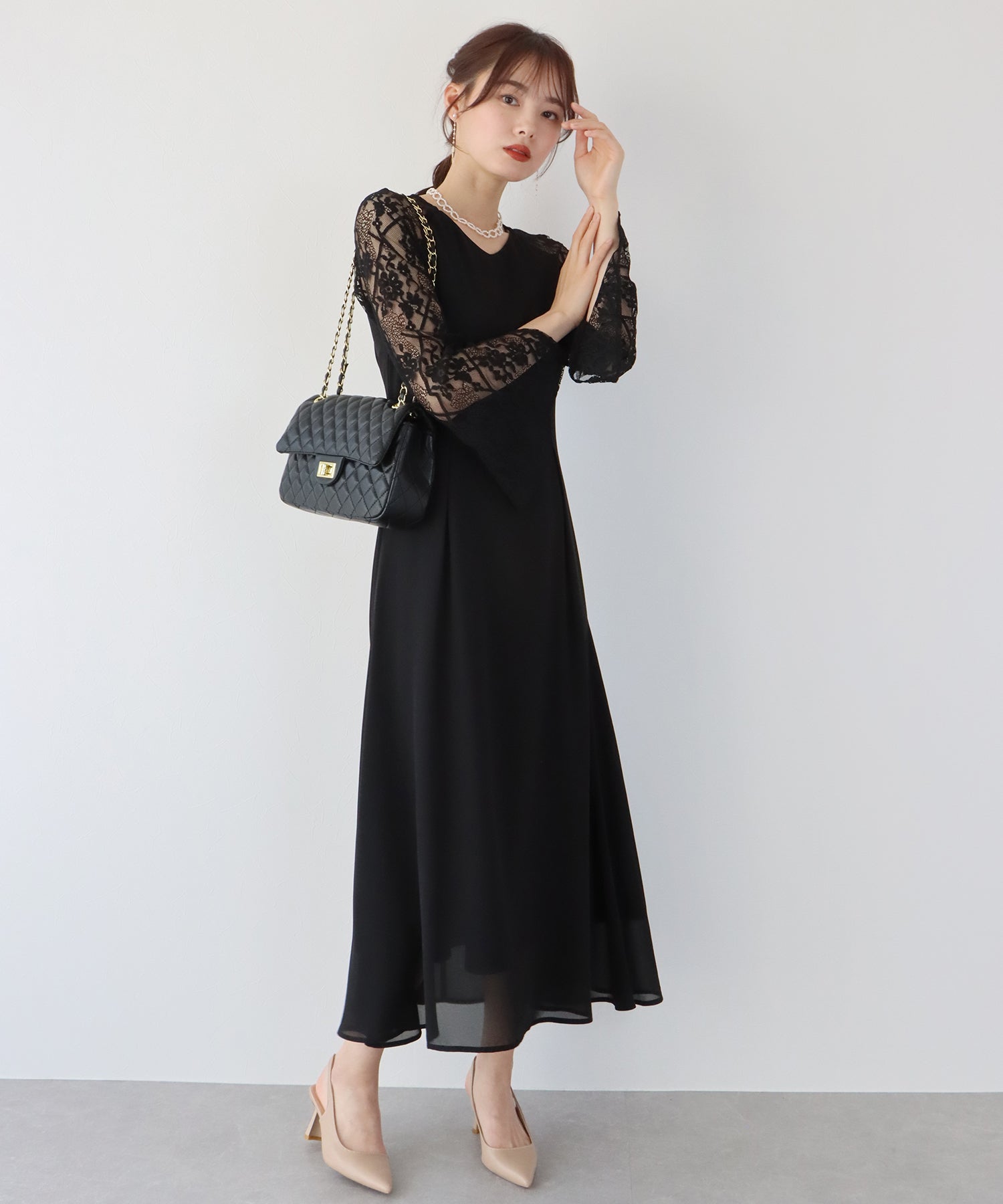 レースと軽やかなシフォン素材を使用したロング丈パーティードレス。