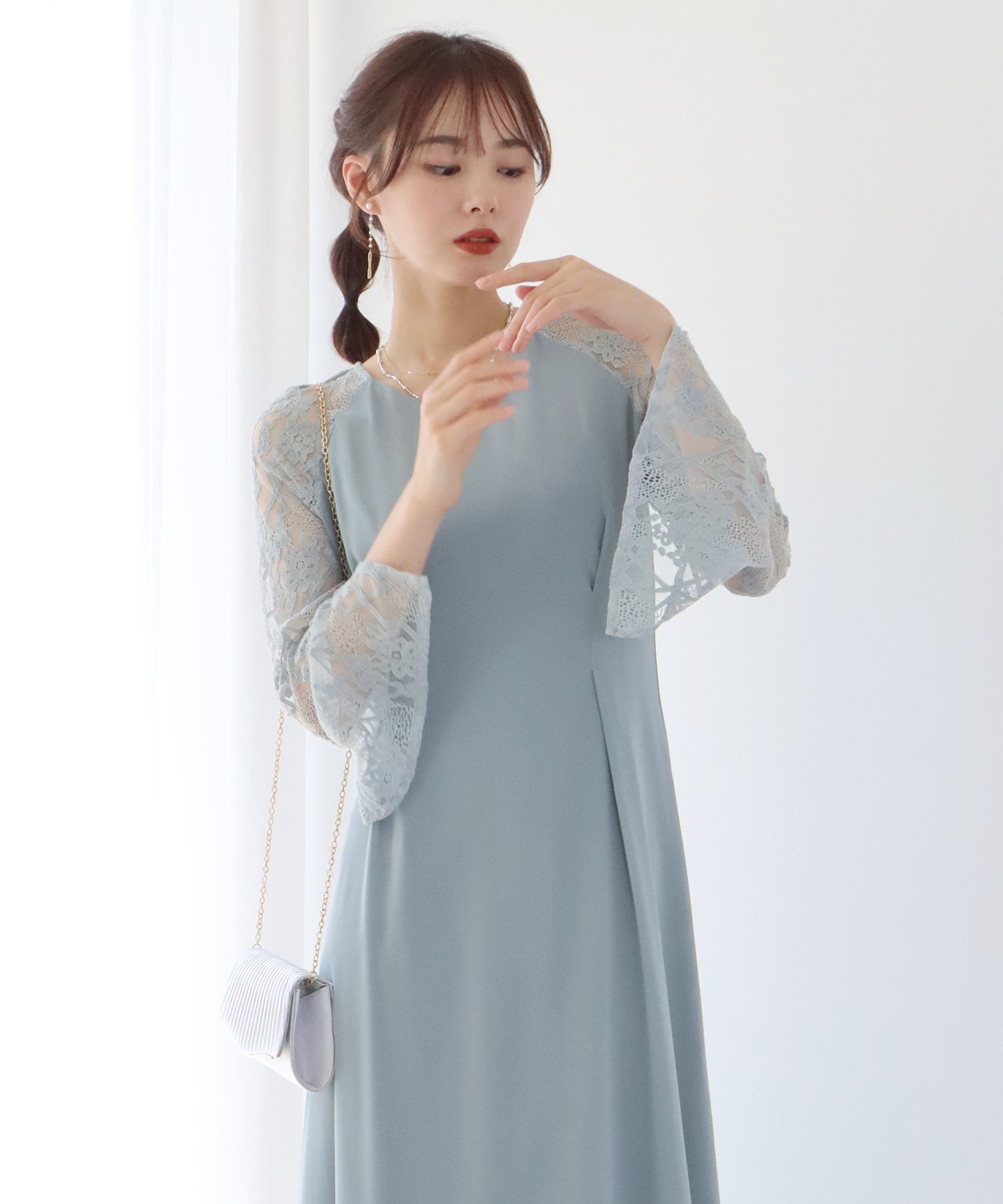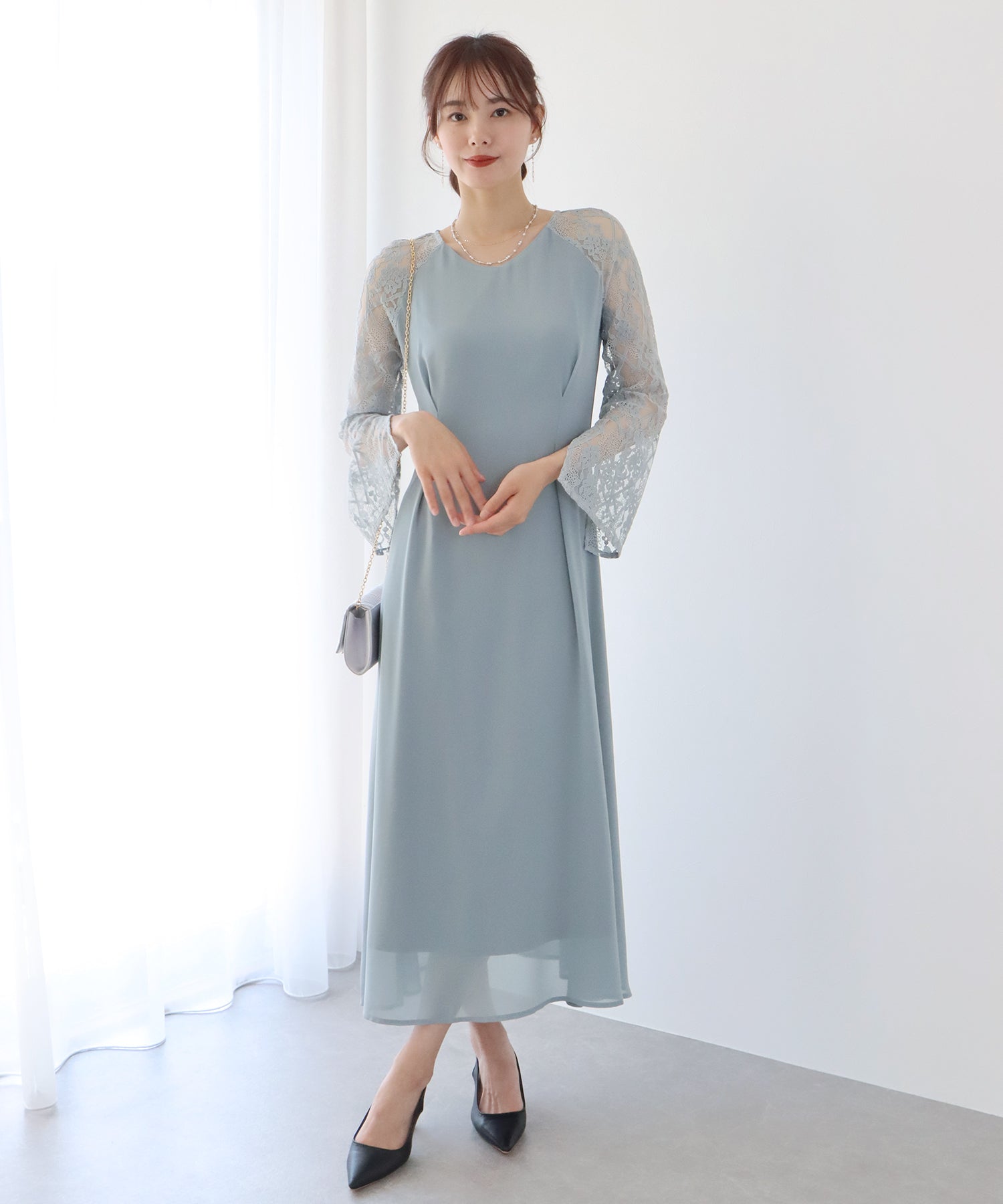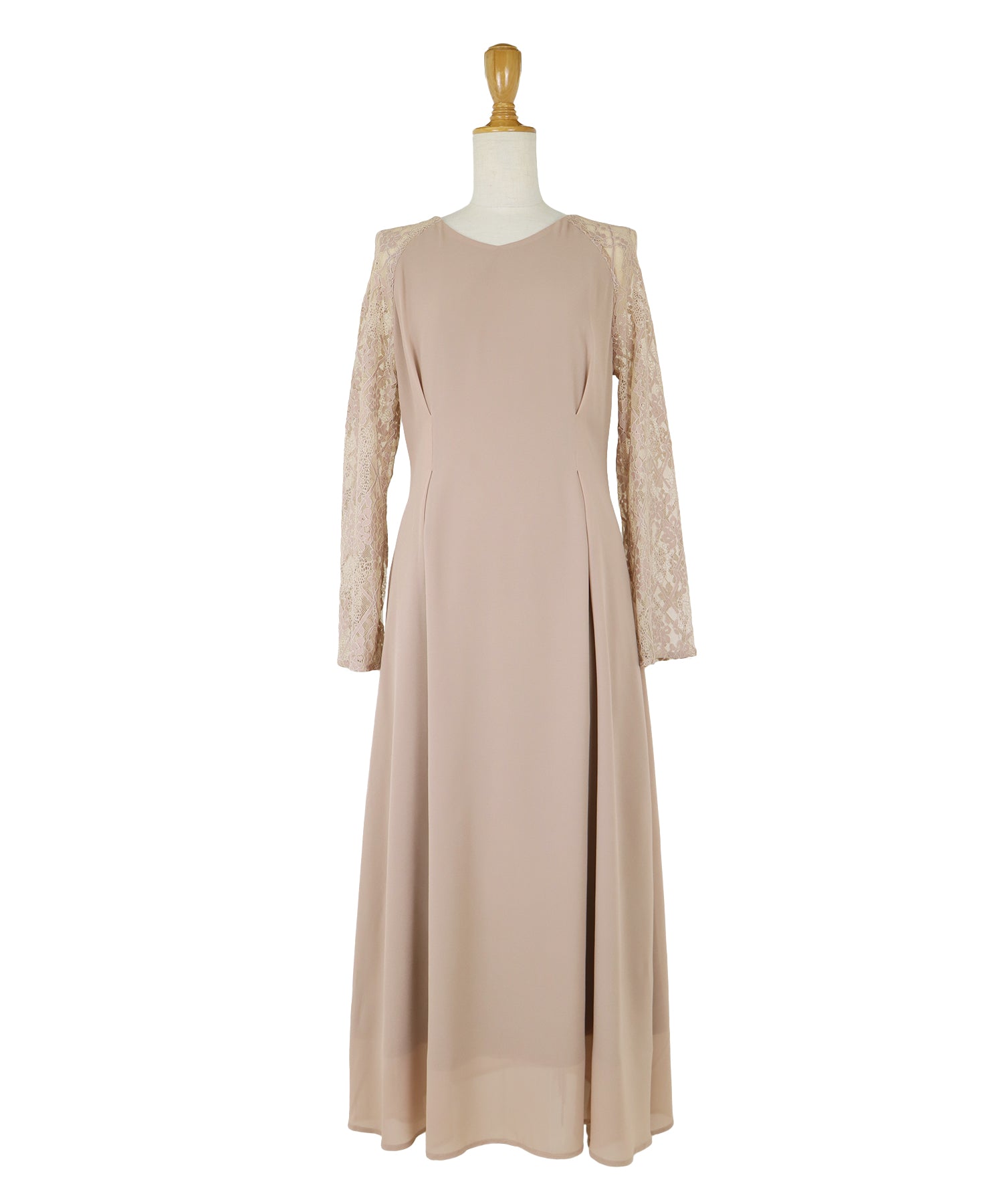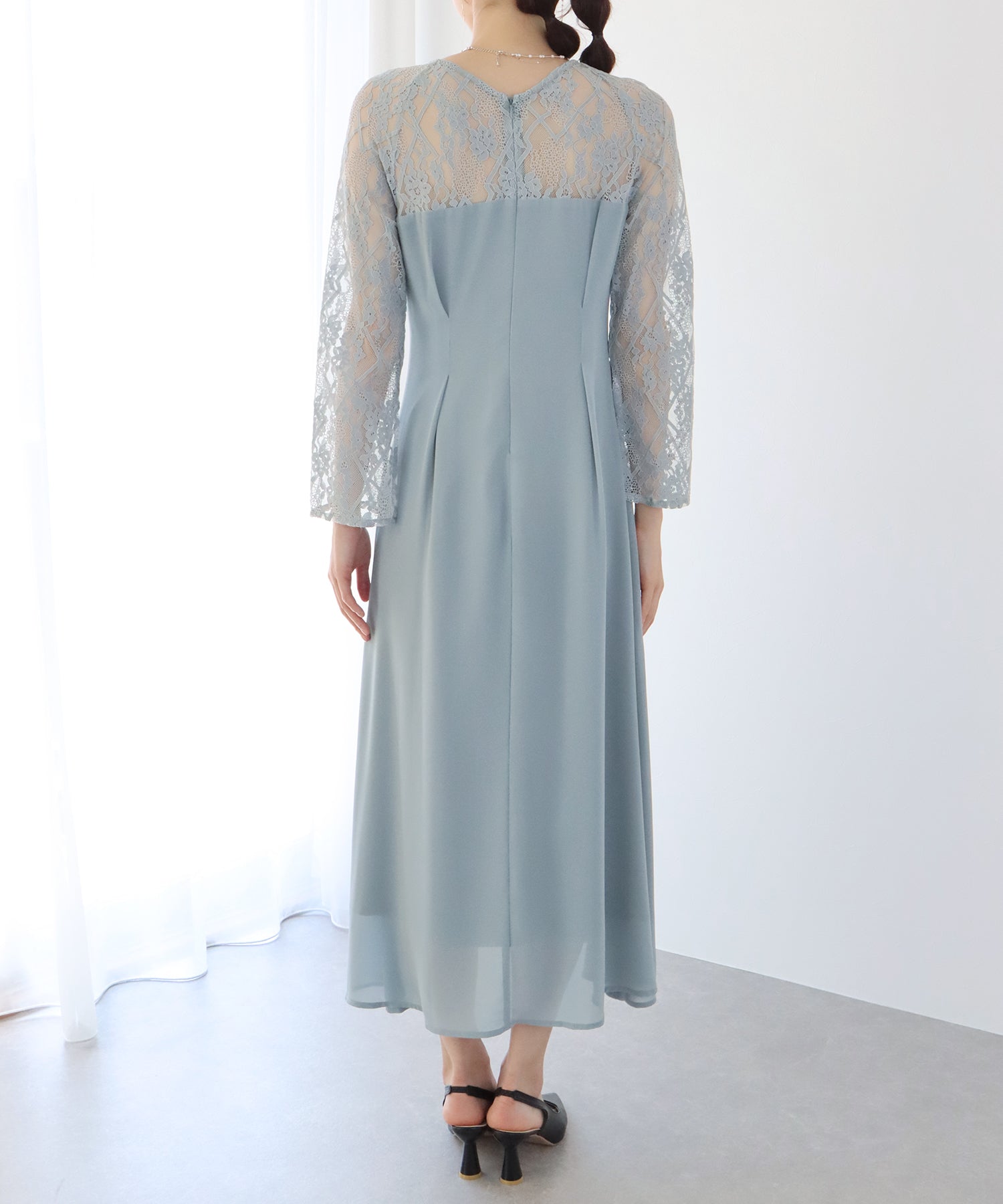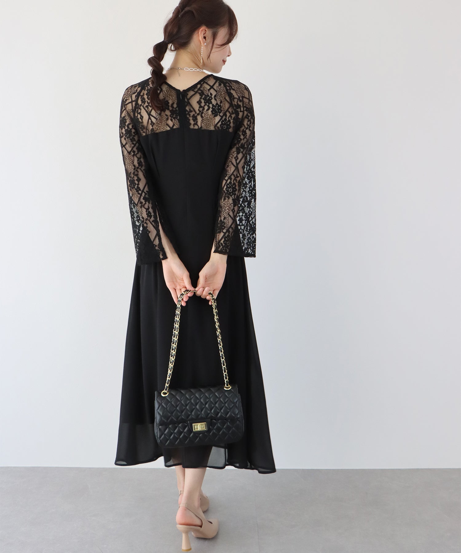 レースと軽やかなシフォン素材を使用したロング丈パーティードレス。