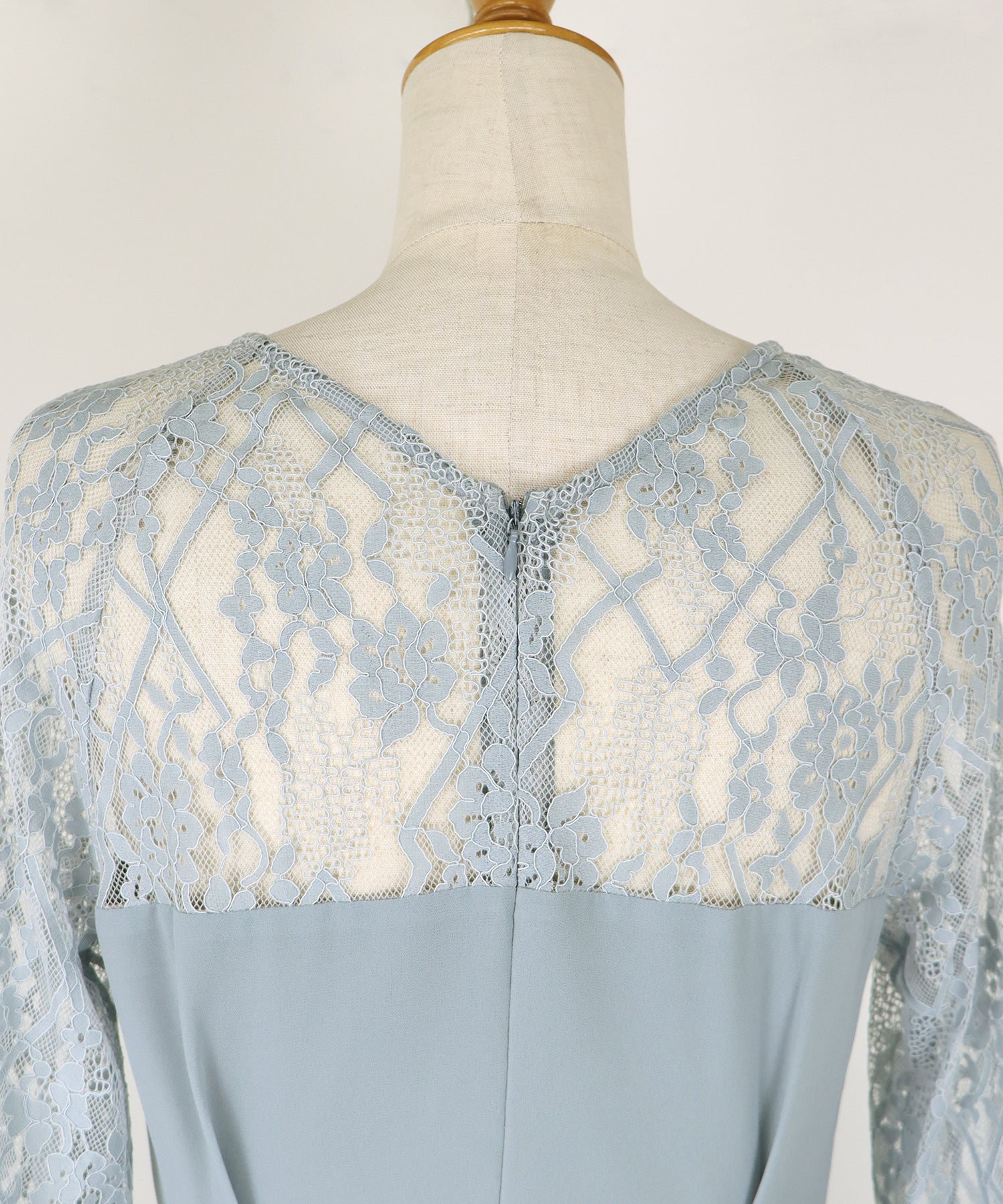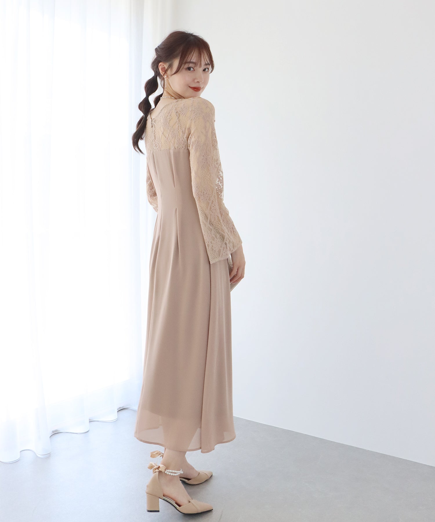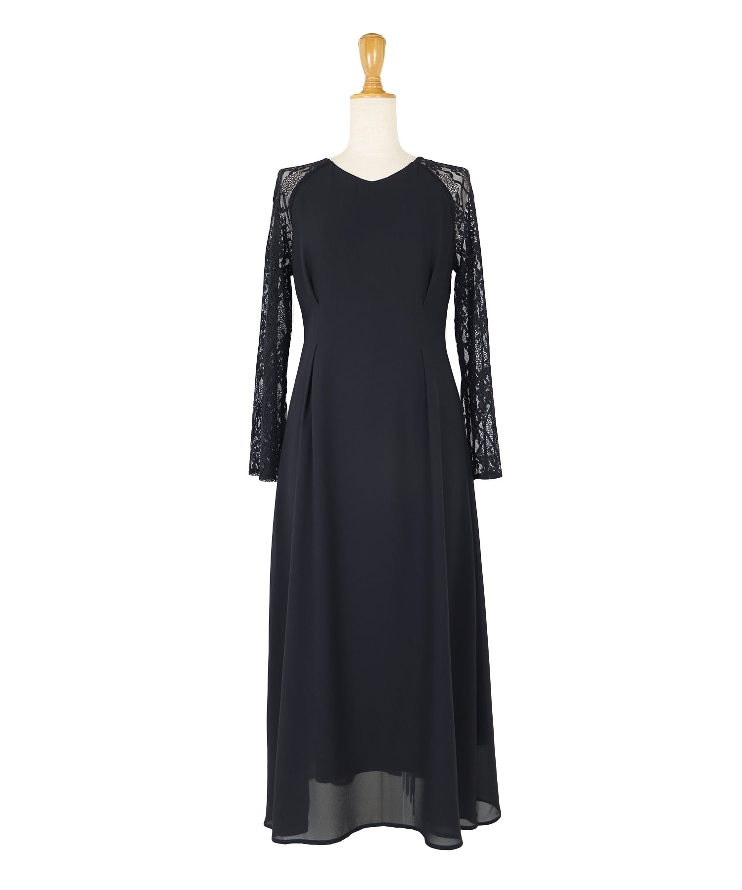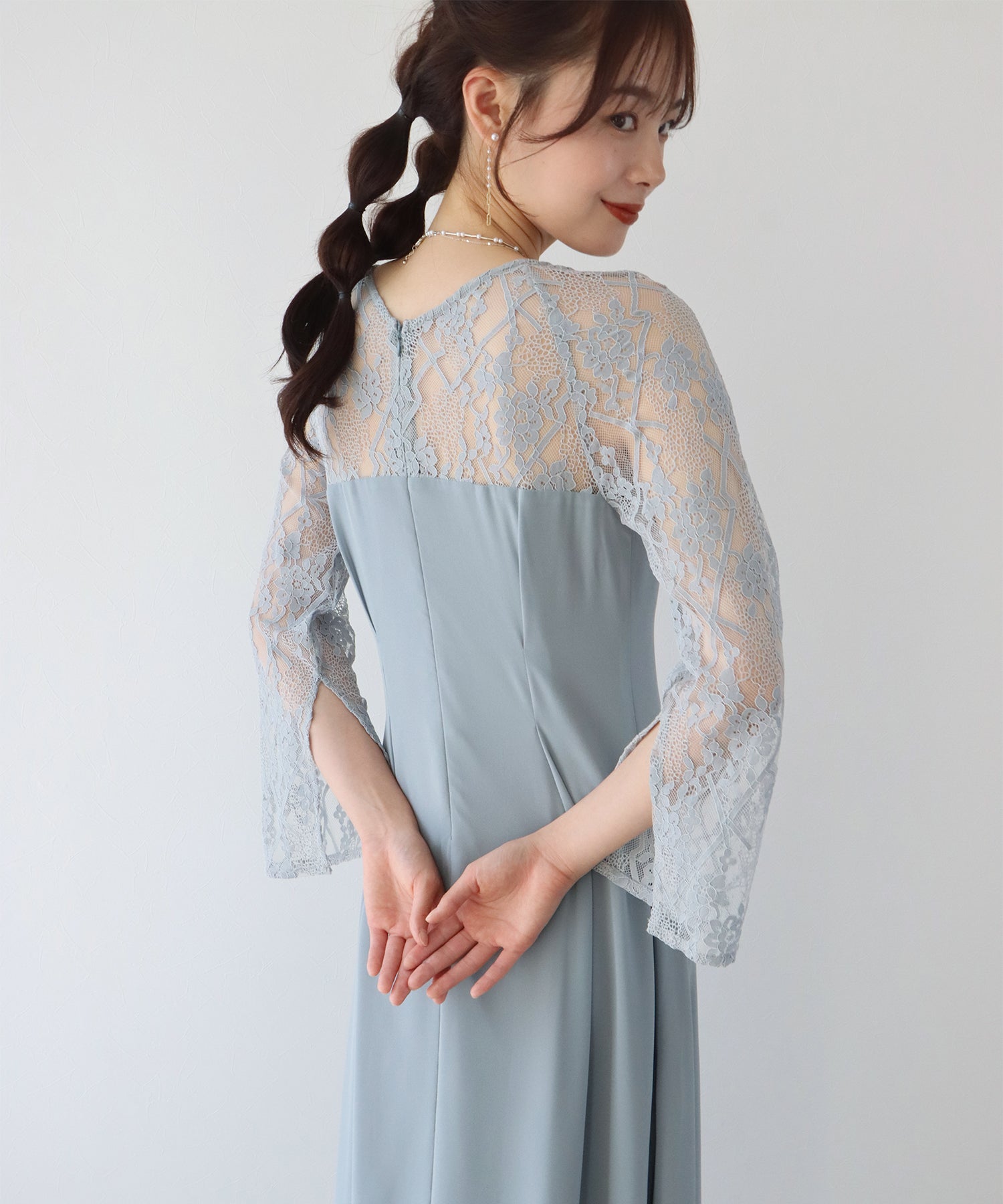 レースと軽やかなシフォン素材を使用したロング丈パーティードレス。
