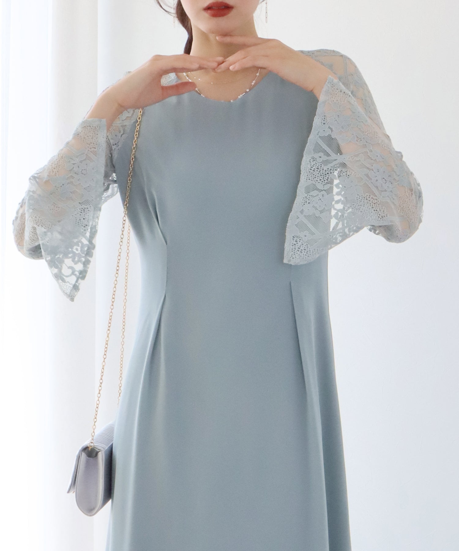 袖の透け感とスカートの揺れ感や程よい開きの前後のVネックなど、女性らしさを高めるディティールにも注目です。