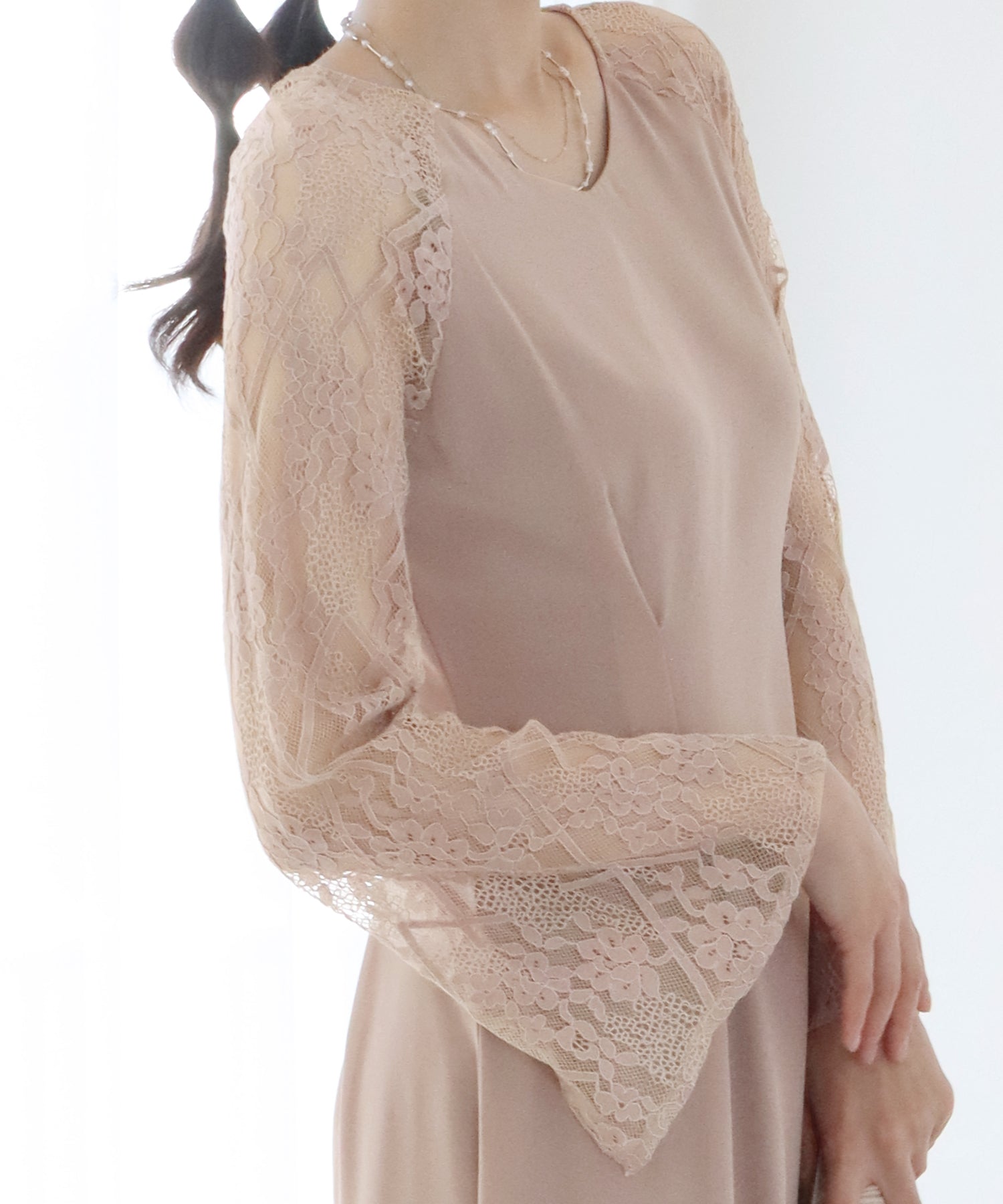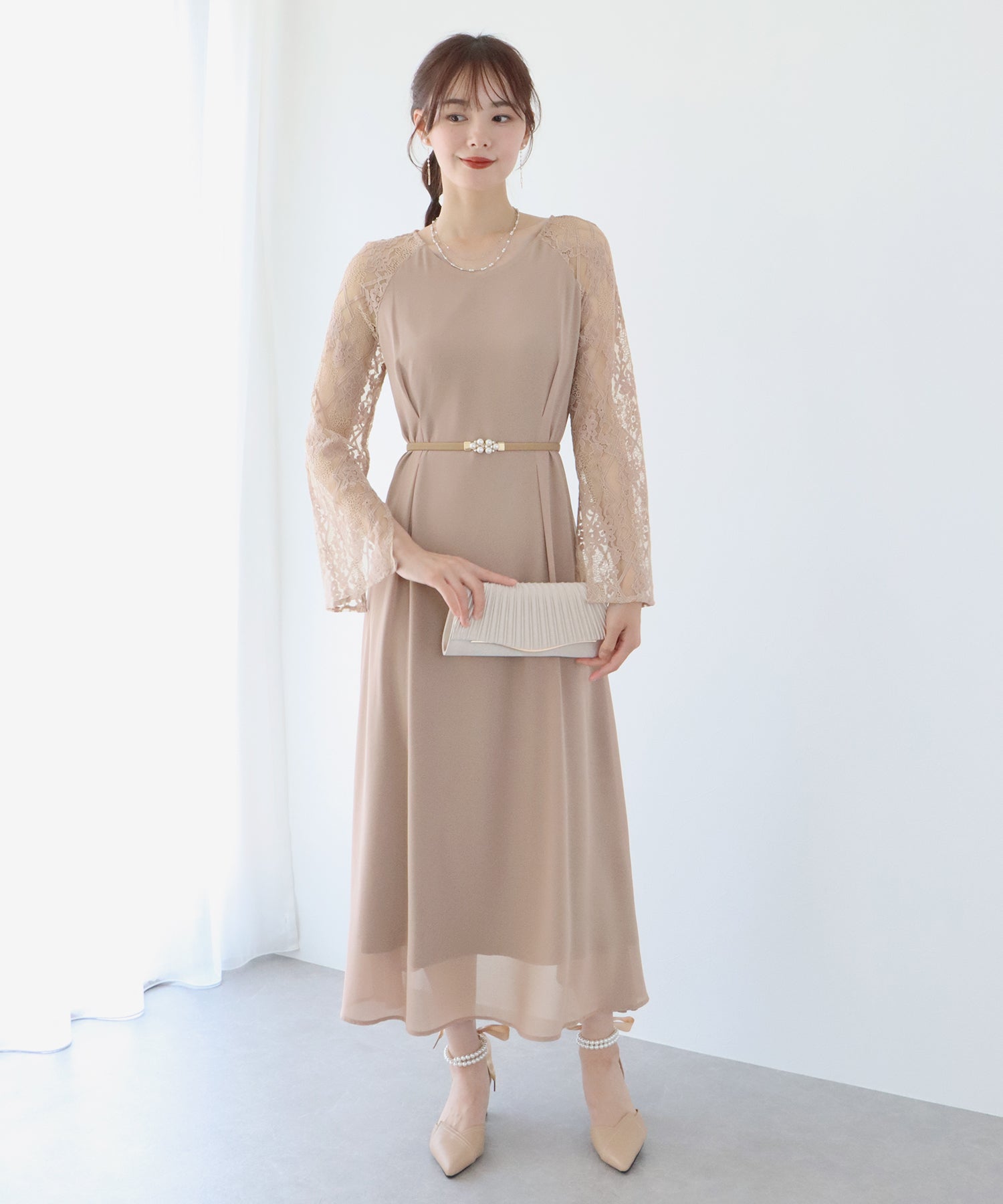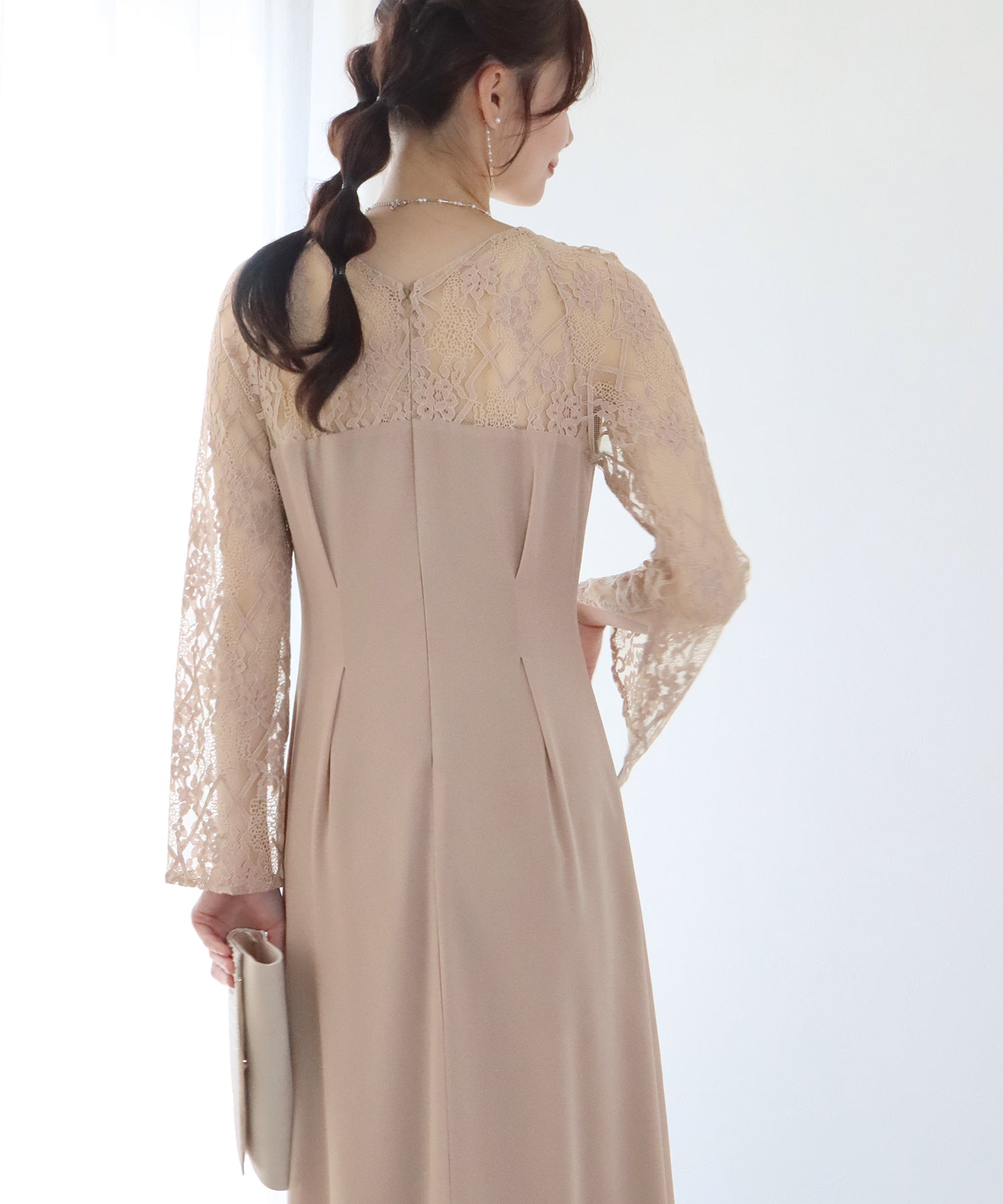 ウエストタックデザインの上品なレース袖パーティーワンピース?結婚式ワンピース