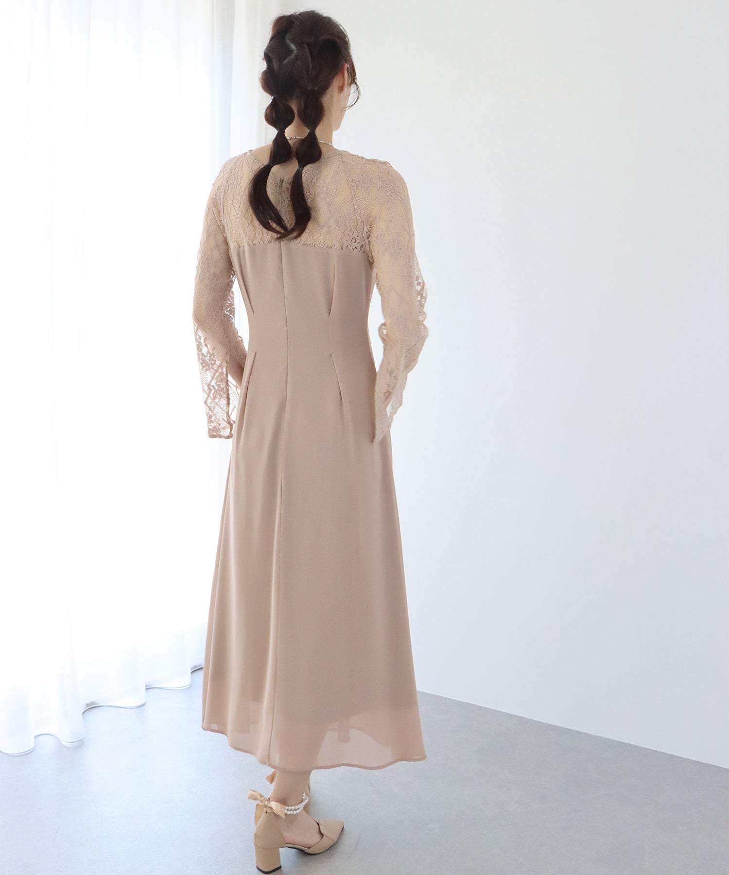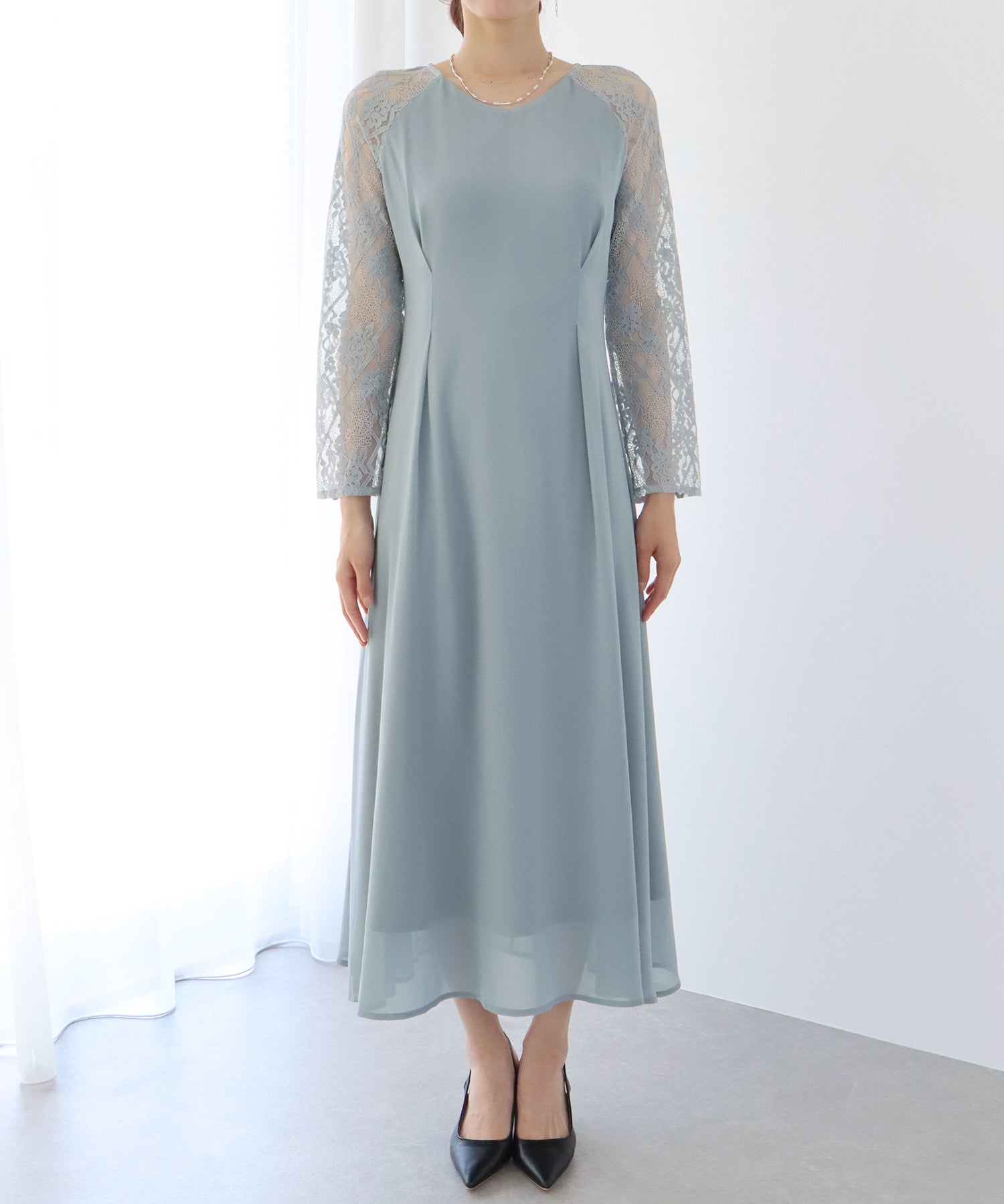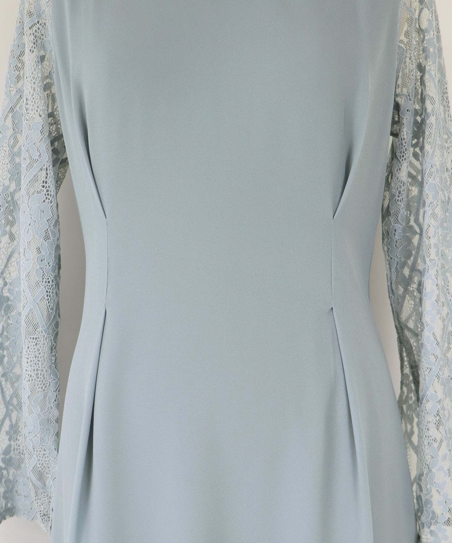 ウエストタックデザインの上品なレース袖パーティーワンピース?結婚式ワンピース