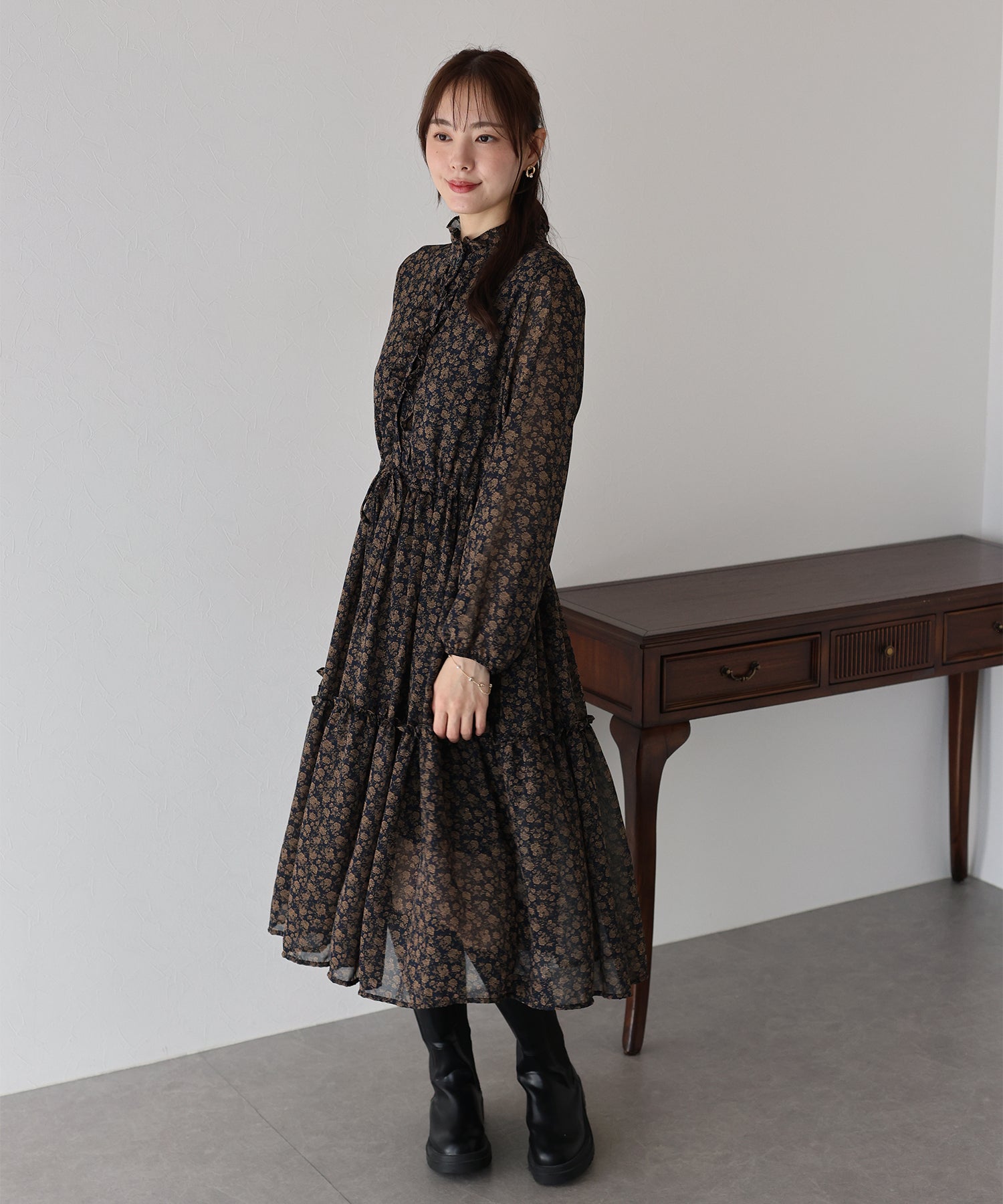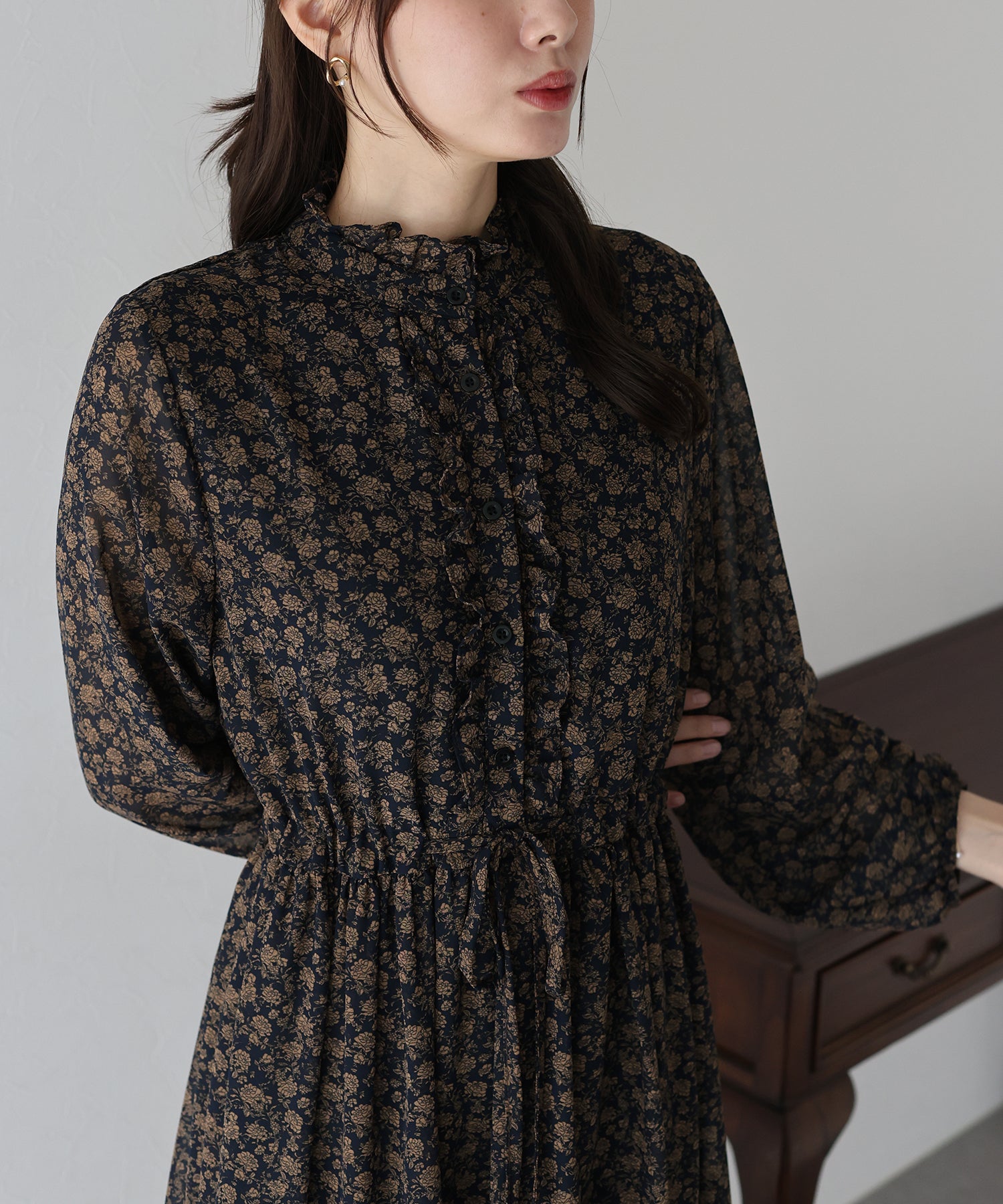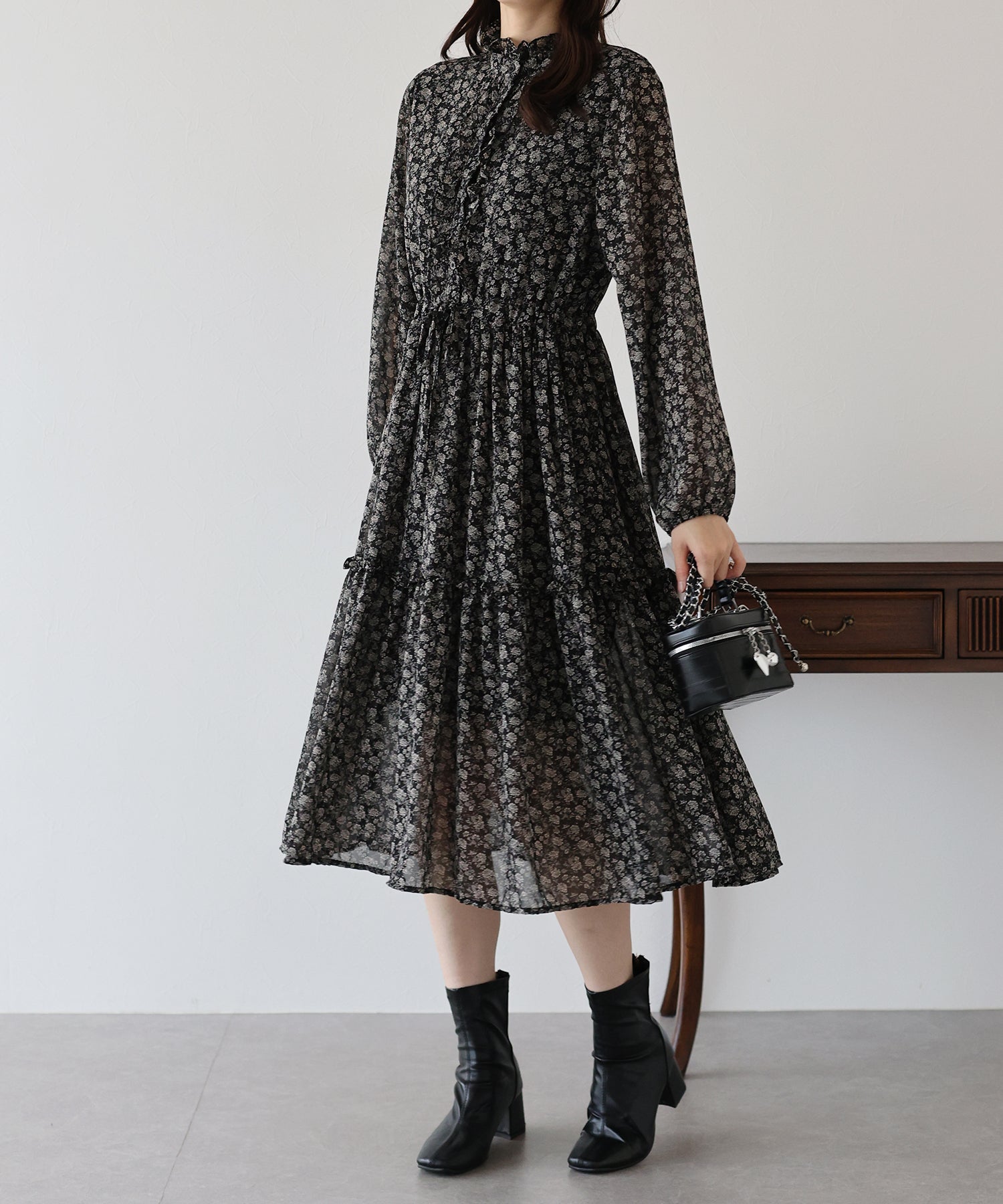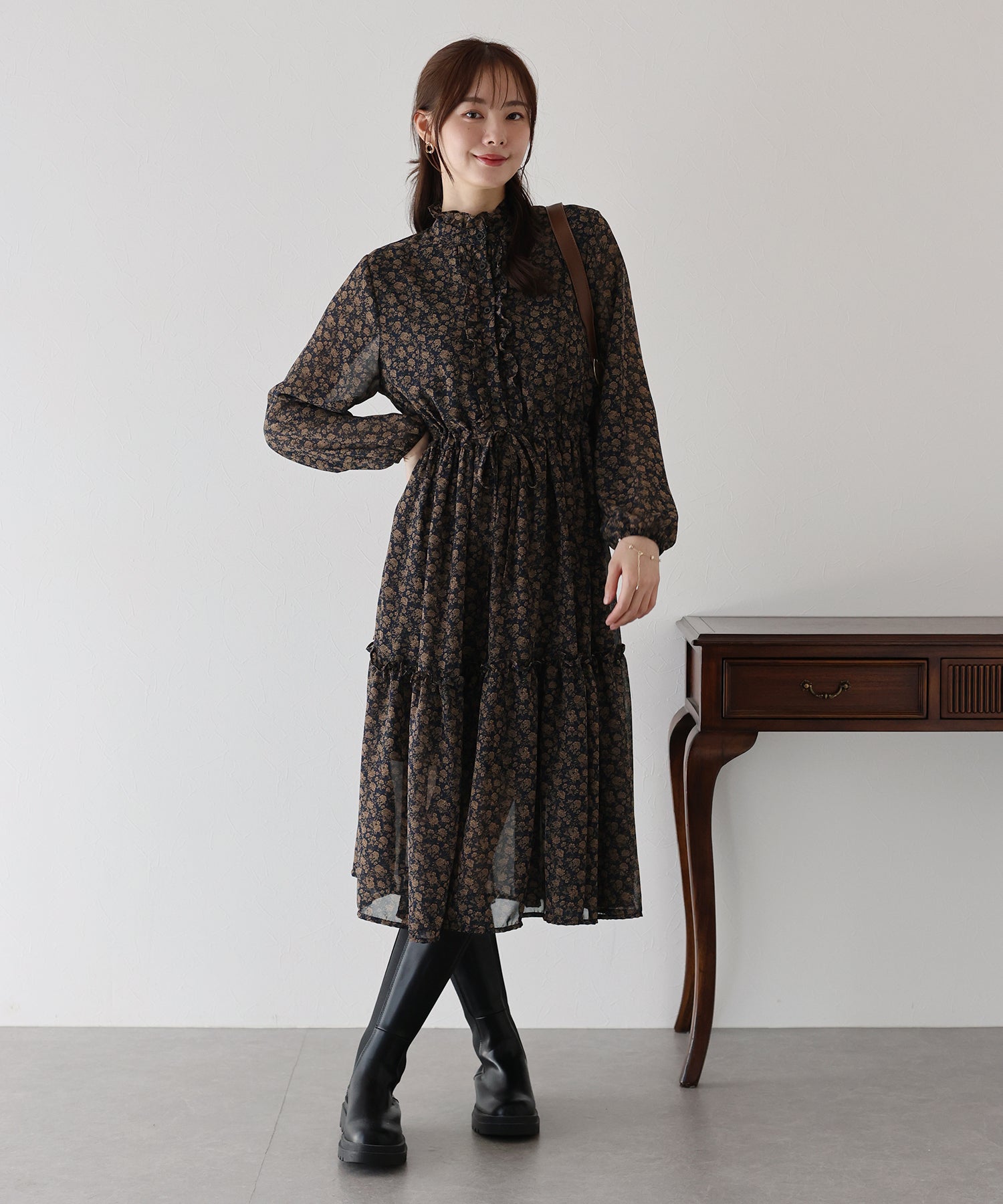 さりげないフリルが華やかで大人な可愛い花柄ワンピース