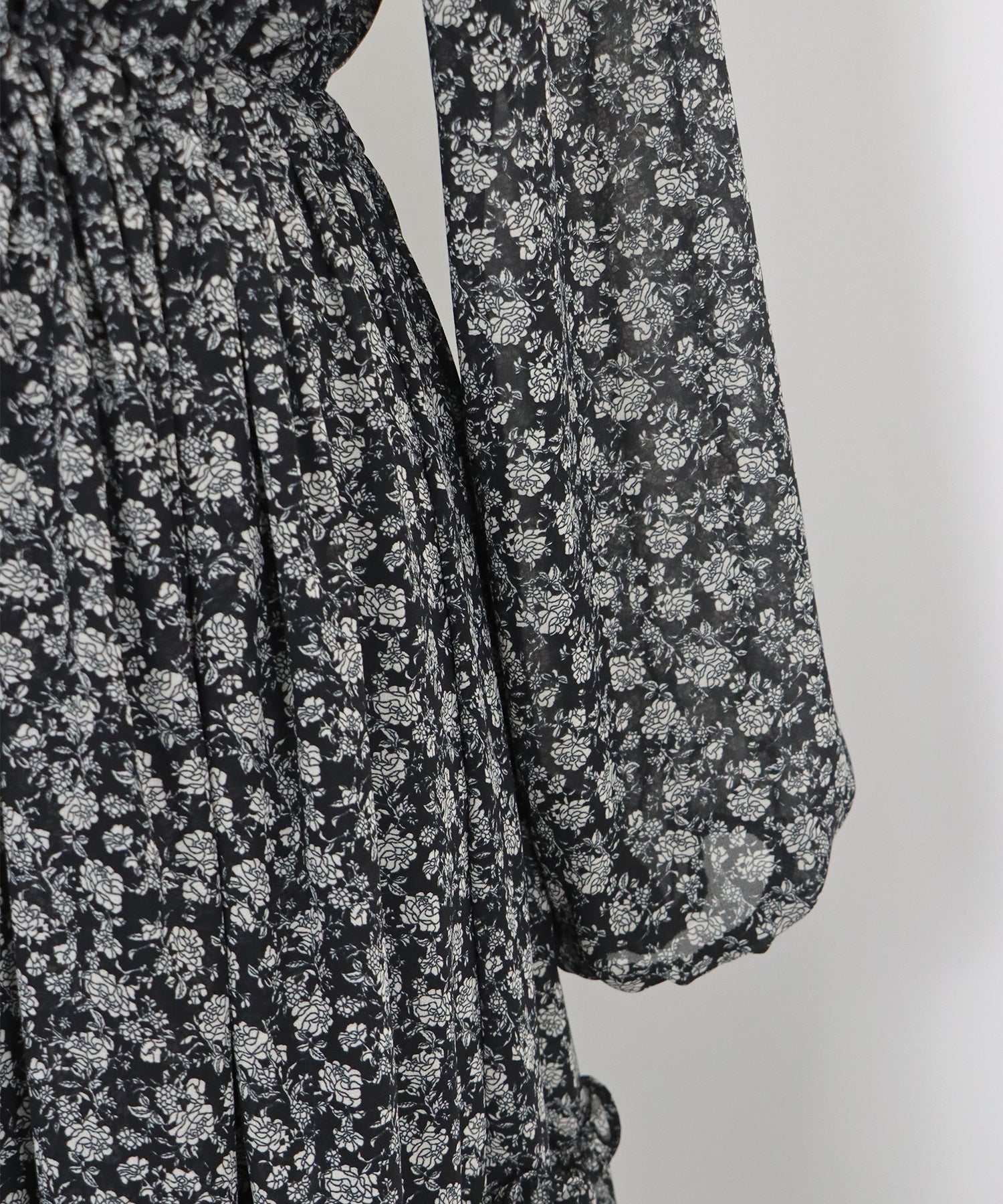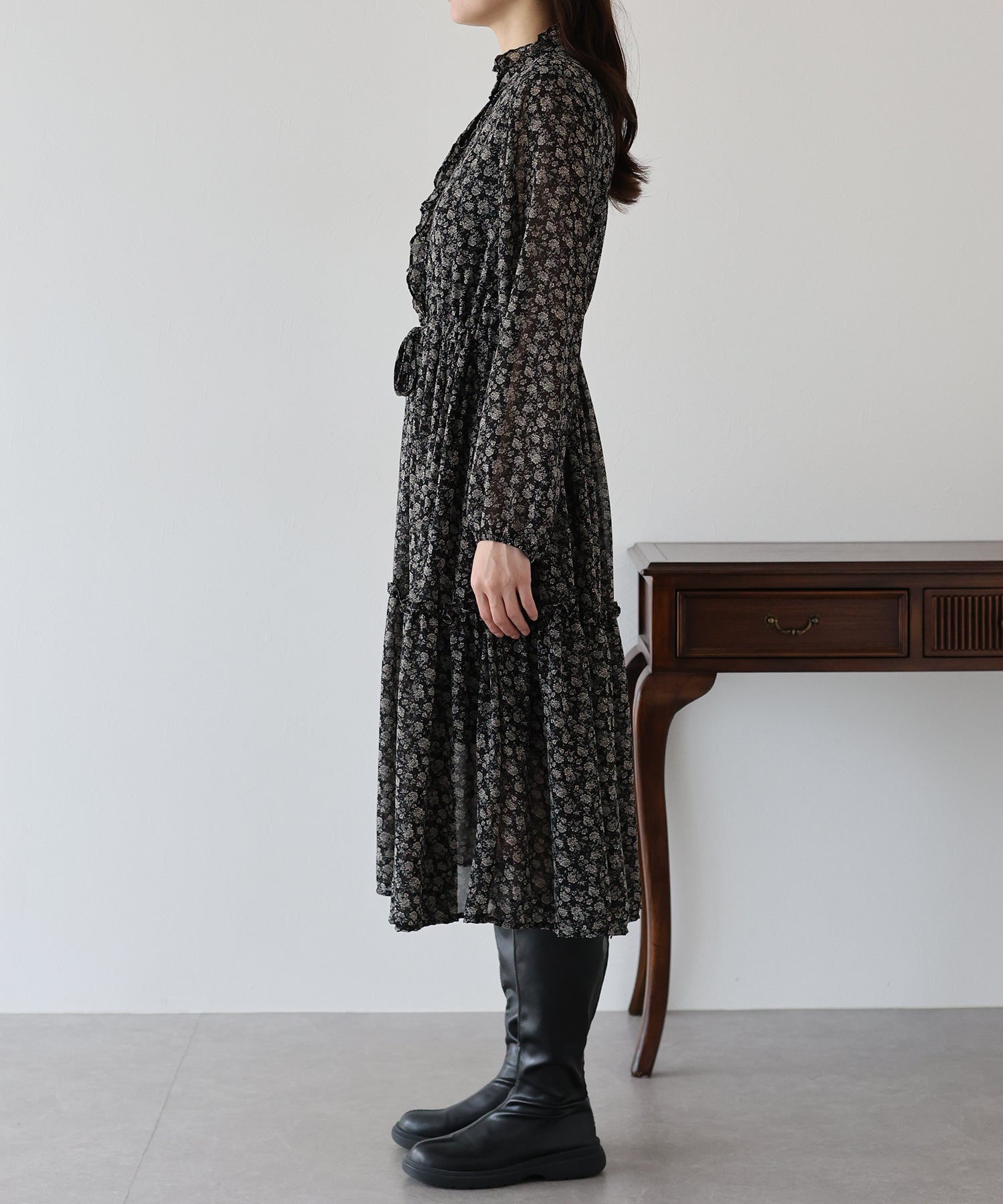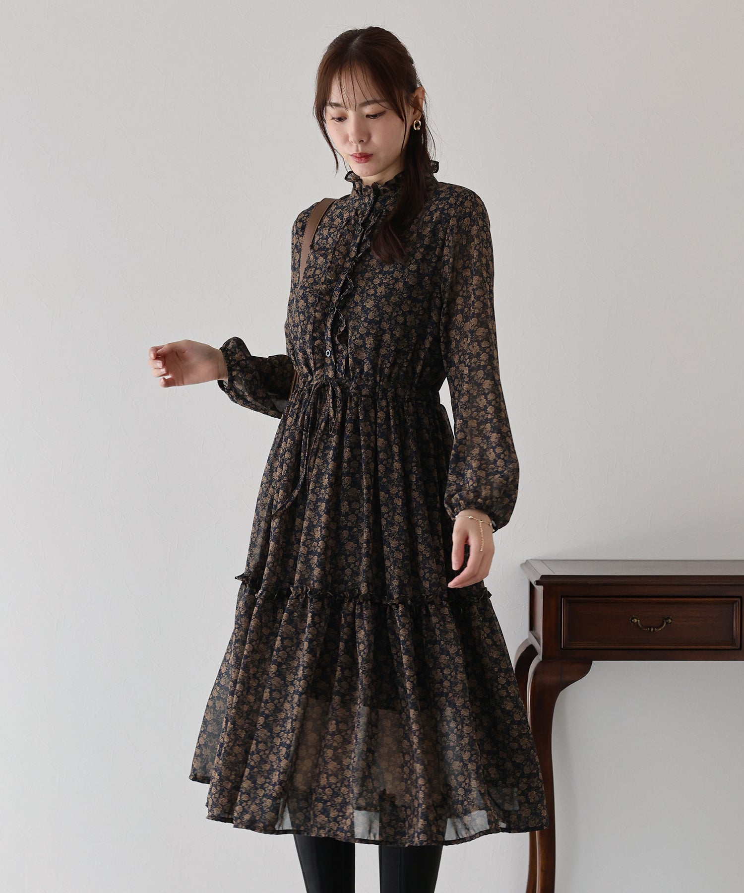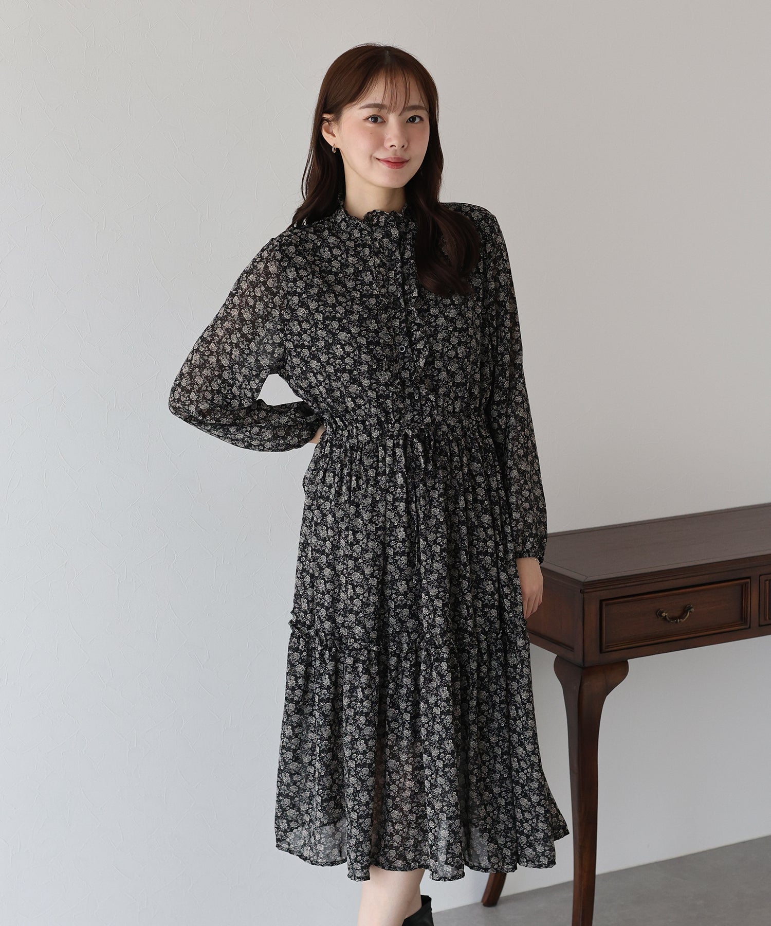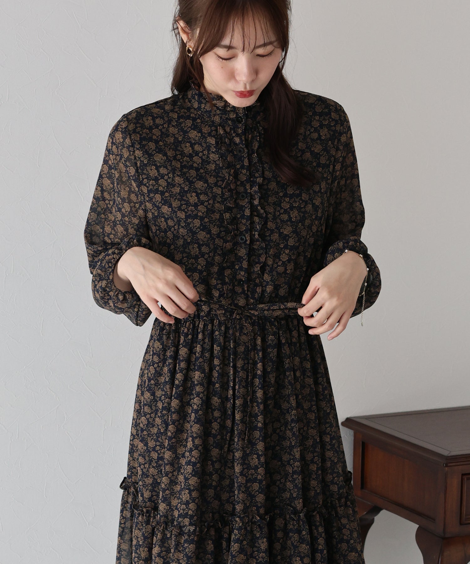 さりげないフリルが華やかで大人な可愛い花柄ワンピース