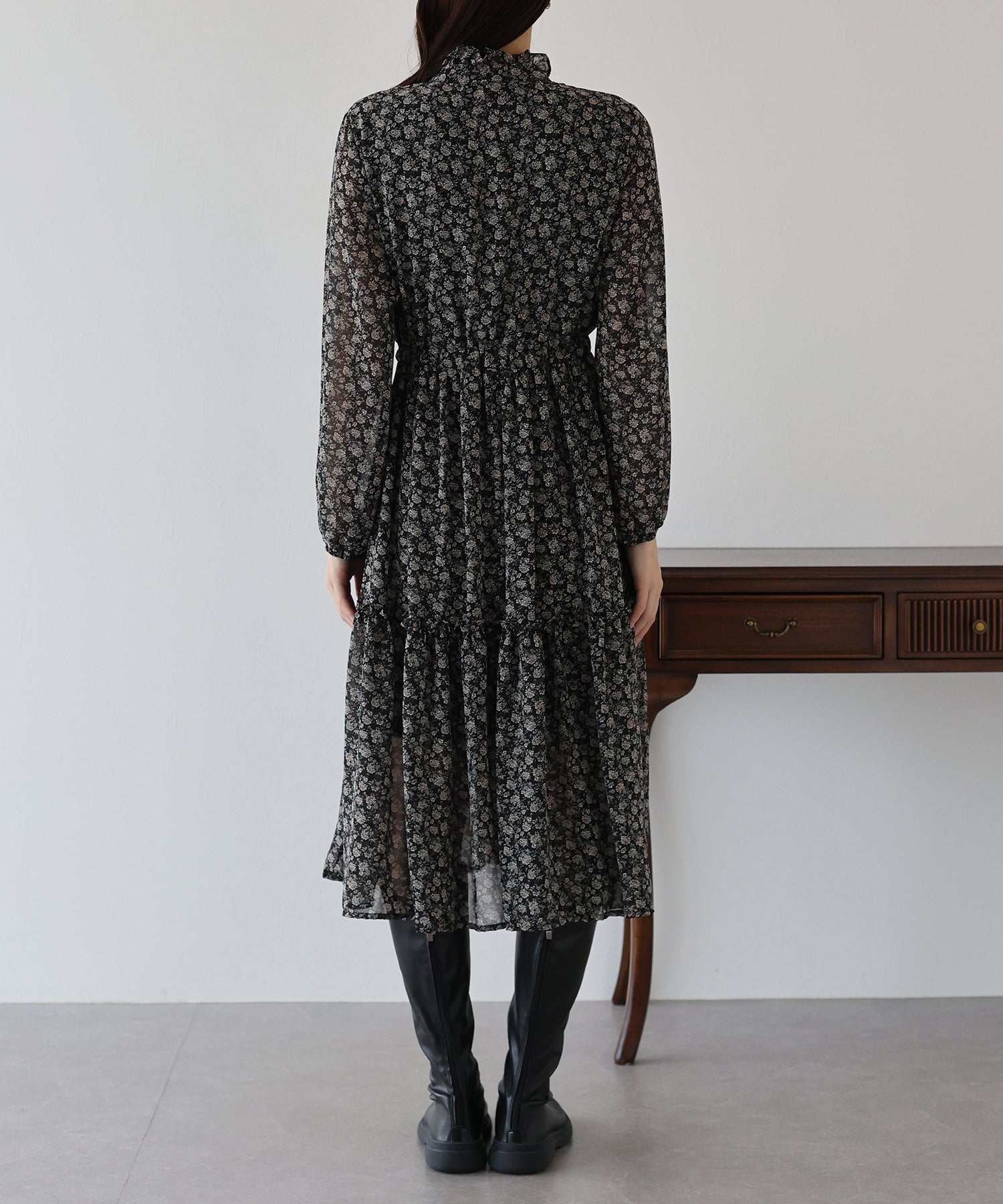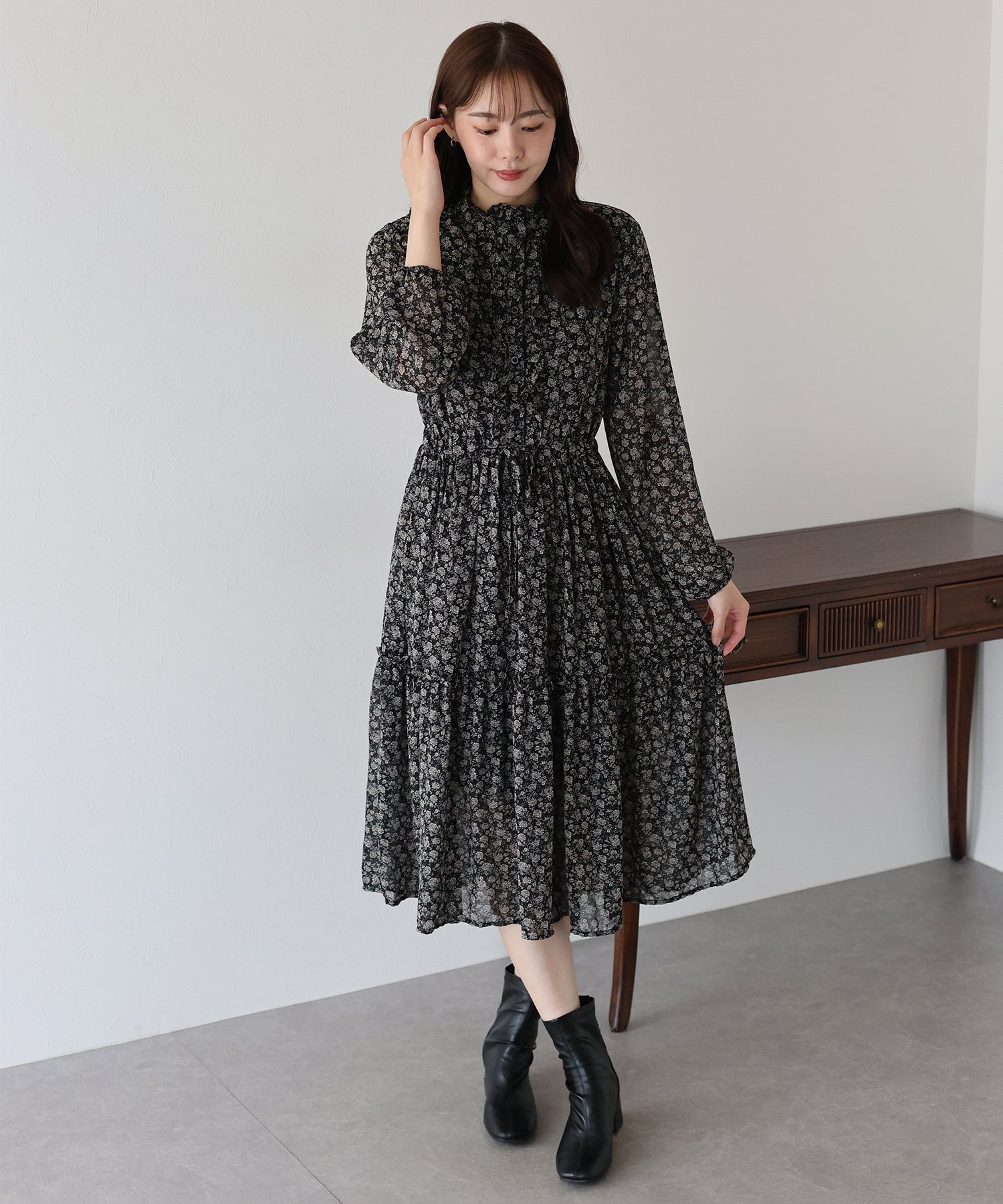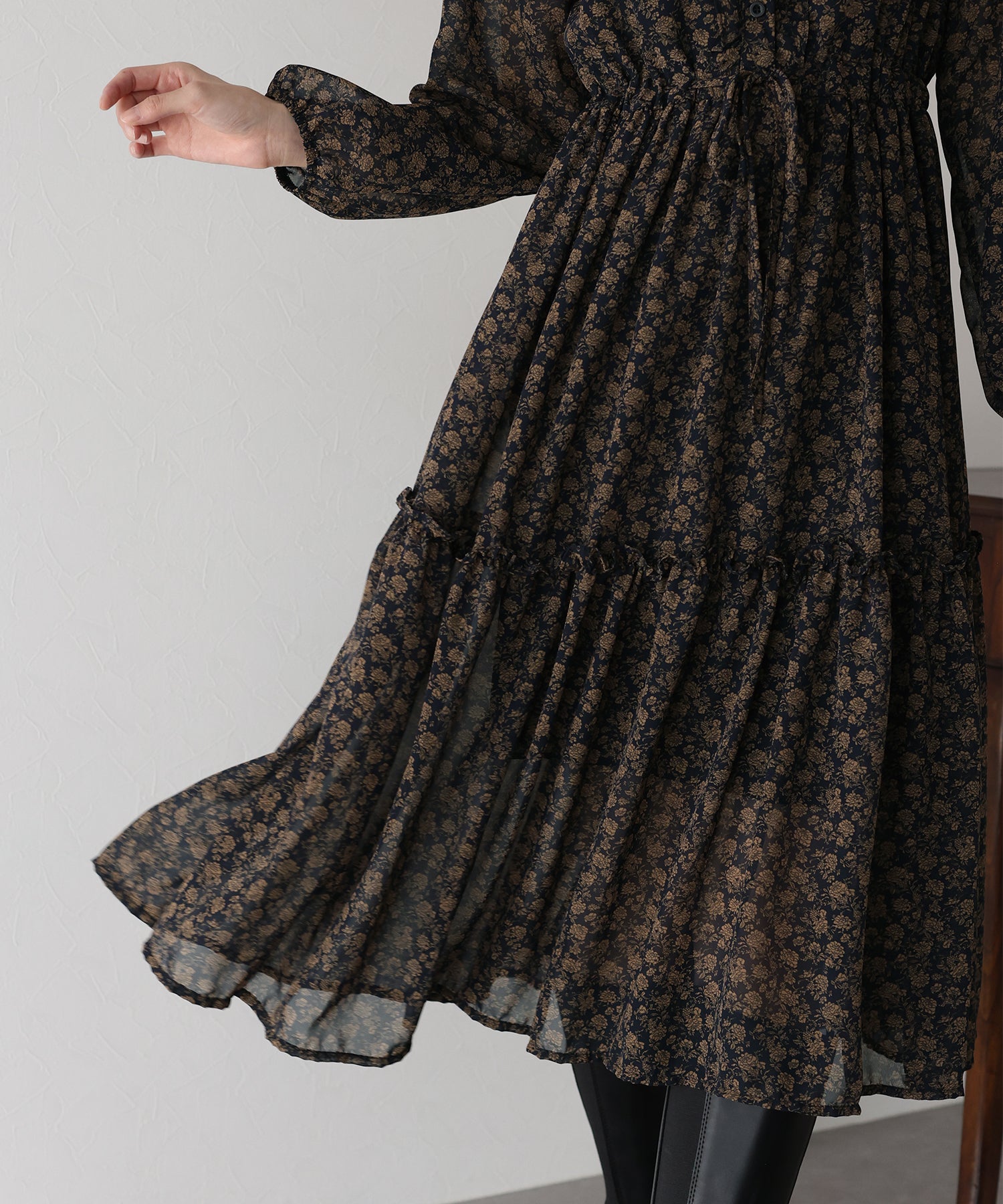 ティアードスカートが歩く度にふわっと広がり、ロマンティックなシルエットを作り出します。