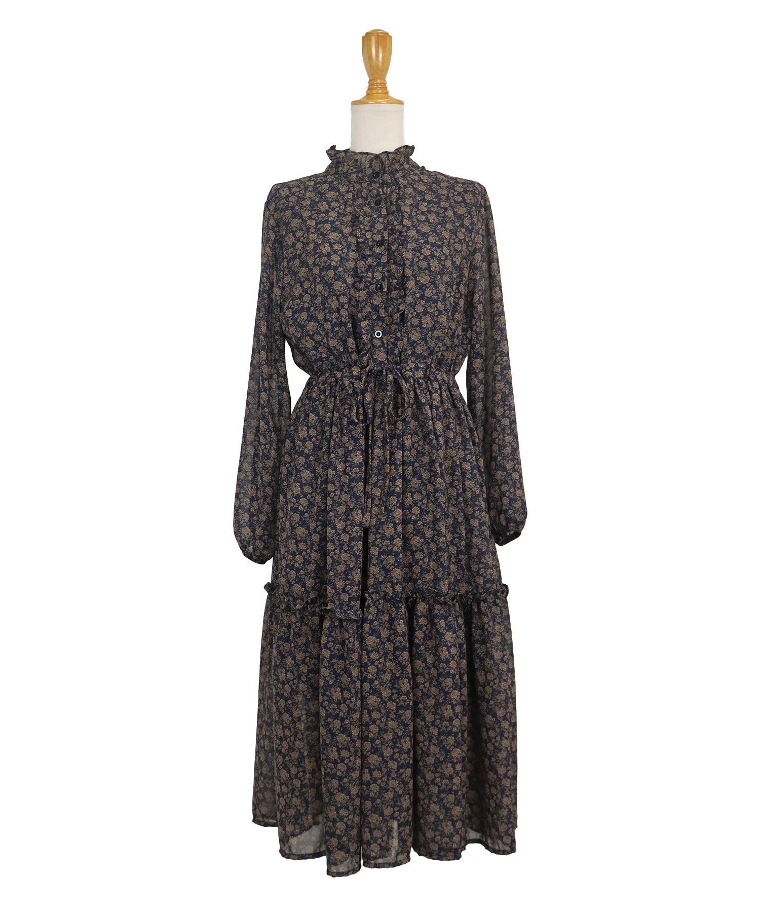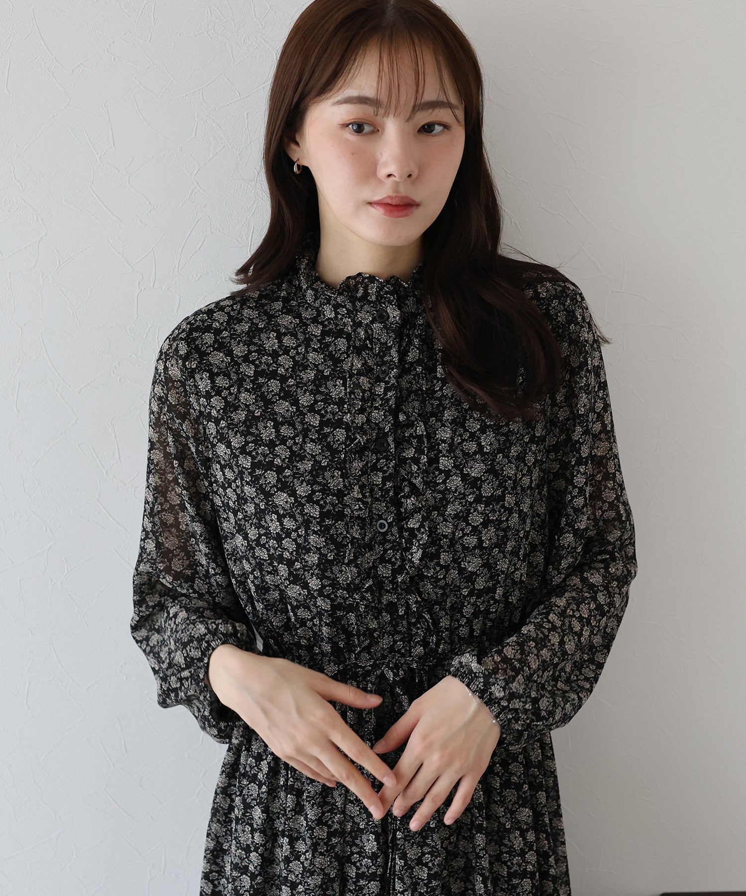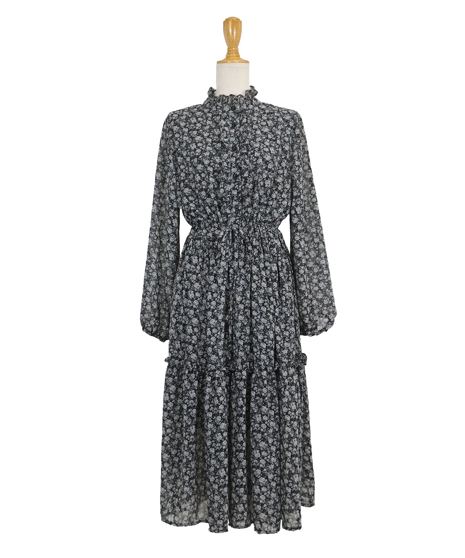 ネックと前立て?スカートに施した控えめなフリルがかわいらしさをプラスするフラワープリントワンピース。