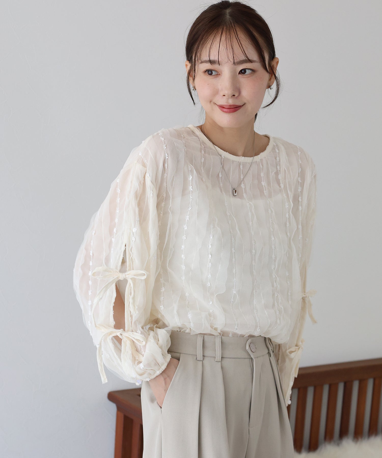 袖のスリットにリボンをあしらった、シアーチュールトップス。