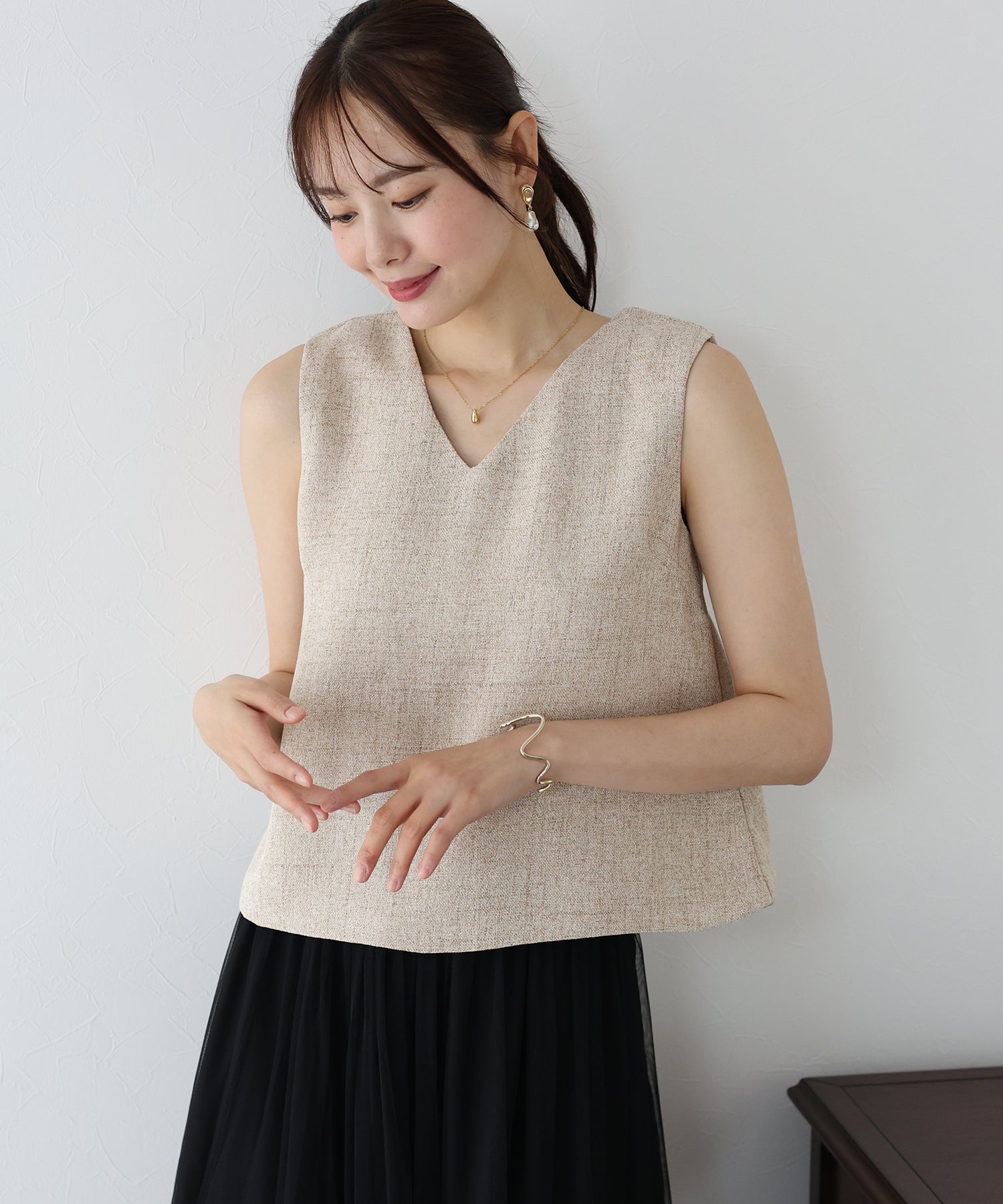 暑い夏に重宝するVネックトップス ?POINT 夏にぴったりな清涼感のあるリネン風素材を使用したVネックトップスです。 程よくAラインに広がるシルエットで体型を自然にカバーし、Vネックで首元をスッキリと見せます。 暑い時期でも快適に着られるノースリーブは大人の女性にぴったり。